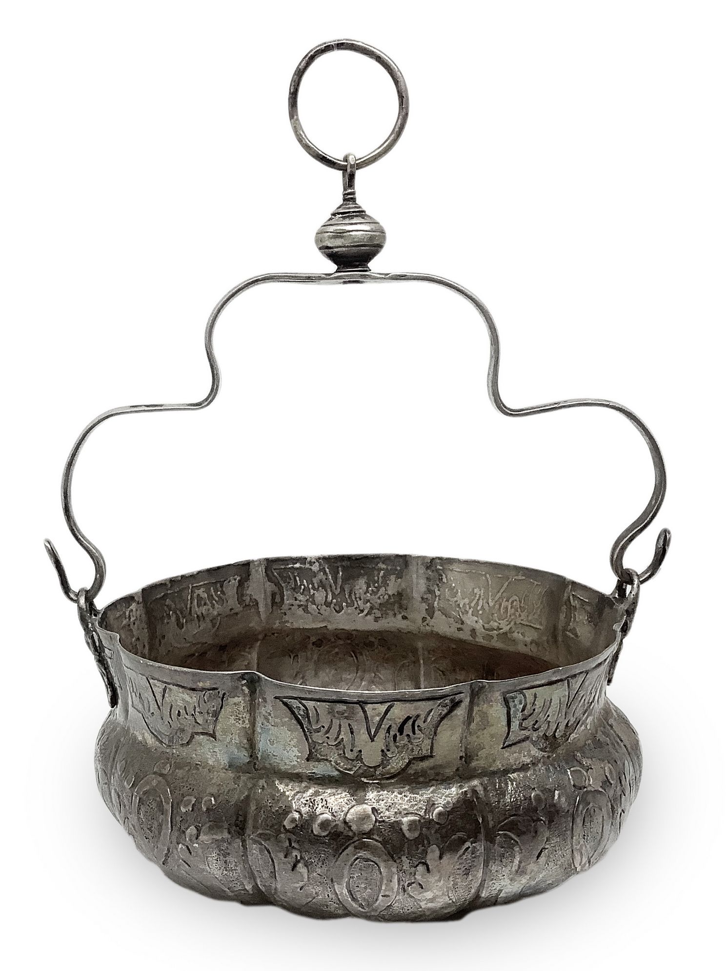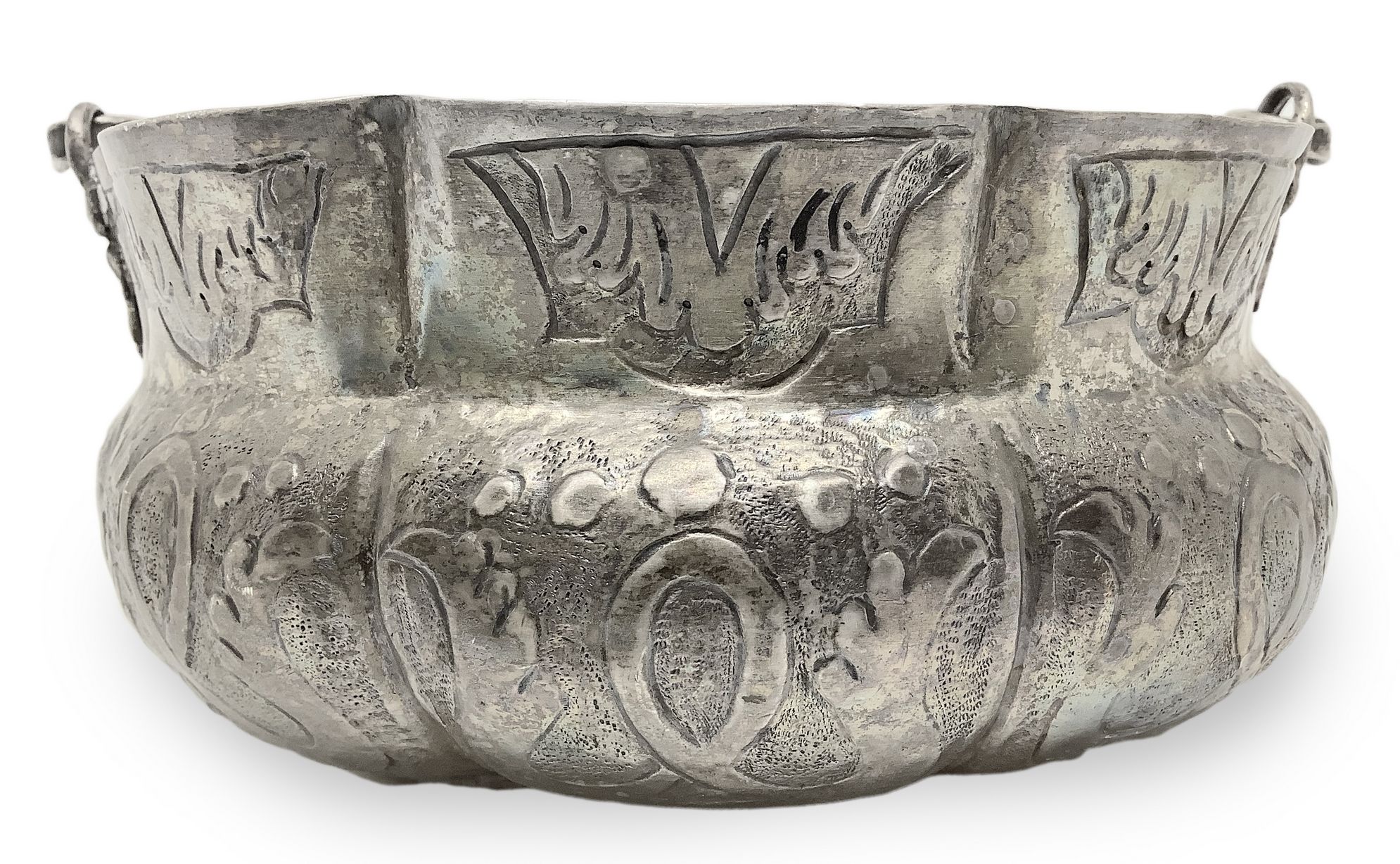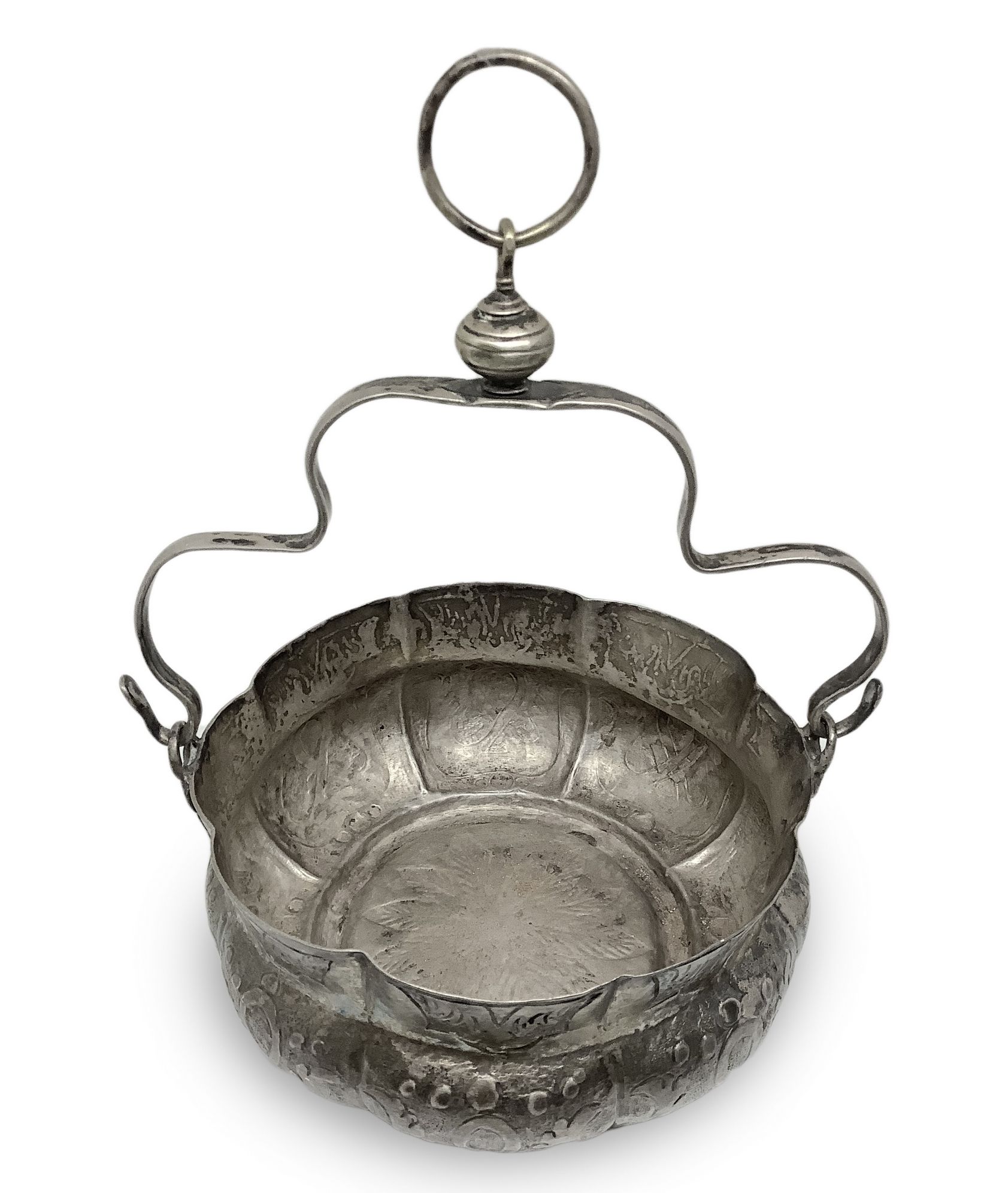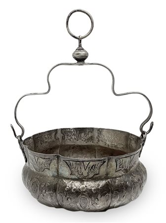 Secchiello in argento sbalzato a mano. H cm 7. Diametro cm 16, con manico cm 22.