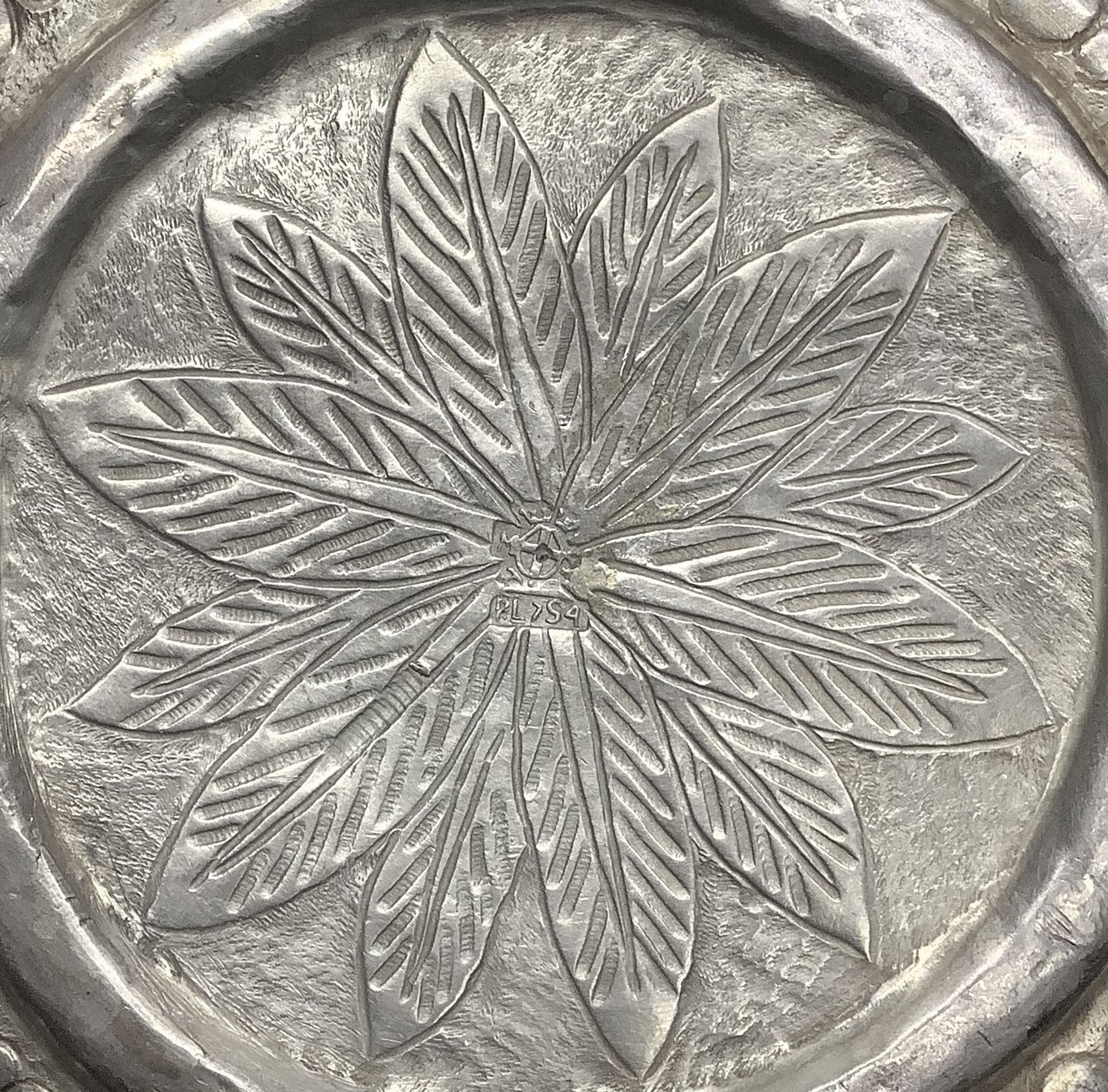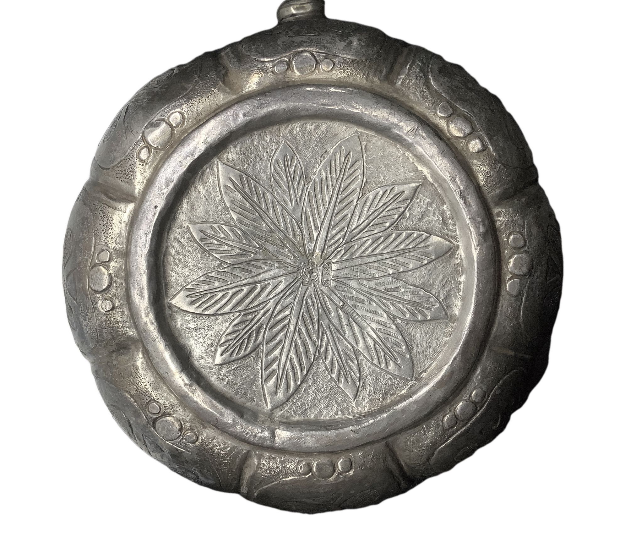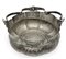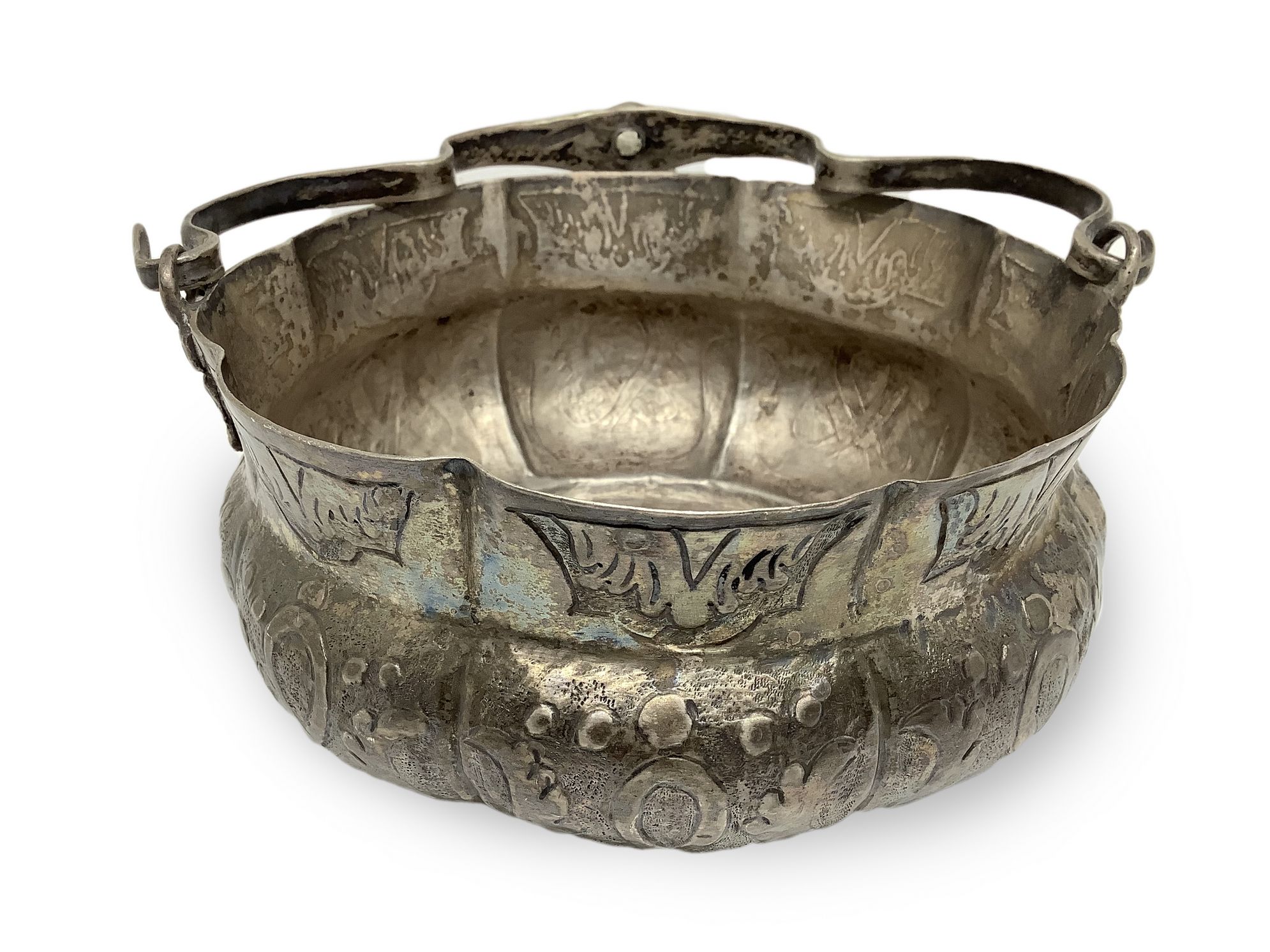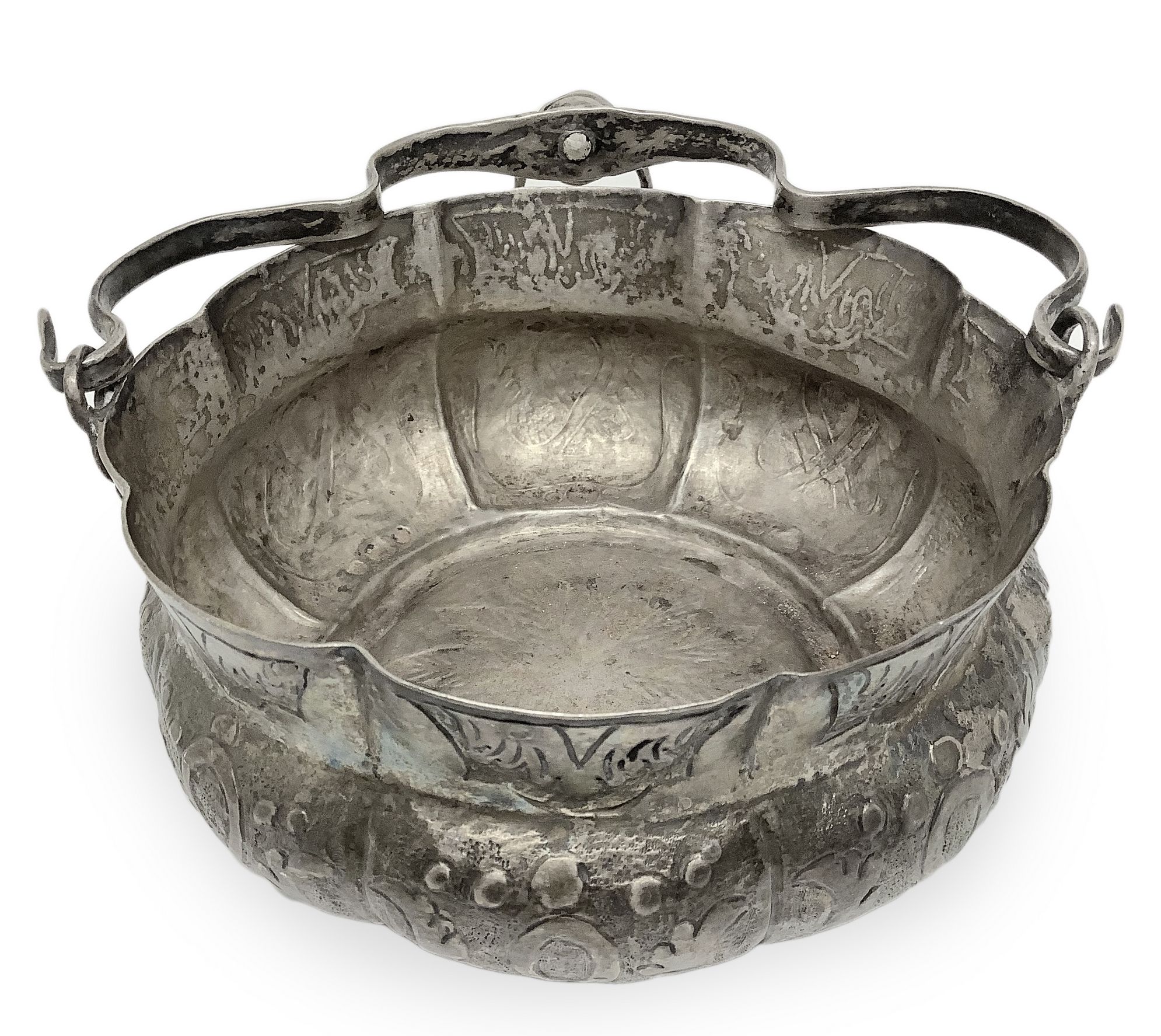 Secchiello in argento sbalzato a mano. H cm 7. Diametro cm 16, con manico cm 22.