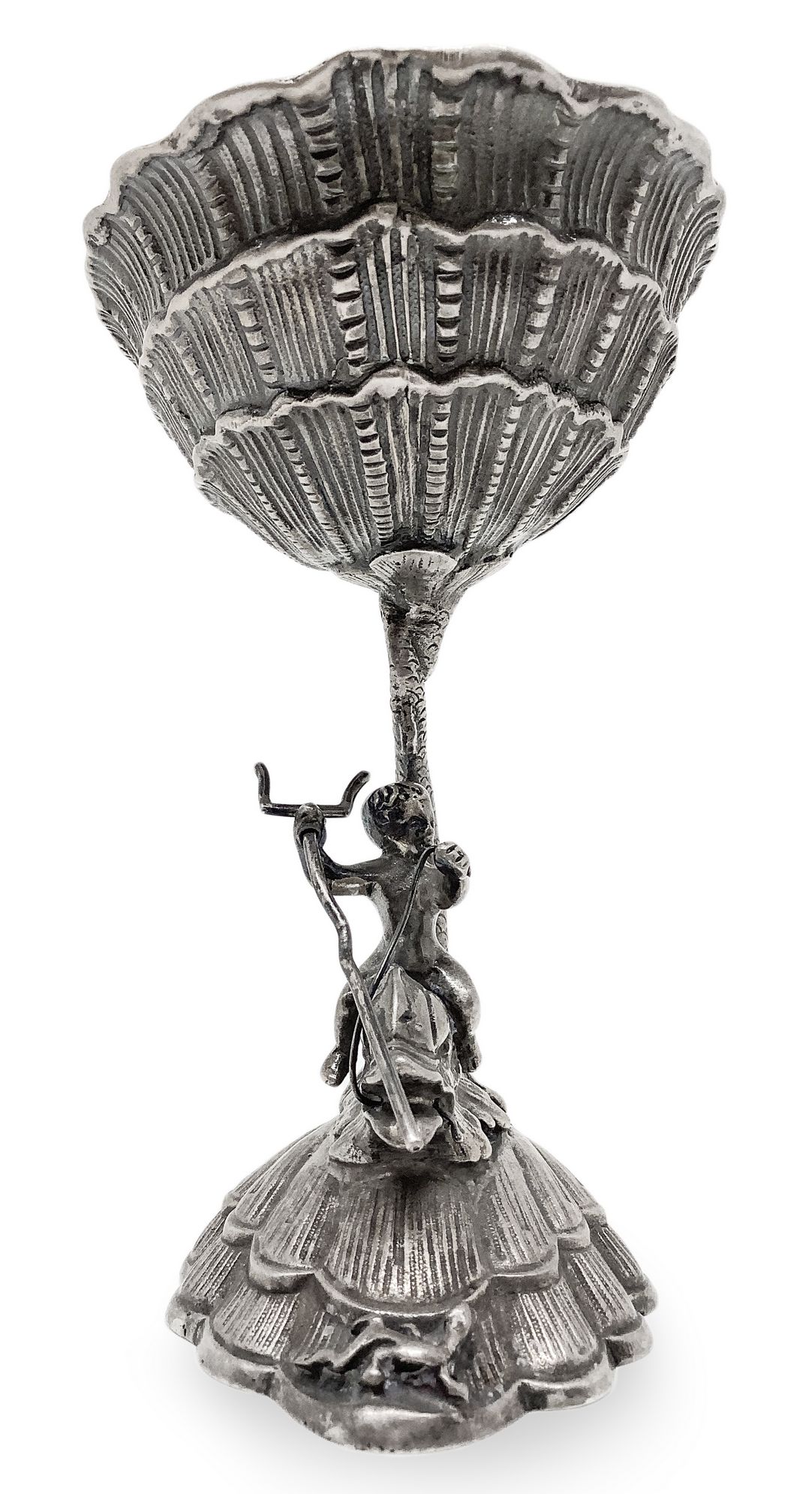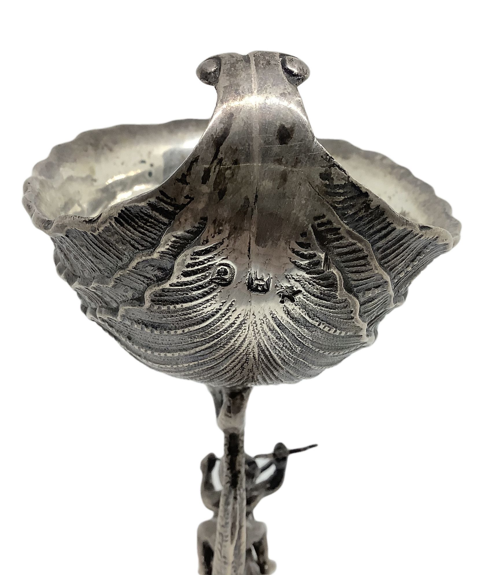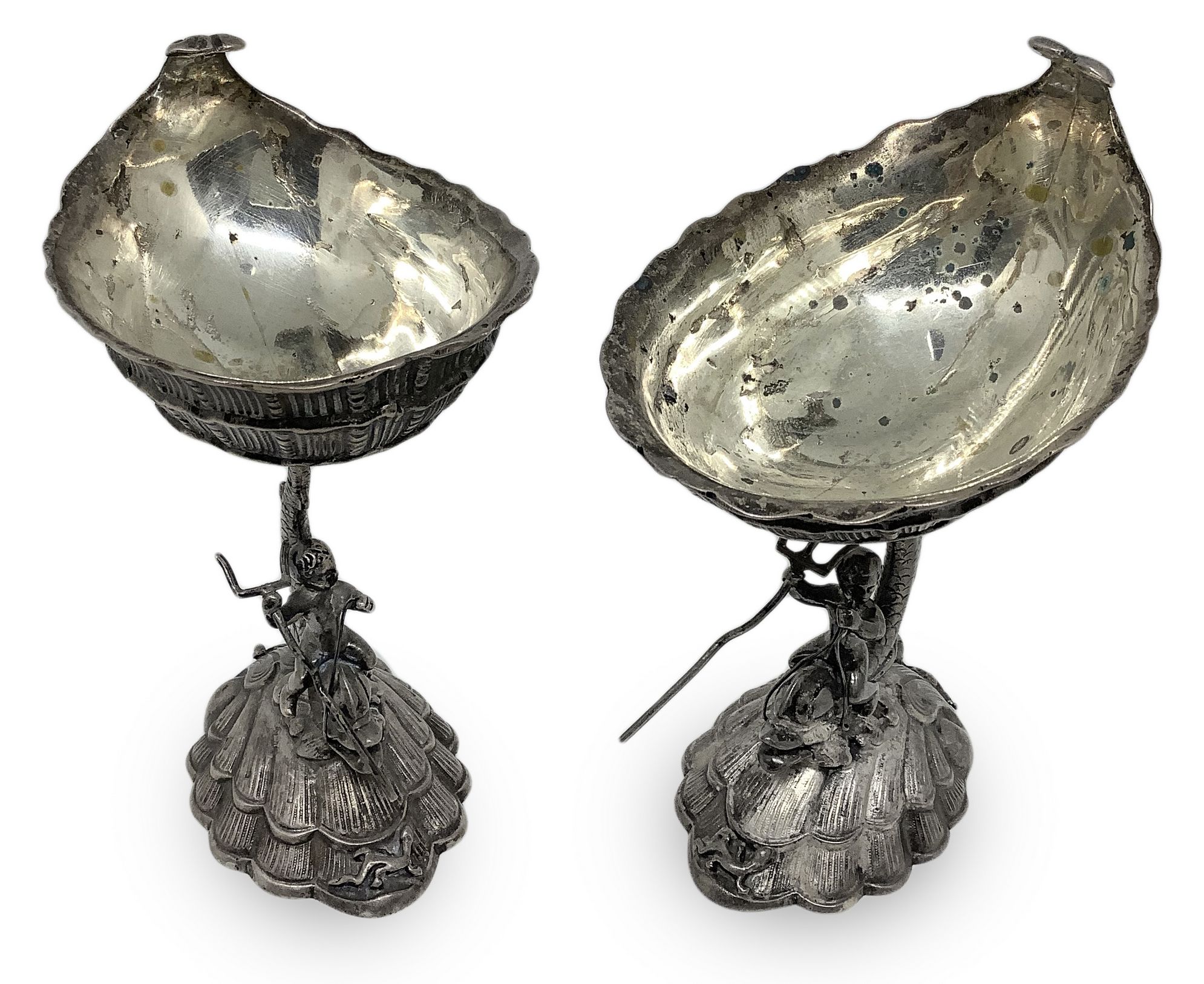 n. 2 salsiere in argento con tritone e puttino. H cm 16x8x6,5. Coppa cm 10x8...