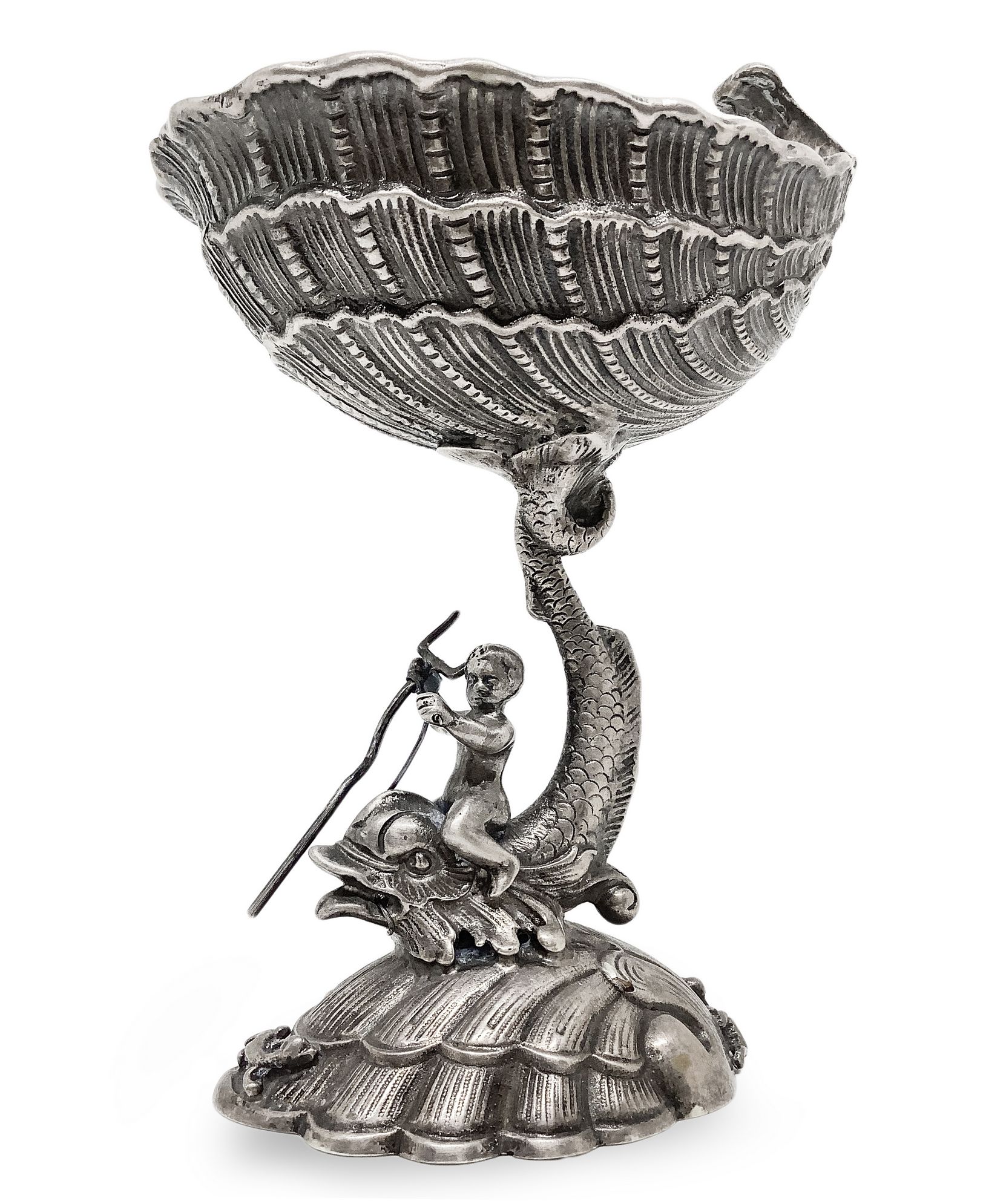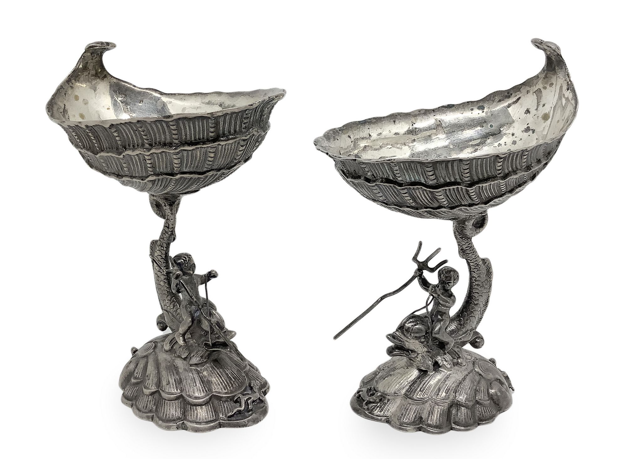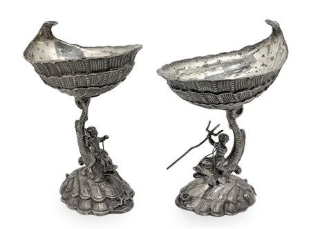 n. 2 salsiere in argento con tritone e puttino. H cm 16x8x6,5. Coppa cm 10x8 Gr. 302 cadauna.