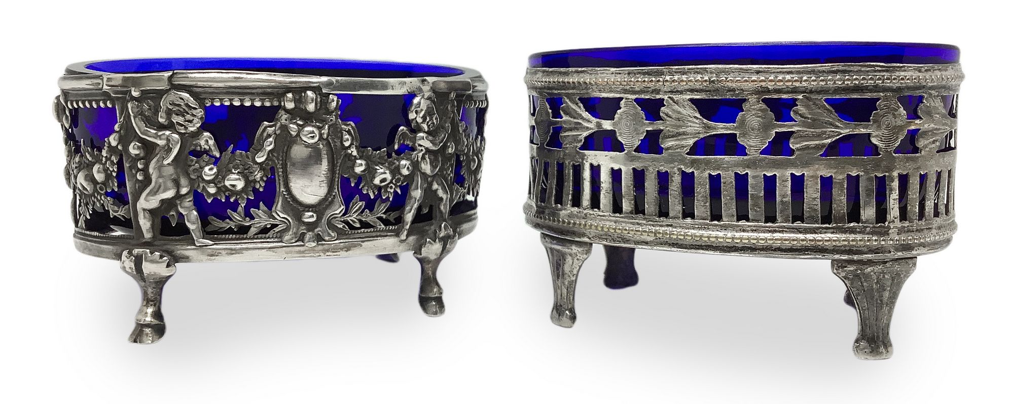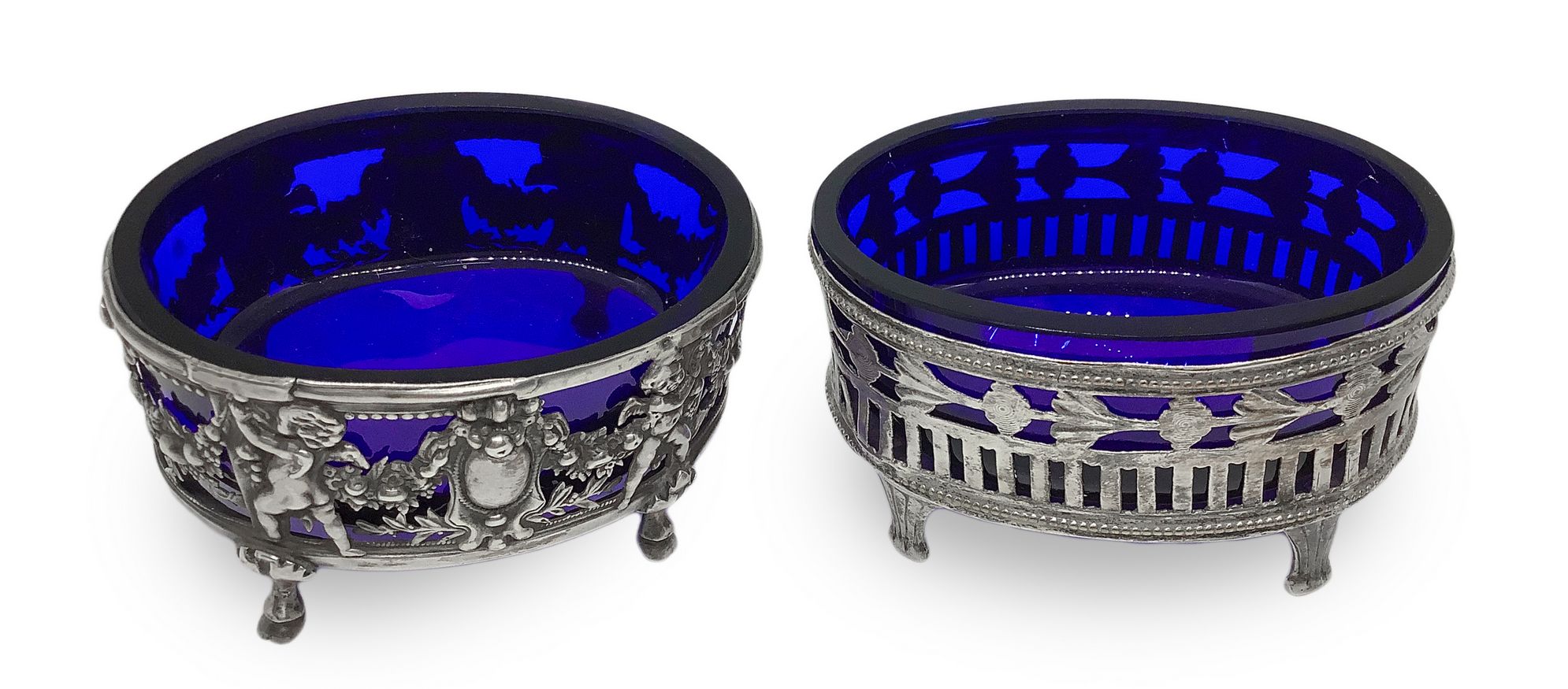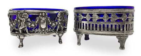 n. 2 saliere in argento con vetri blu e puttini. H cm 4,5x8