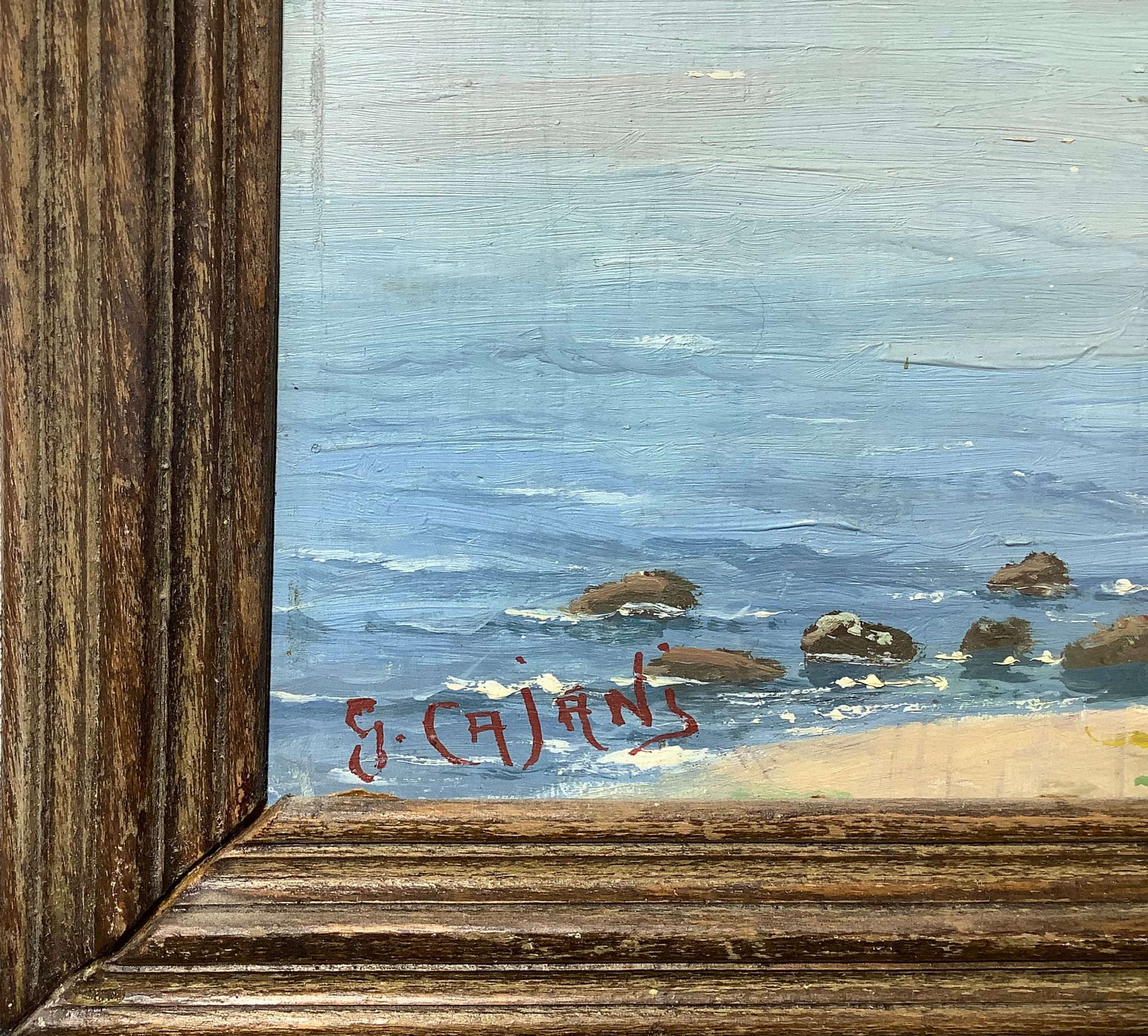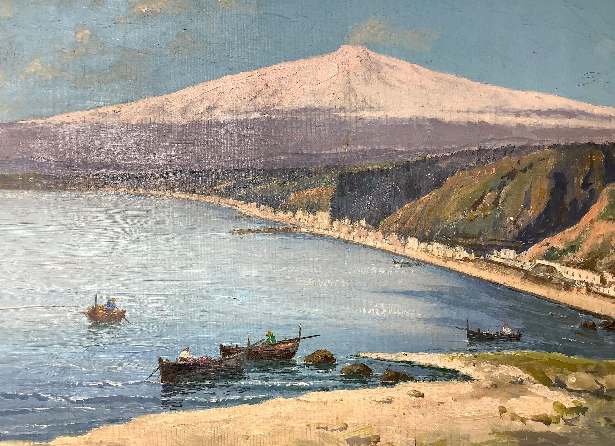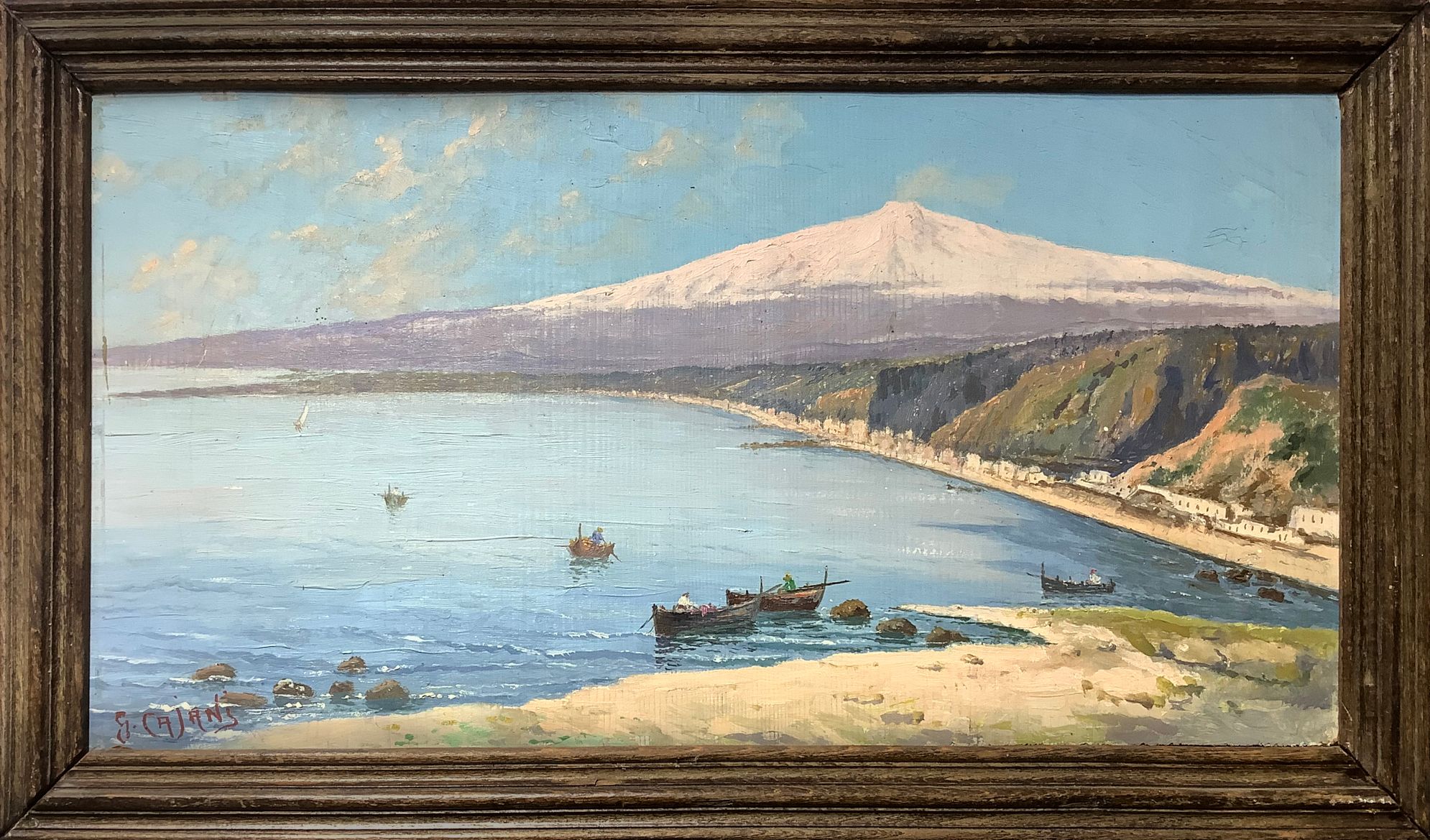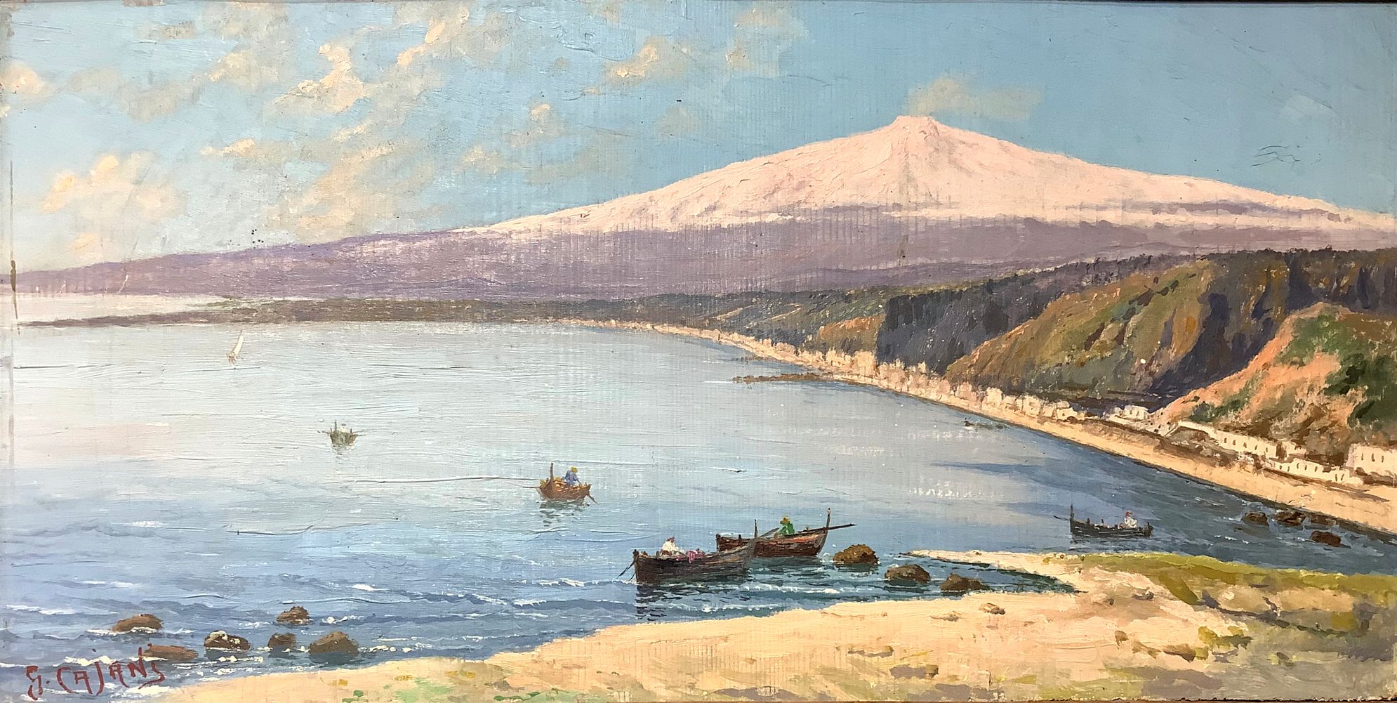 Dipinto ad olio su tela raffigurante Marina di Naxos, G. Cajani .Cm 27x51