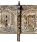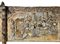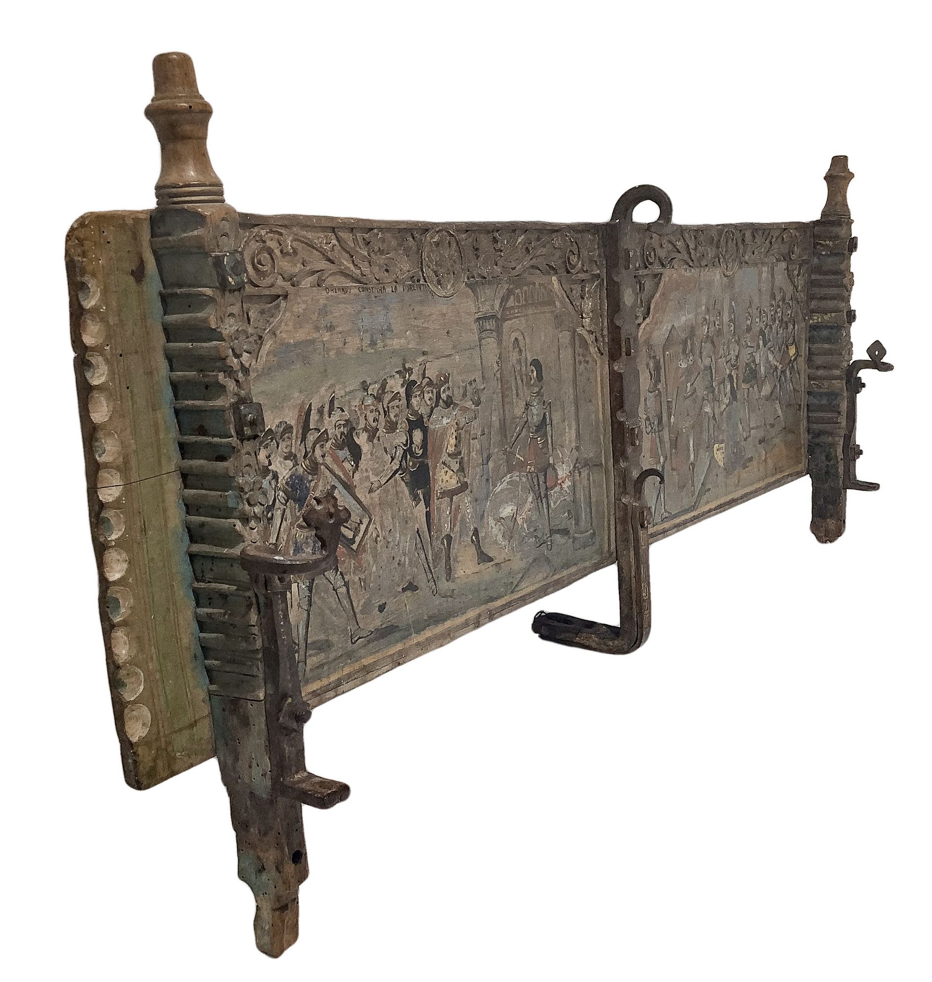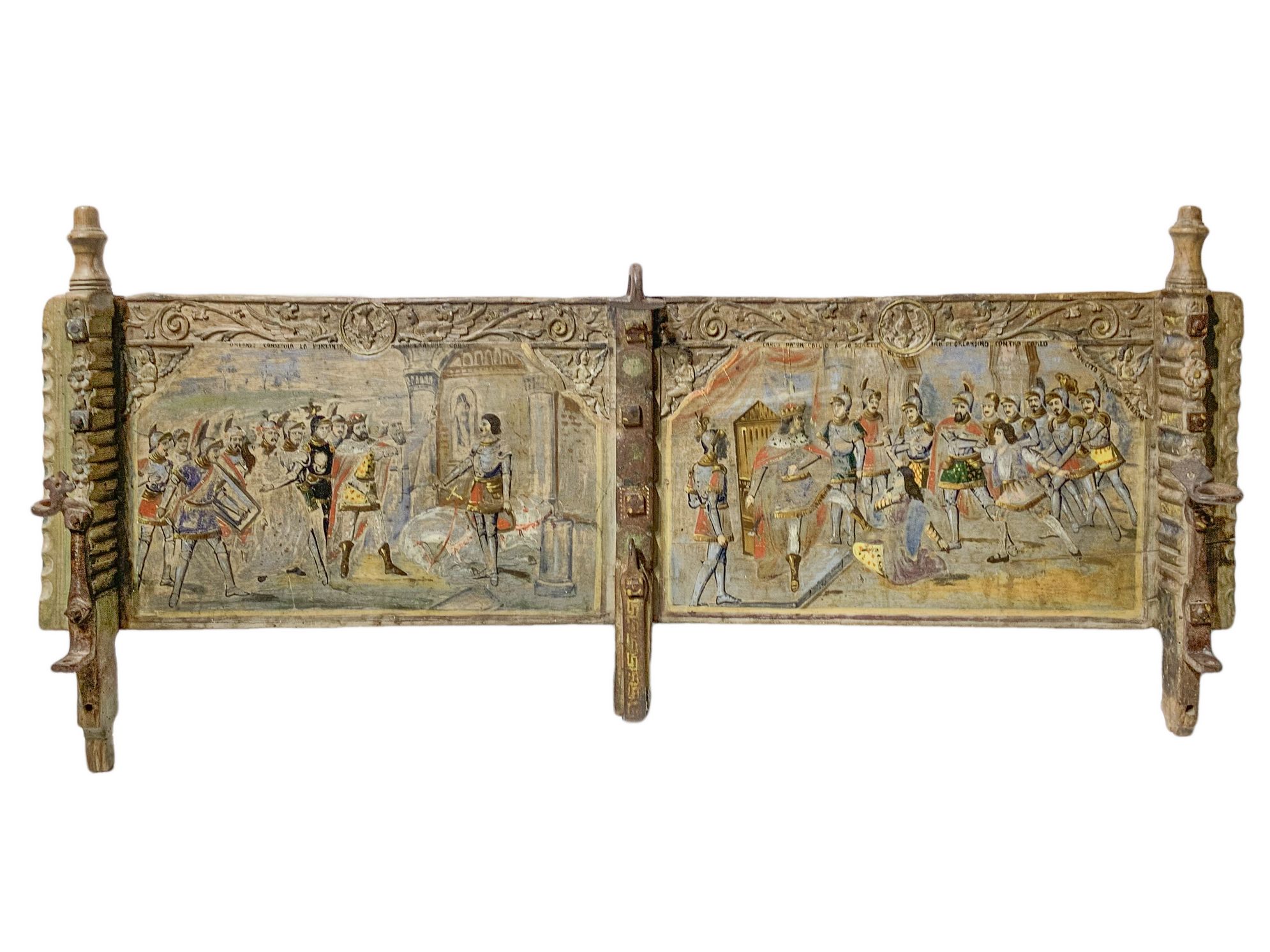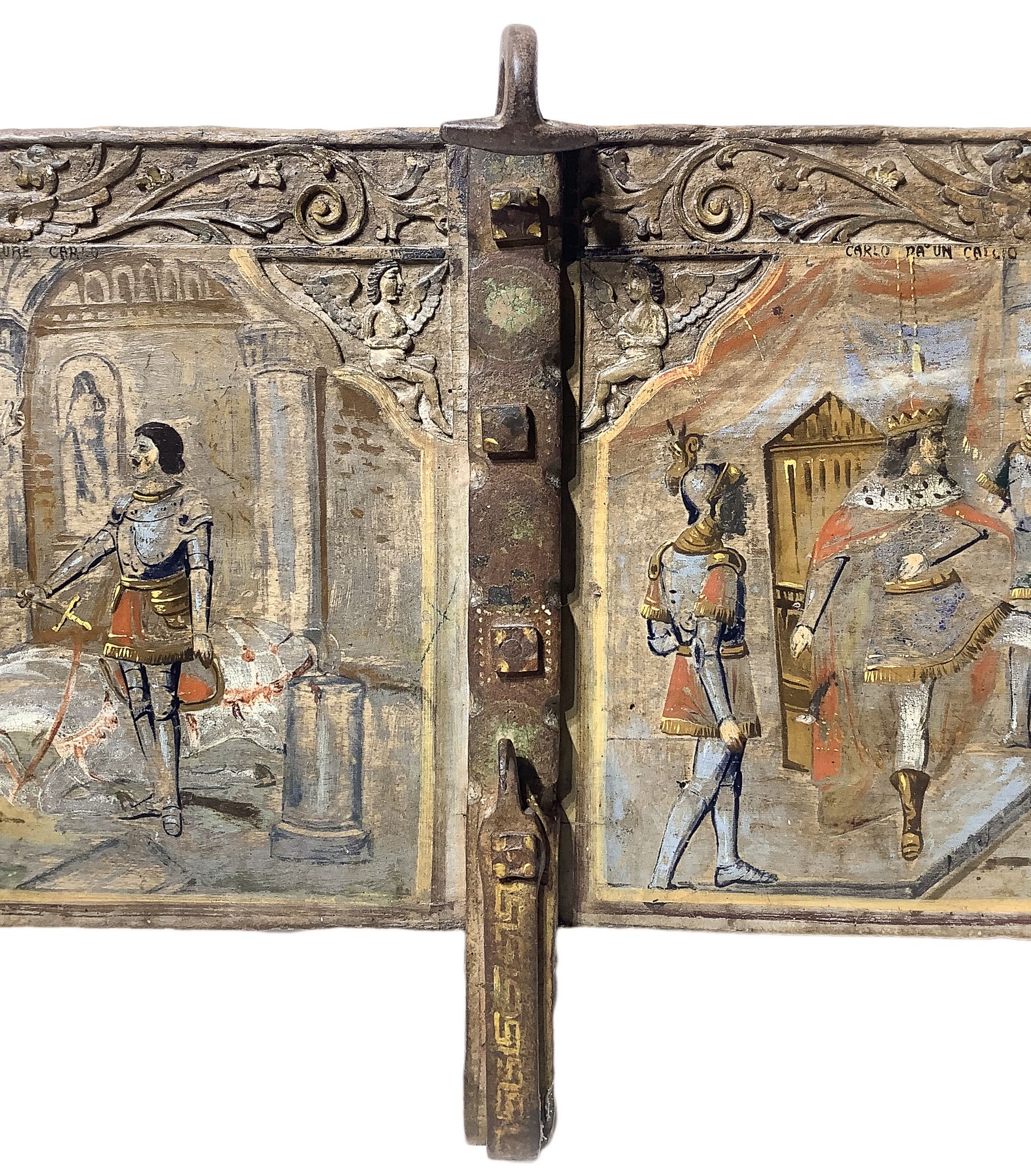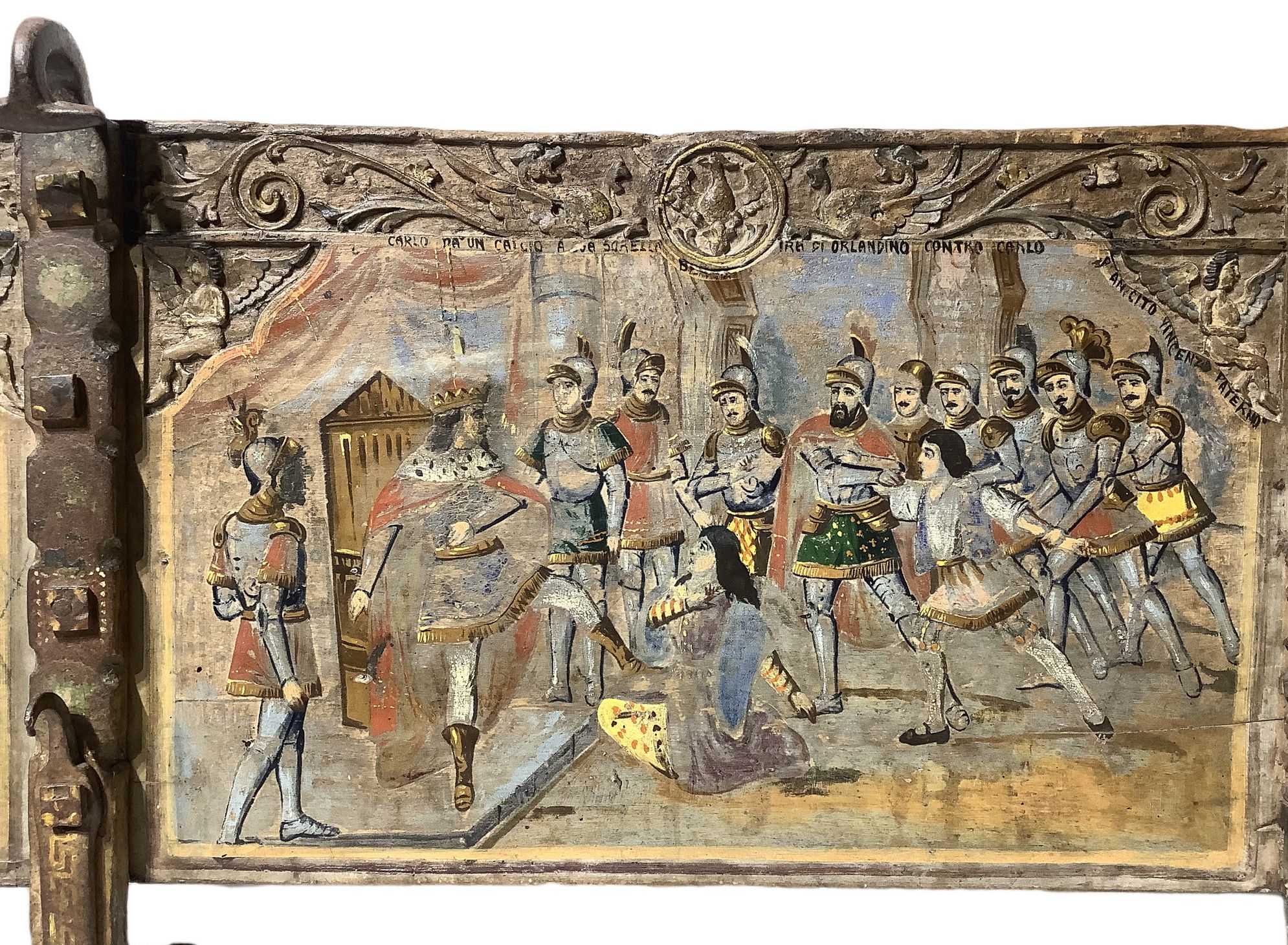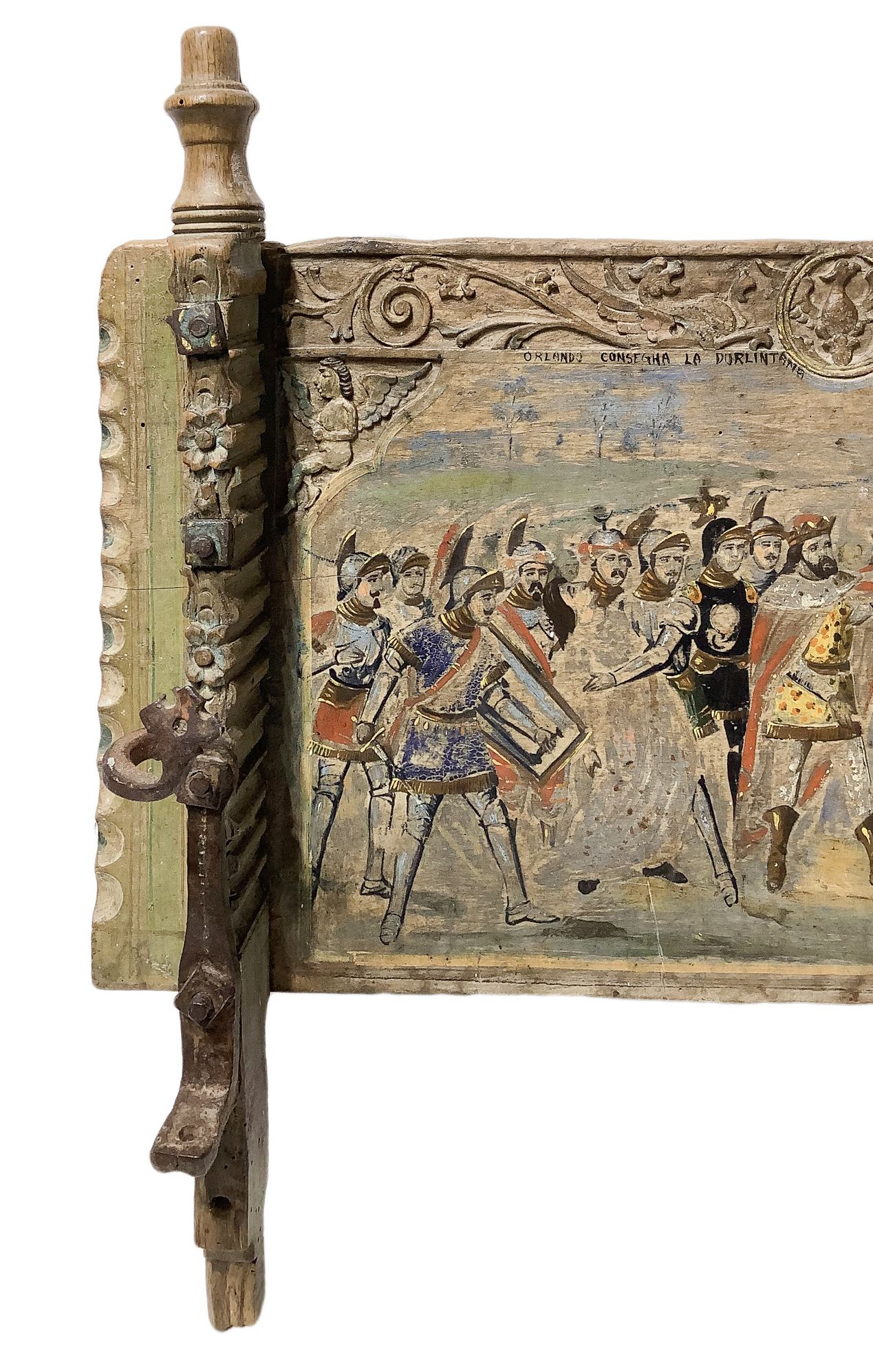 Sponda di carretto a due sezioni, Sicilia, fine XIX, inizi XX secolo. Raffigurante Orlando che consegna la Durlintana a Carlo Magno e Carlo Magno che da un calcio alla sorella Berta in prersenza di Orlandino che gli si rivolge contro. Cornici intagliate con angeli, draghi e acquile. Tratto da "Le Chansons de geste" Francia. Cm 124x52.