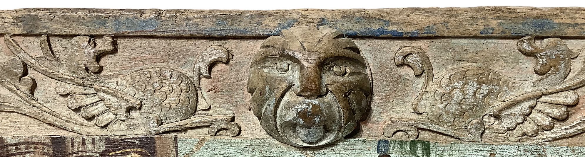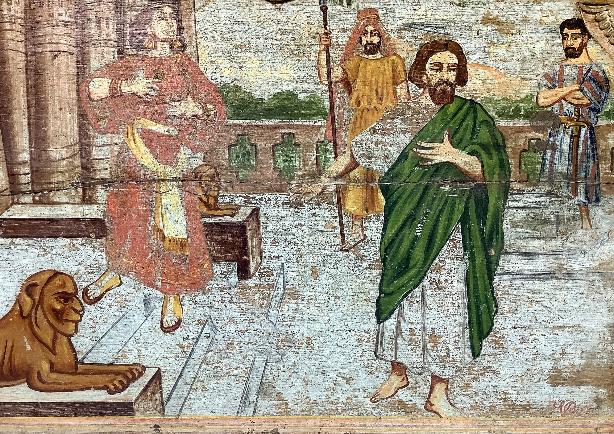Tavola di carretto raffigurante scena con Sfinge, Mosè e il Faraone. Sicilia. Cm 34x54