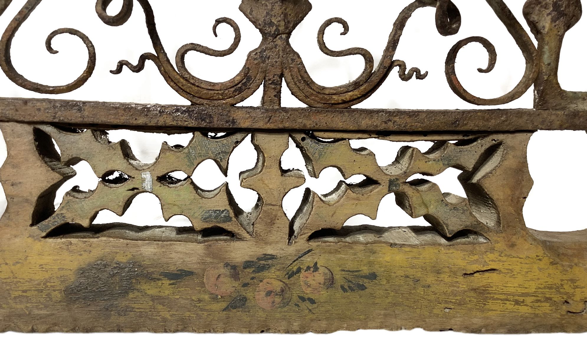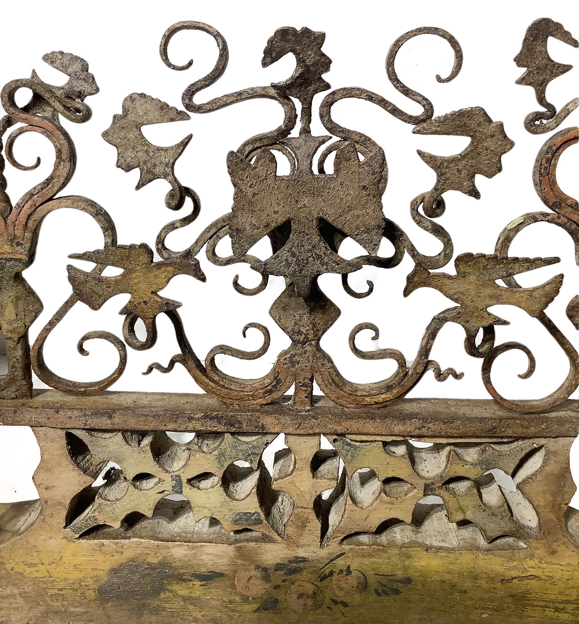 Cascia di fuso in legno e ferro scolpiti, ornamento del sottocassone del carretto Siciliano, Sicilia XIX secolo. Sculture in legno con decorazioni di fiori e frutta nei toni del giallo, ferro lavorato alla forgia in stile barocco, policromi con aquile, teste con elmi e ghirigori colorati, Cm 100x31