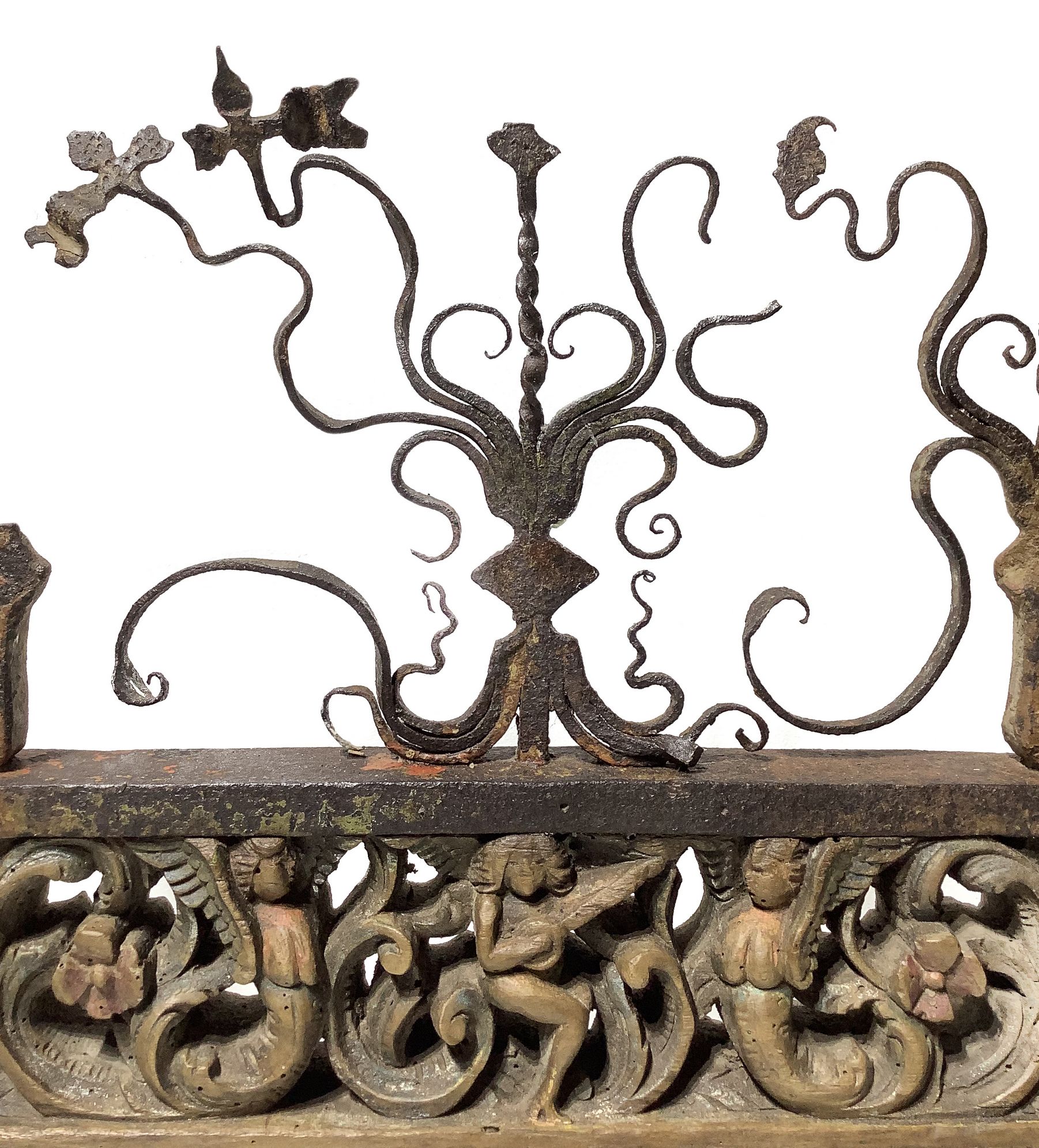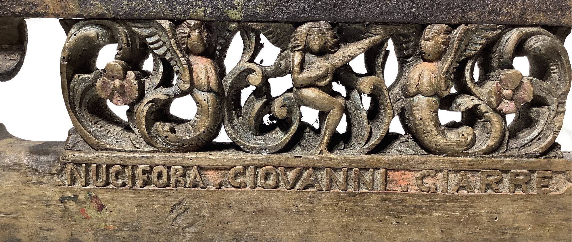 Cascia di fuso in legno e ferro scolpiti, ornamento del sottocassone del carretto Siciliano, Sicilia, autore Nucifora Giovanni di Giarre (ct), XIX secolo. Sculture policrome raffiguranti angeli suonatori e lavorazione alla forgia di ferri alla maniera barocca, di teste con elmi. Cm 105 x49.