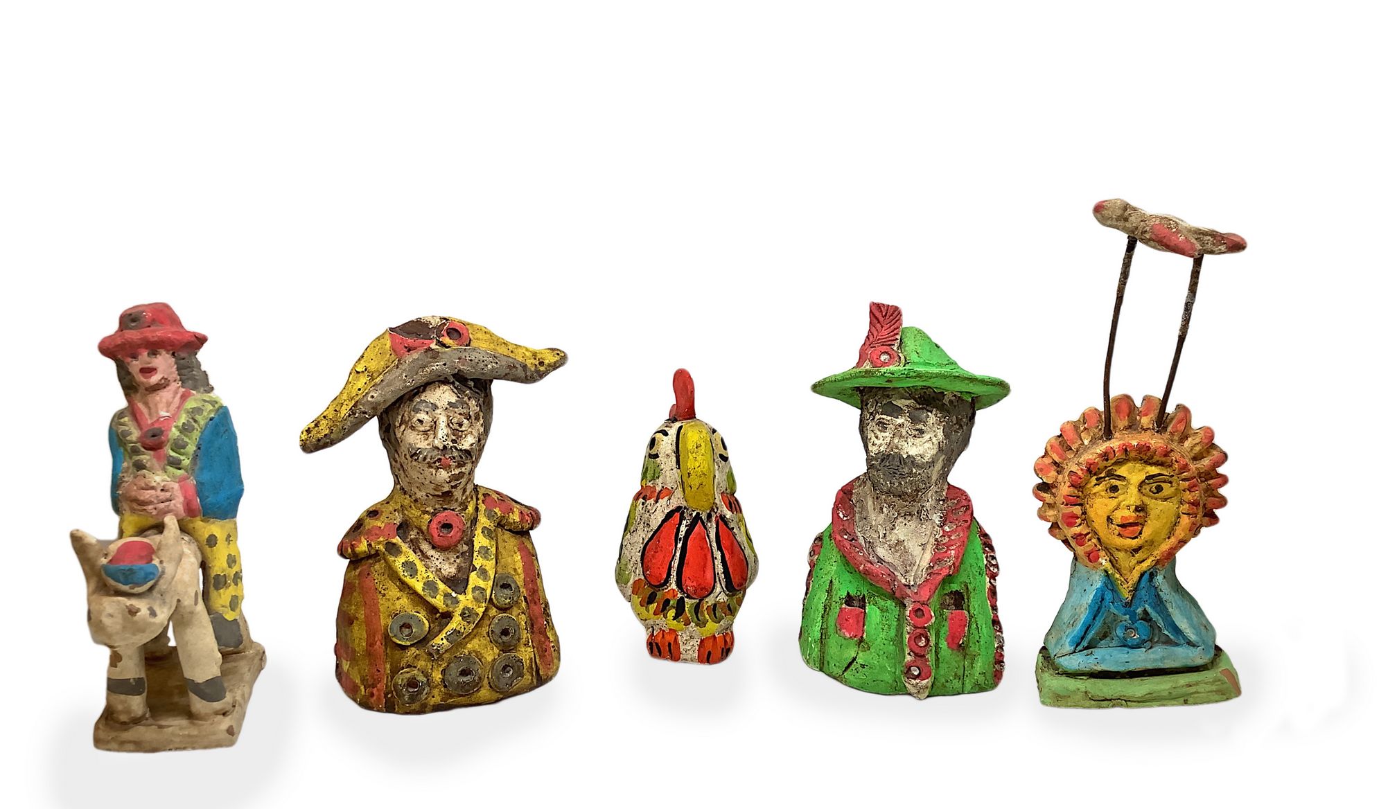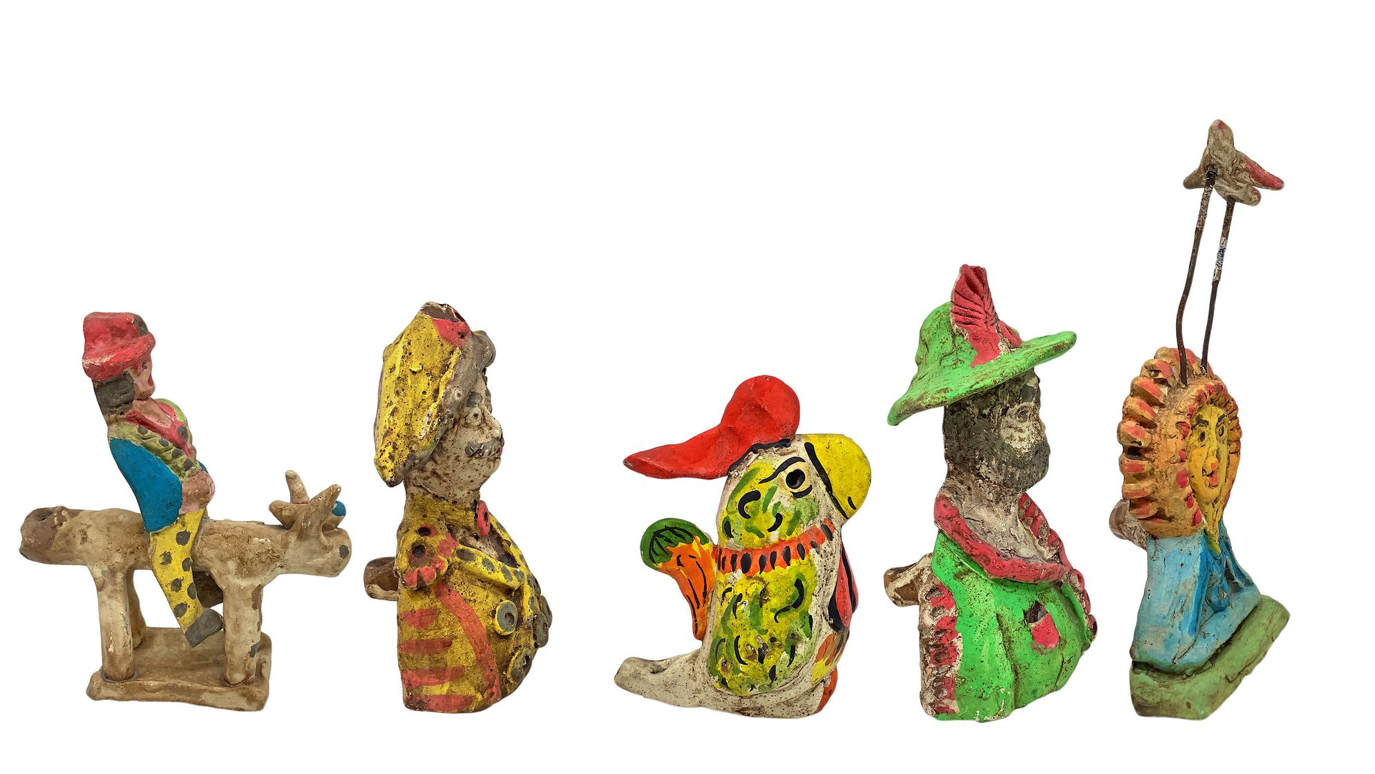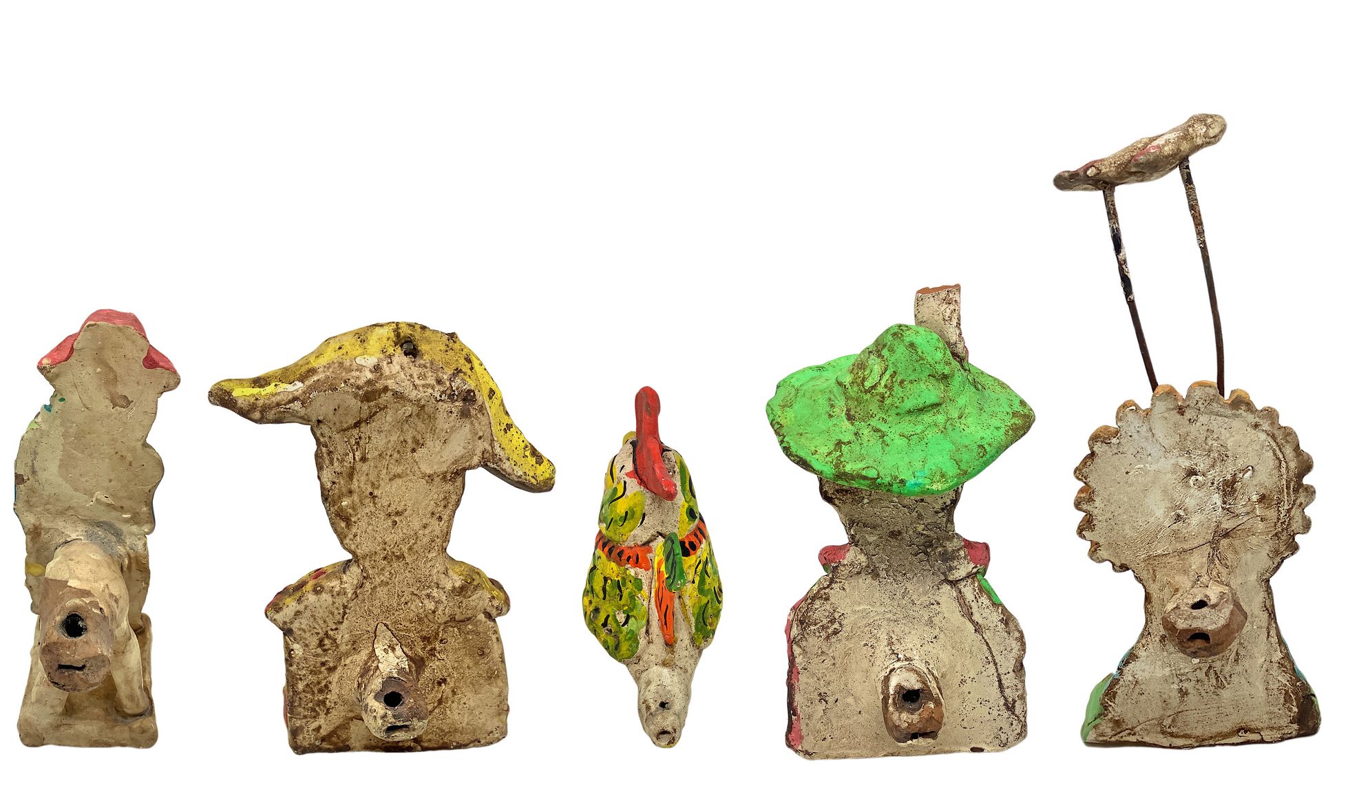 5 fischietti in ceramica siciliana, Caltagirone, XX secolo.