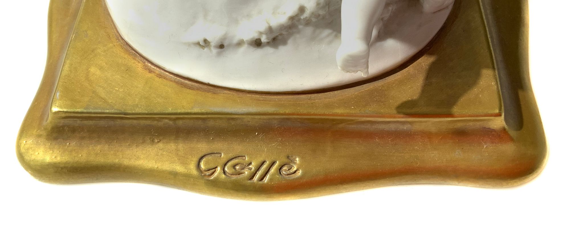 Statuetta in porcellana di colore bianco, base in colore oro, Maternità. H Cm 25. Base Cm 12,5x12,5. Datato 1987. Firmata Gellè. Piccola sbeccatura.