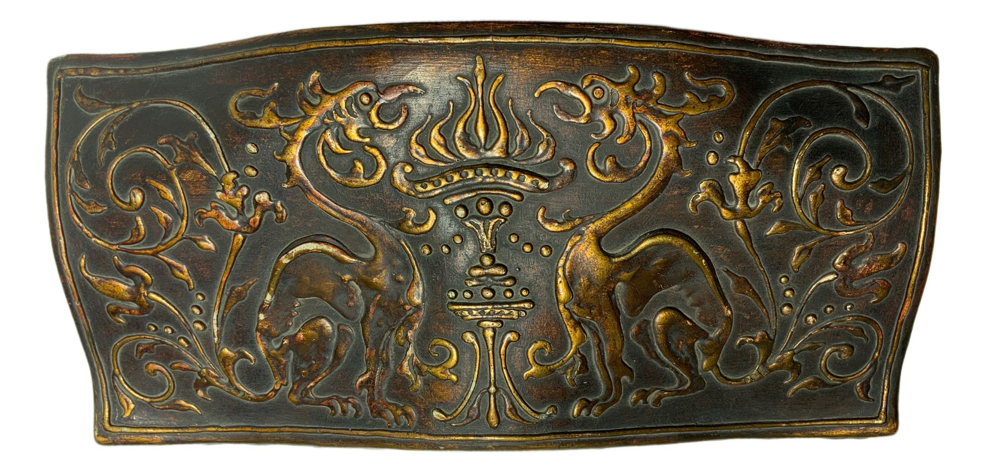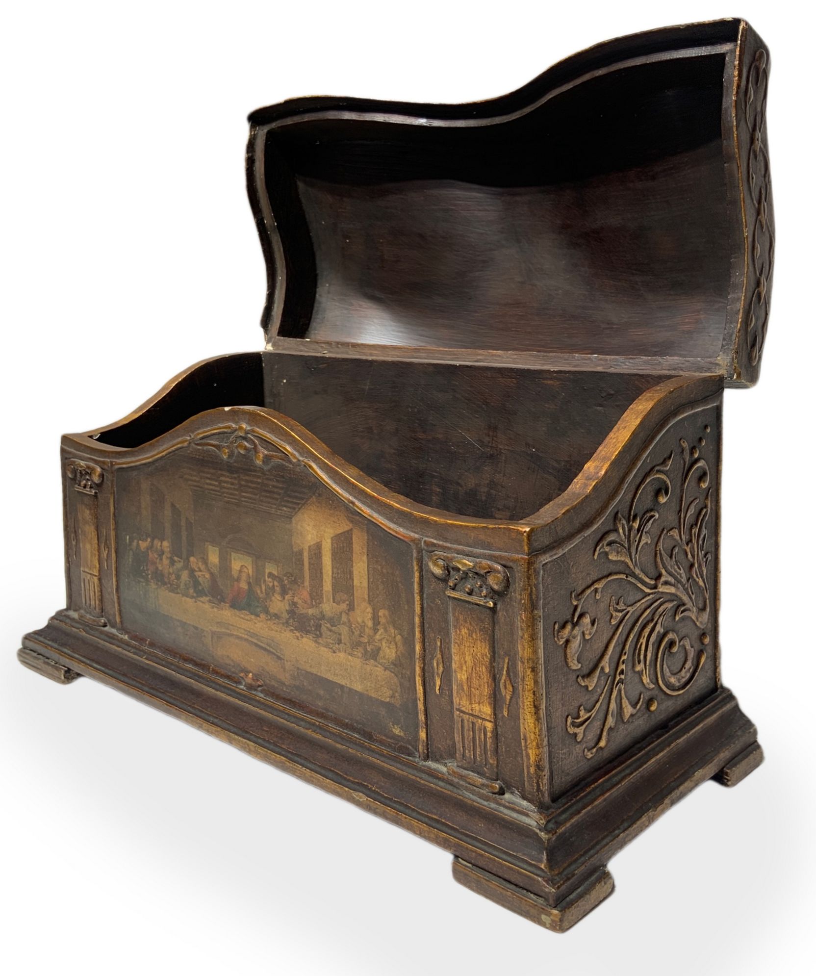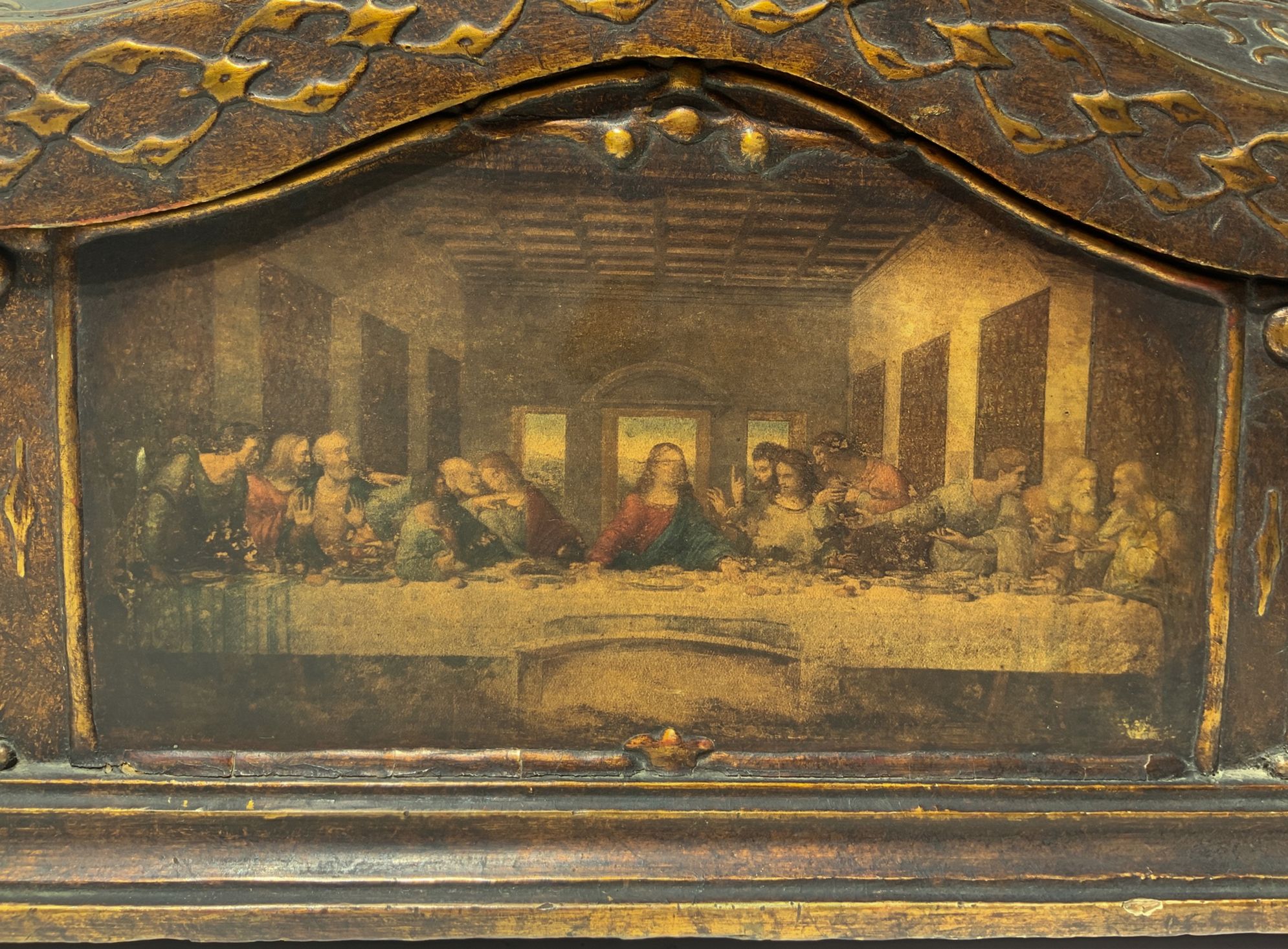 Scatola portalettere in legno dorato con raffigurazione dell’Ultima Cena sul fronte, XX secolo.