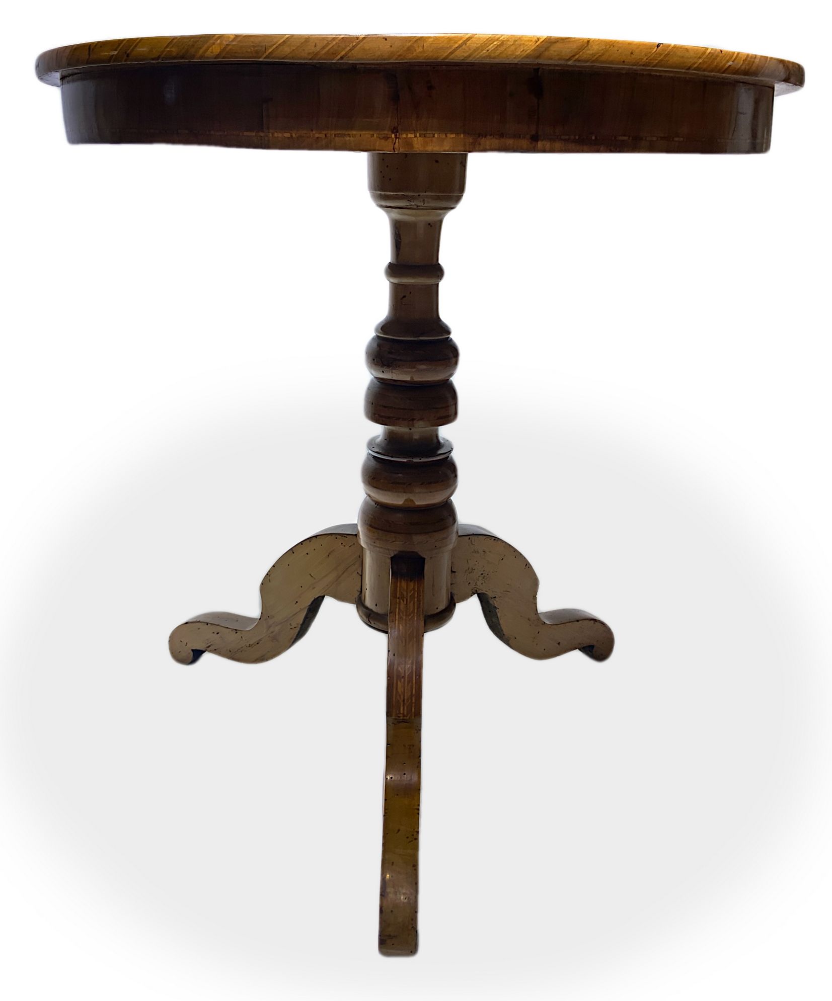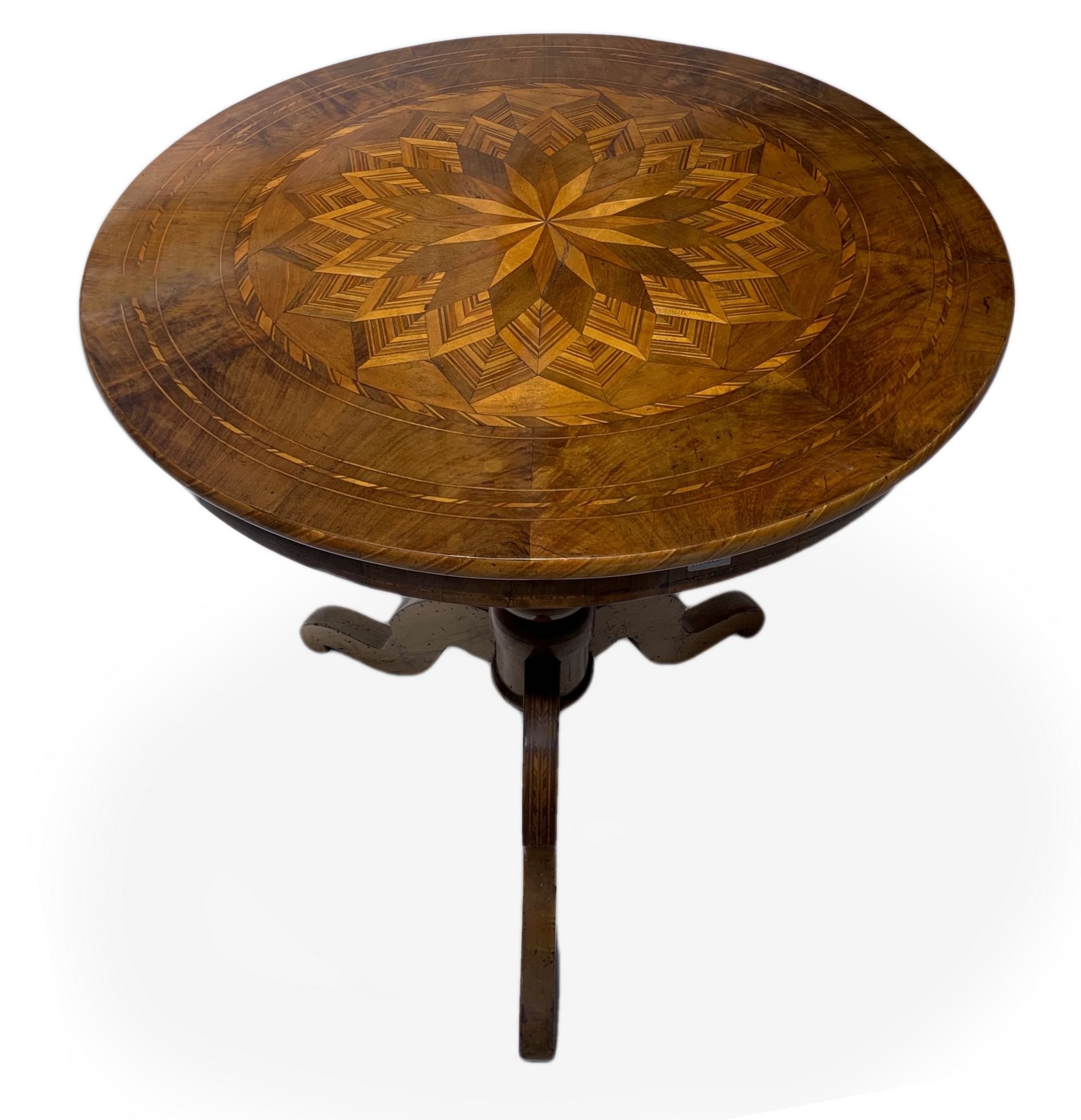 Tavolo rotondo in noce nazionale chiara, XIX secolo. Piano intarsiato a rosa...