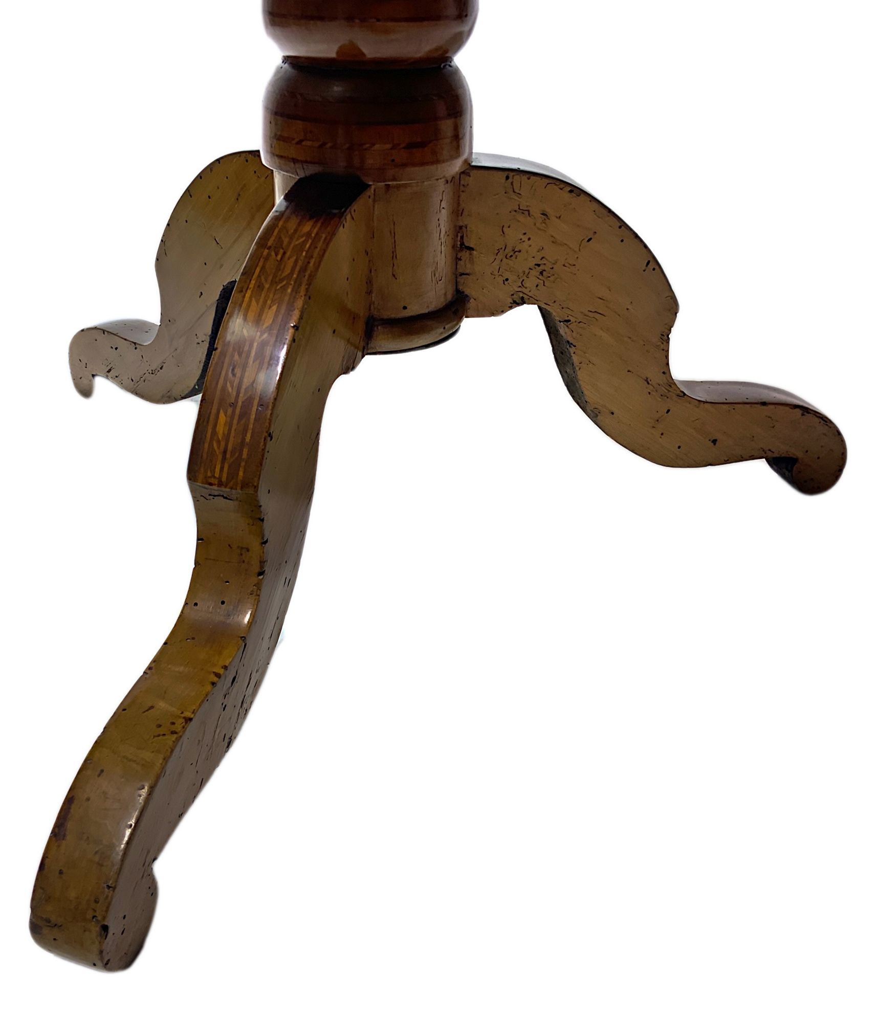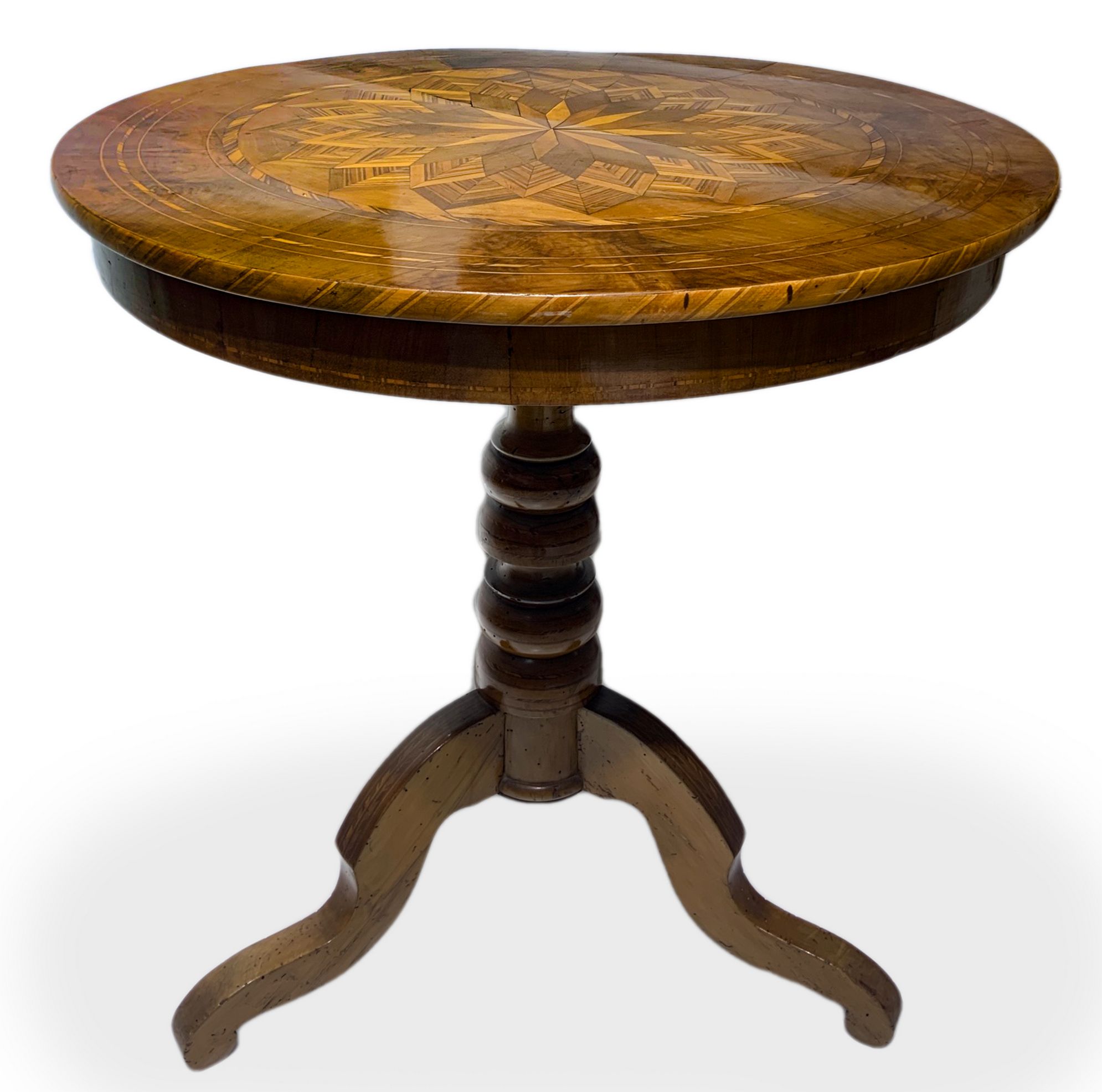 Tavolo rotondo in noce nazionale chiara, XIX secolo. Piano intarsiato a rosa dei venti. H CM 73, diametro cm 71