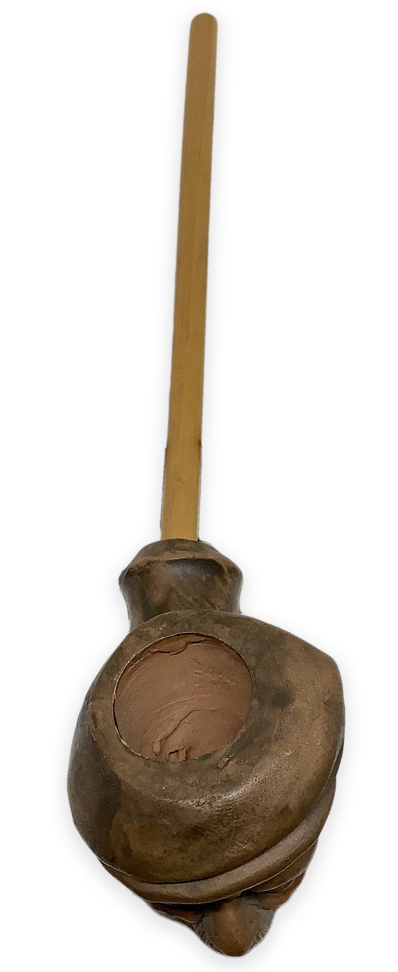 Grossa pipa con fornello e cannello in argilla, canna e bocchino in bambù.