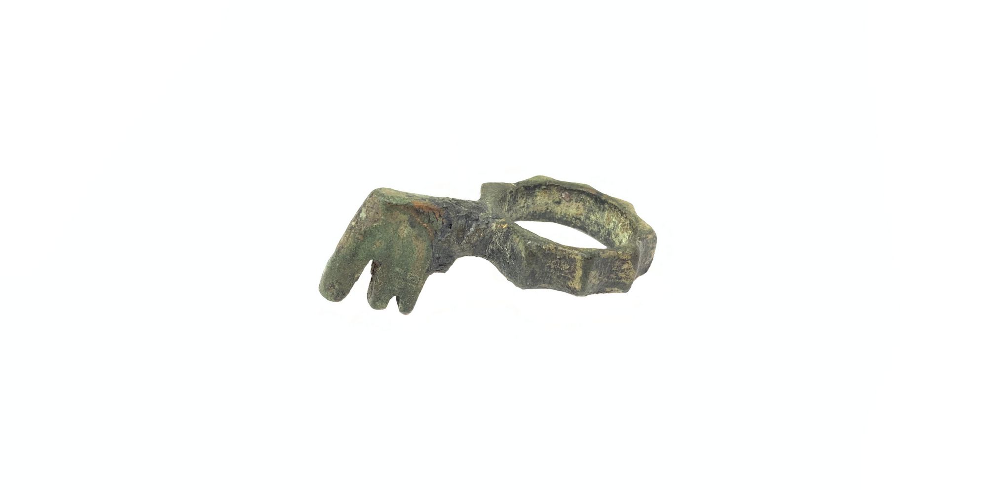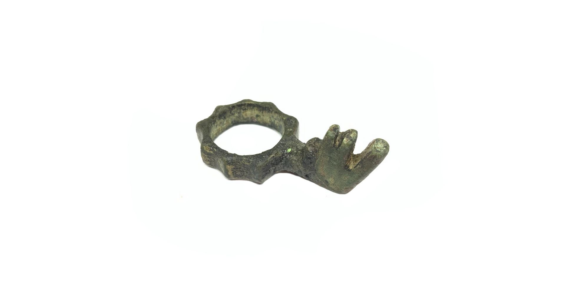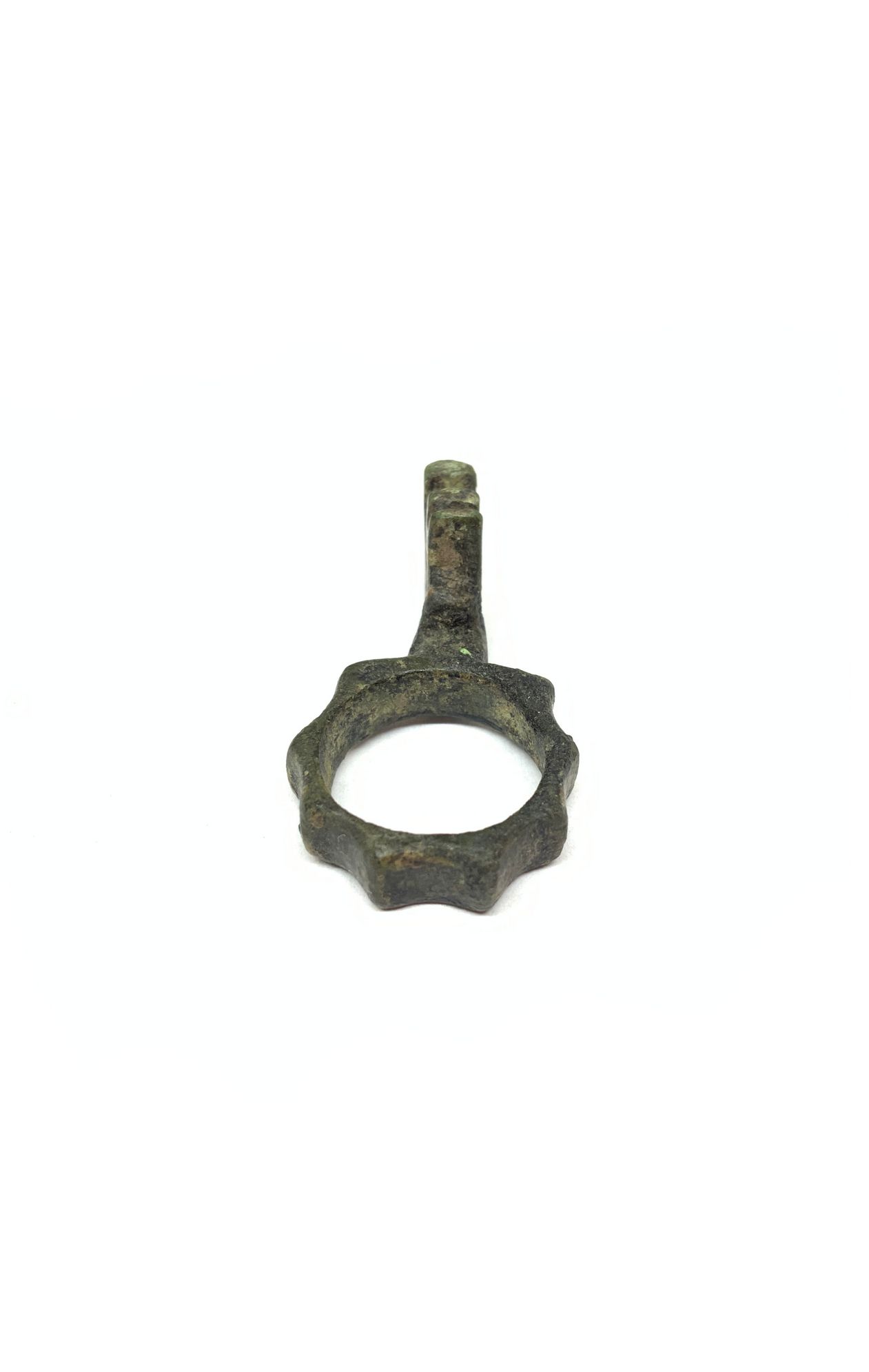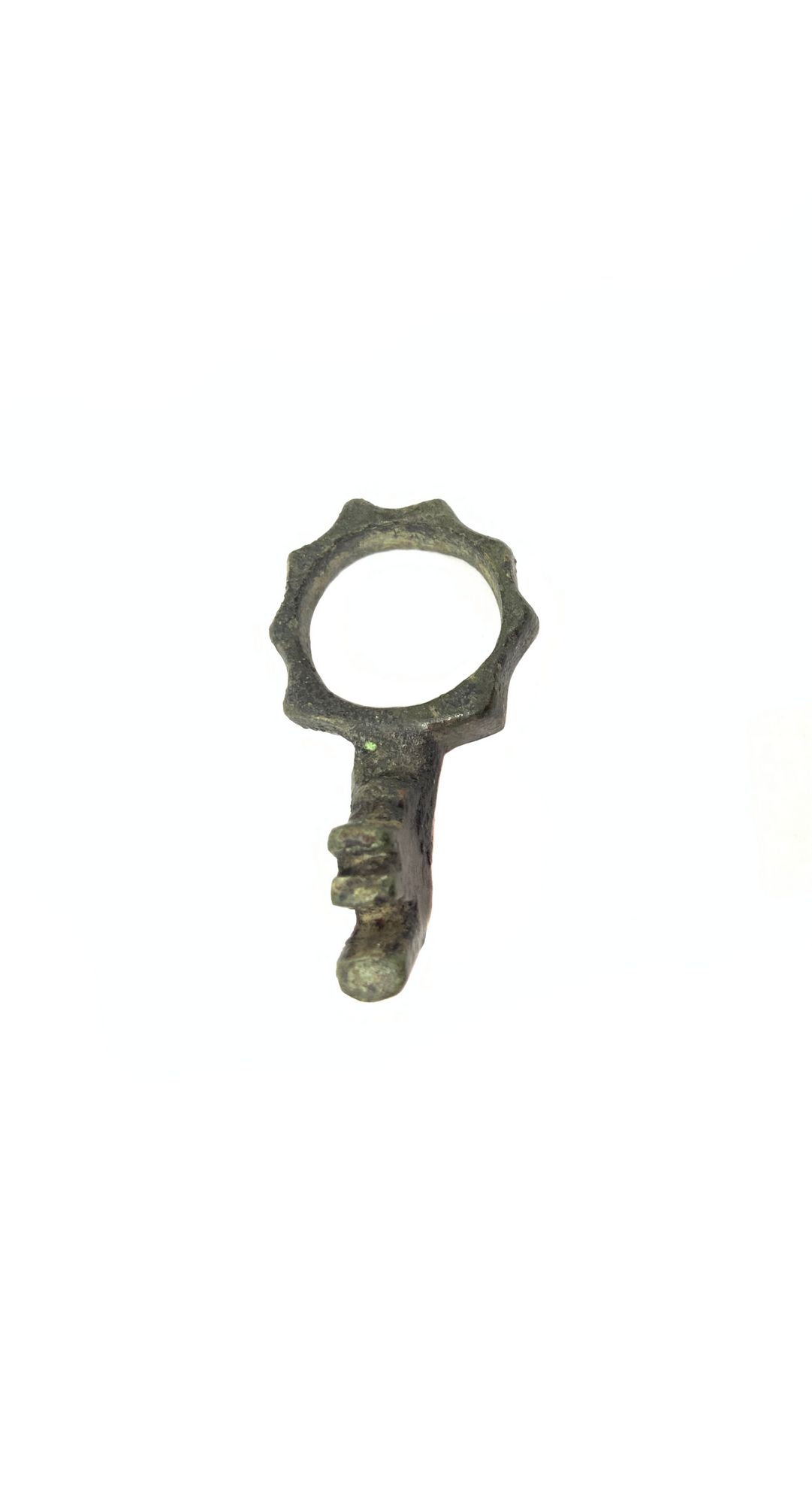 Antico anello a fascetta ornata, con chiave da scrigno, in bronzo, XIII– XIV secolo circa. Anello a fascetta, in bronzo. La fascetta è decorata nella parte esterna da una corona dentellata. Sulla parte alta della vera è saldata una elegante piccola chiave da scrigno. Circonferenza cm. 6. - Anello a fascetta coronata, in bronzo, nel quale è saldata una piccola ed elegante chiave da scrigno artisticamente realizzata, di uso femminile.- Esemplare estremamente elegante, rarissimo e di elevatissimo valore.