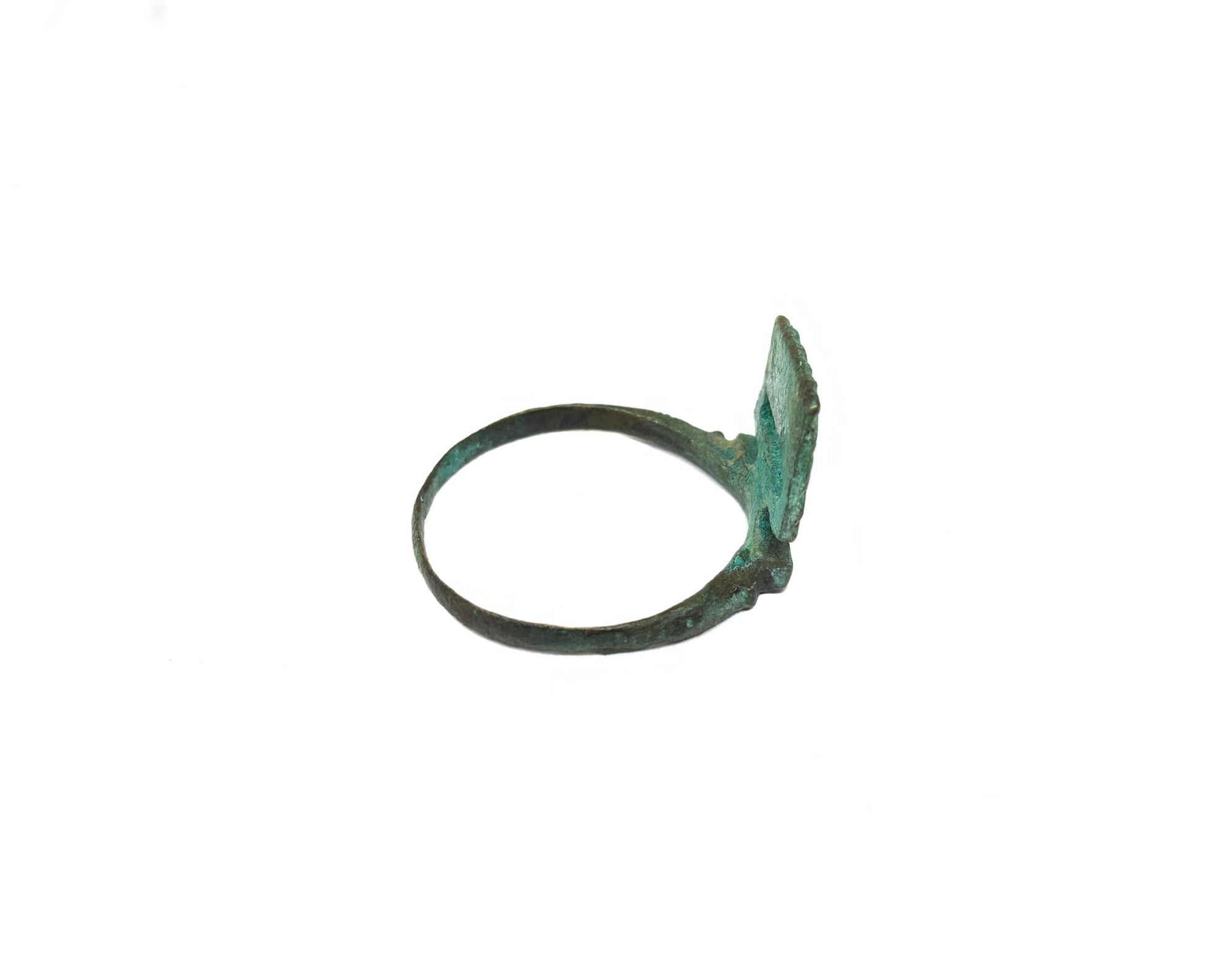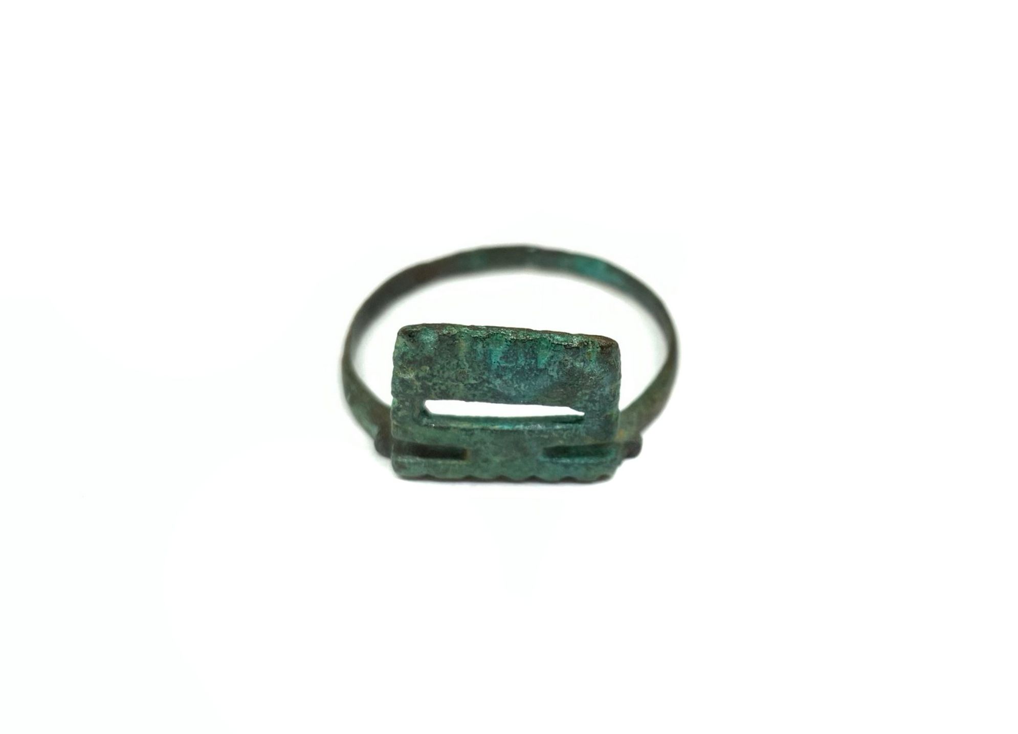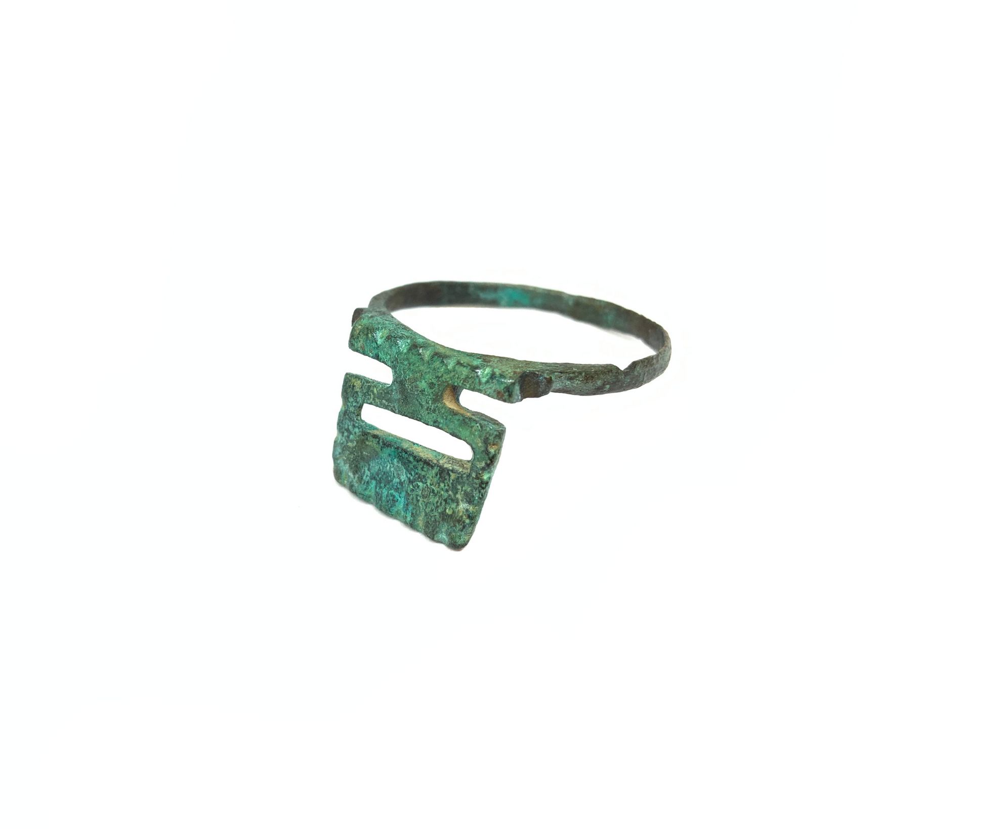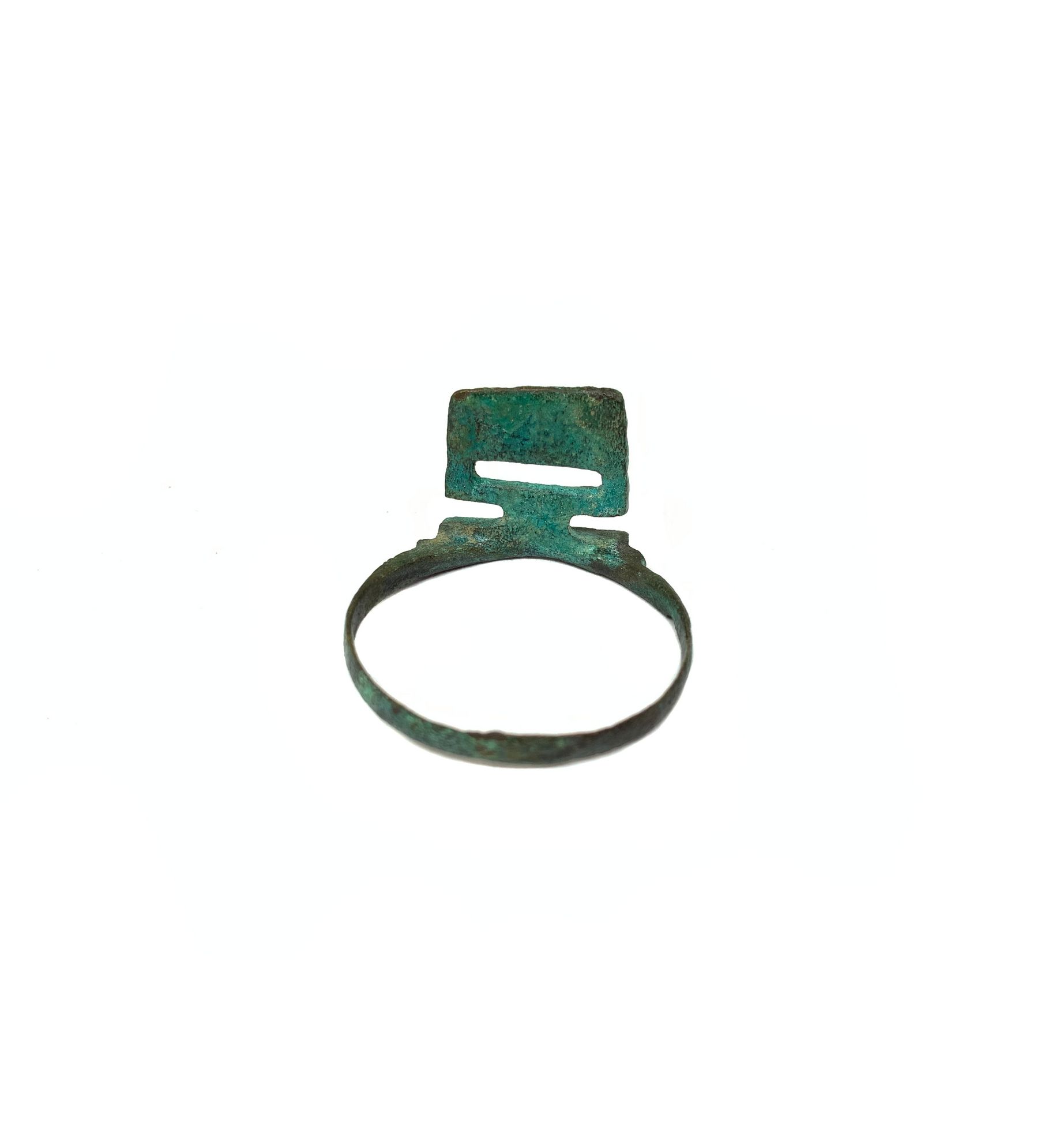 Antico anello a fascetta liscia con chiave da scrigno, in bronzo, XII - XIV secolo circa d. C. Anello a fascetta liscia in bronzo. Sulla parte della platina è saldata una chiave piatta da scrigno. Misura: circ. cm. 10. - Anello a fascetta liscia, in bronzo, al quale è saldata una chiave da scrigno artisticamente realizzata, di uso maschile. - Esemplare rarissimo e di elevatissimo valore.