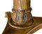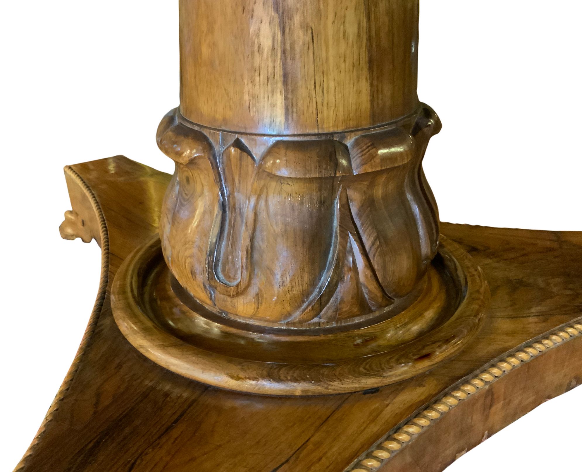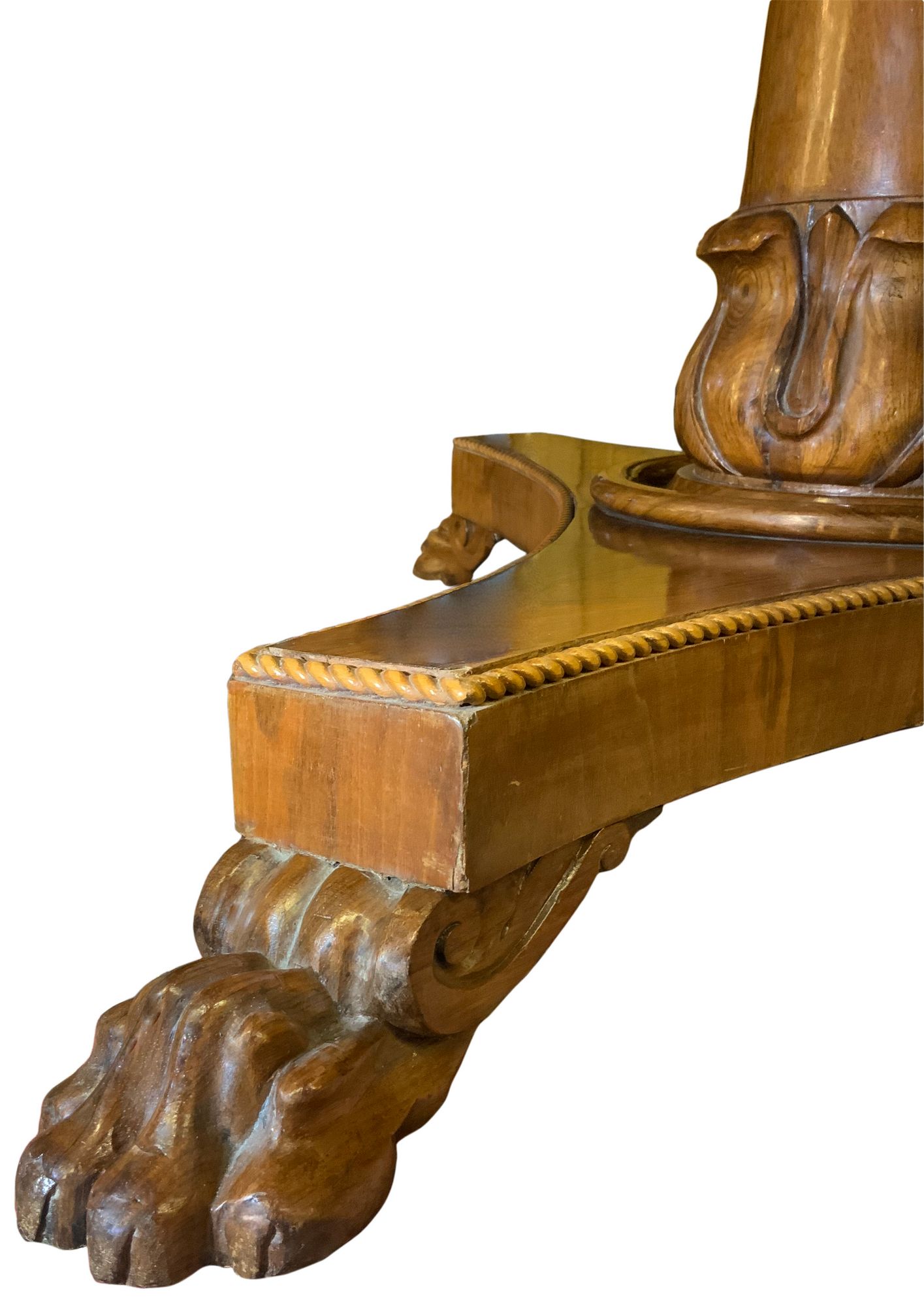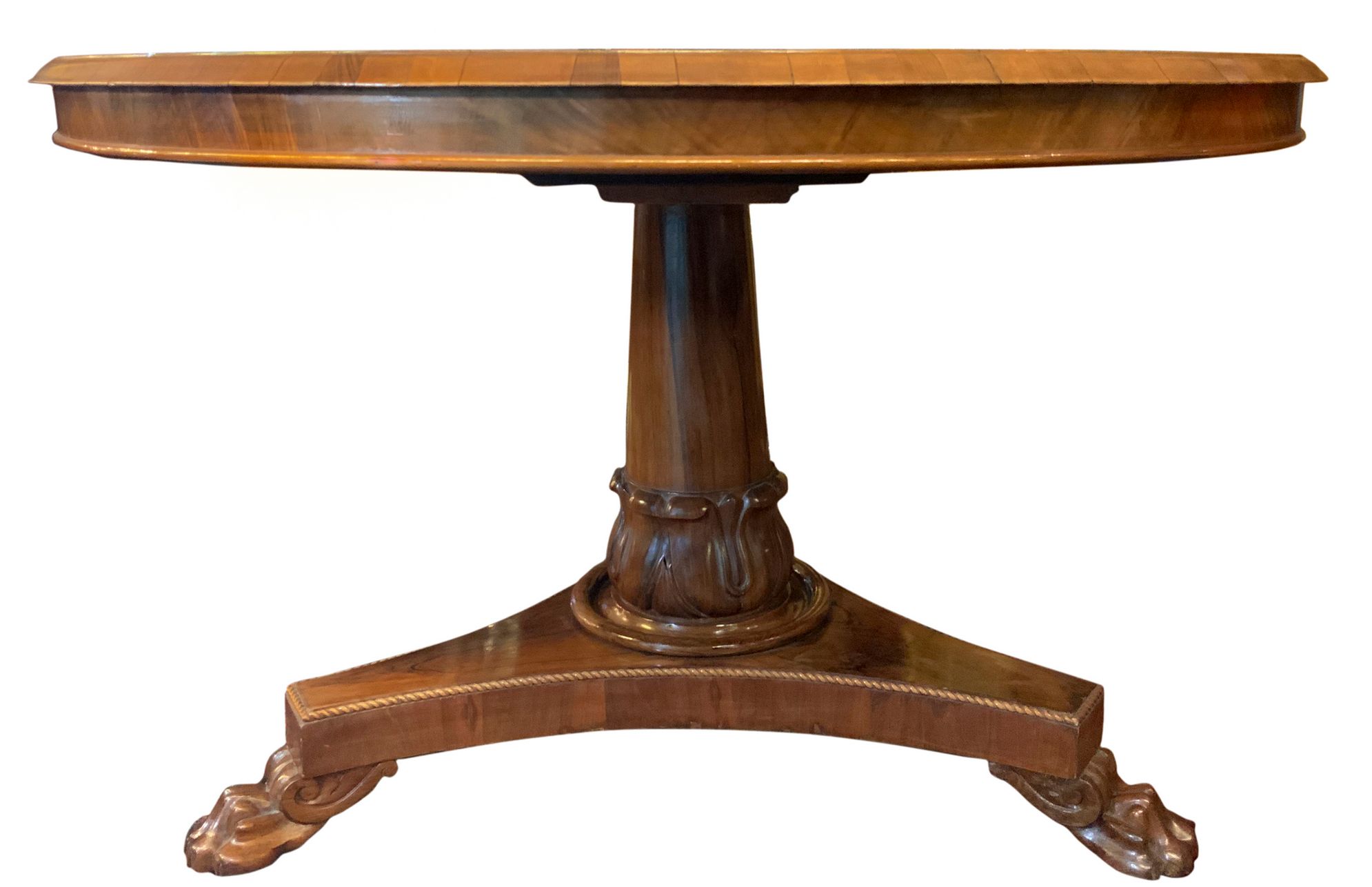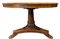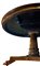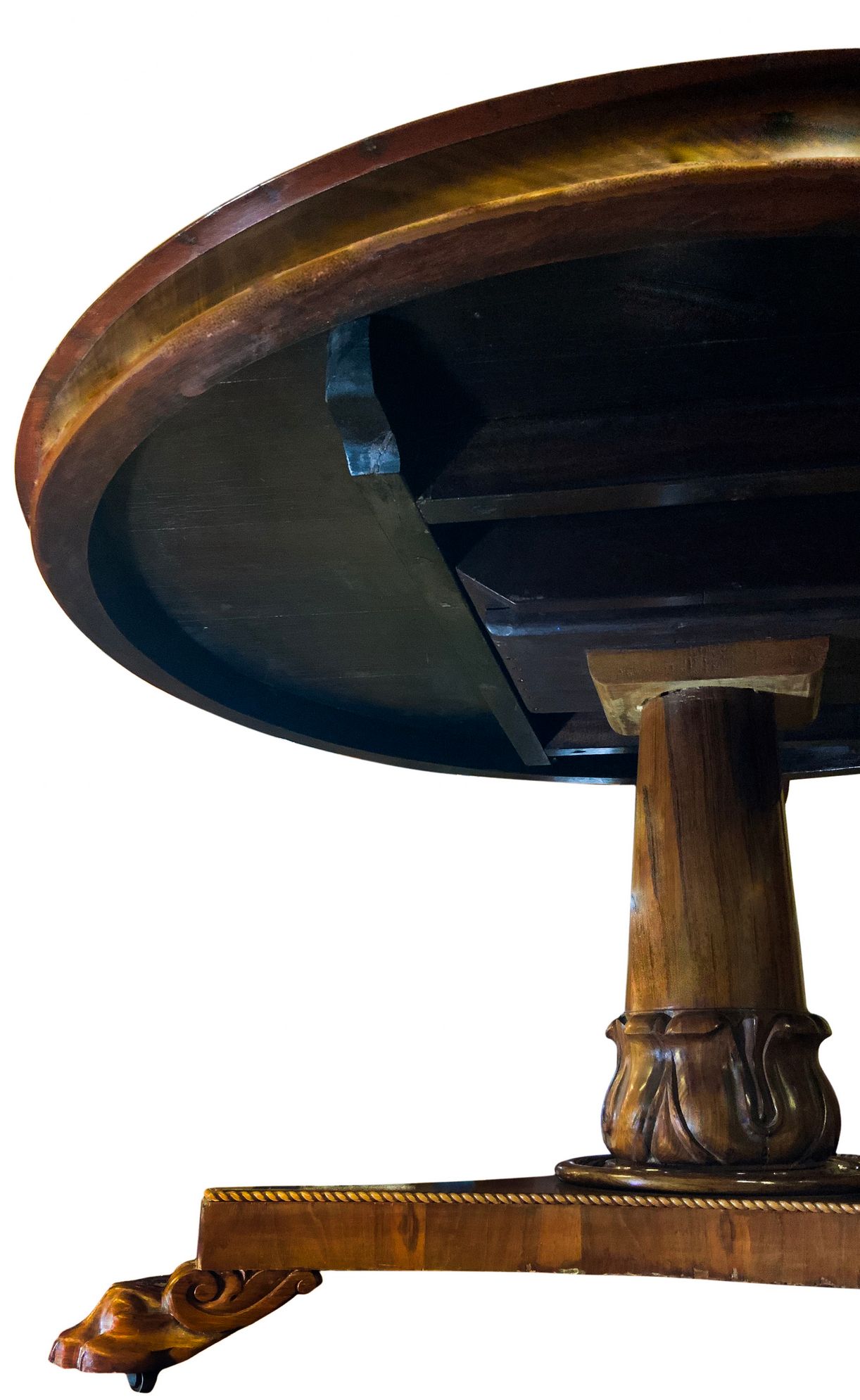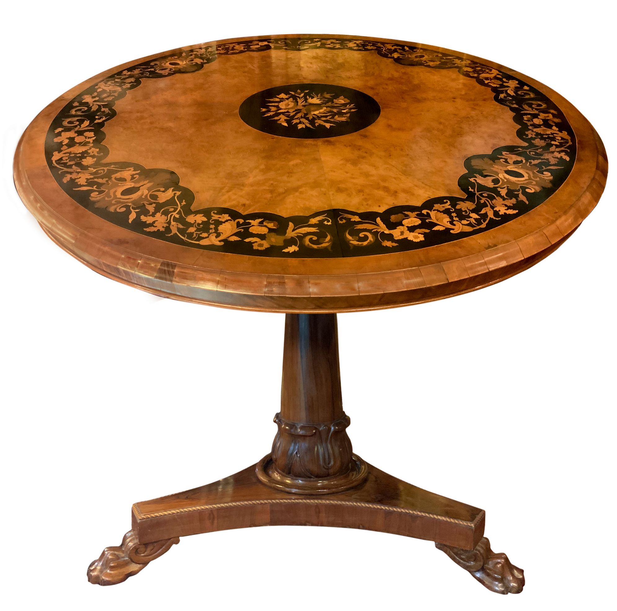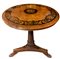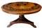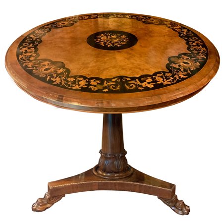 Tavolo rotondo intarsiato al piano con legni chiari. H cm 75. Diametro cm 132. Piede centrale leonino.