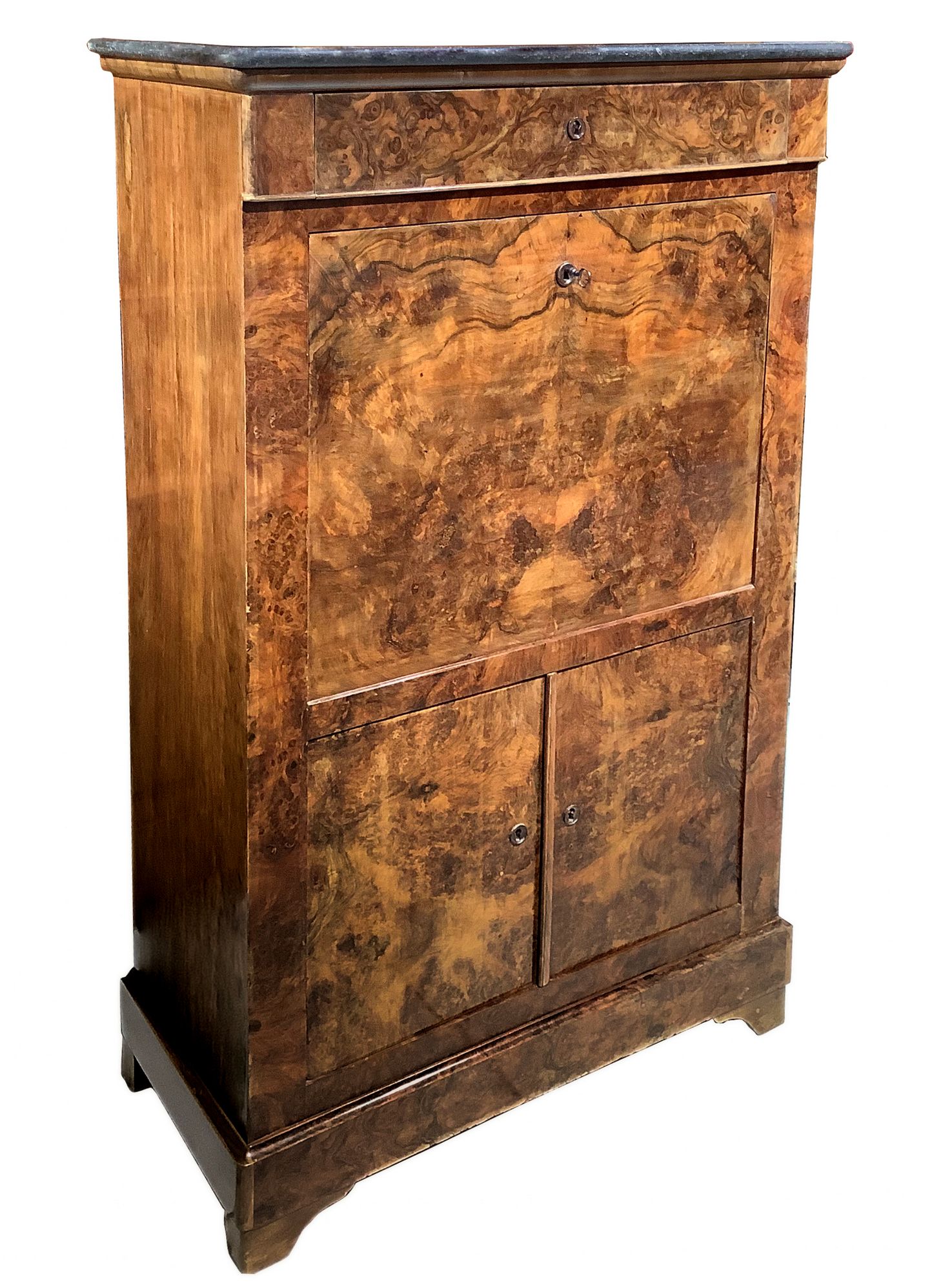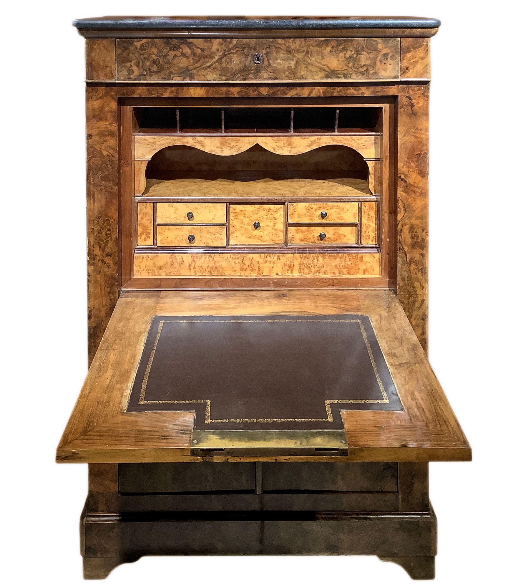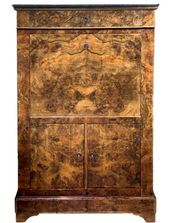 Secrétaire in legno rivestito in radica di noce, XIX secolo. Piano in marmo nero. Cassetto superiore, vano Secrétaire con apertura frontale a ribalta contenente cinque cassettini, due cassettini segreti e vano cartiera. Presenta un vano con ante a battente. Interni rivestiti in acero occhettato. H Cm 150x90x43