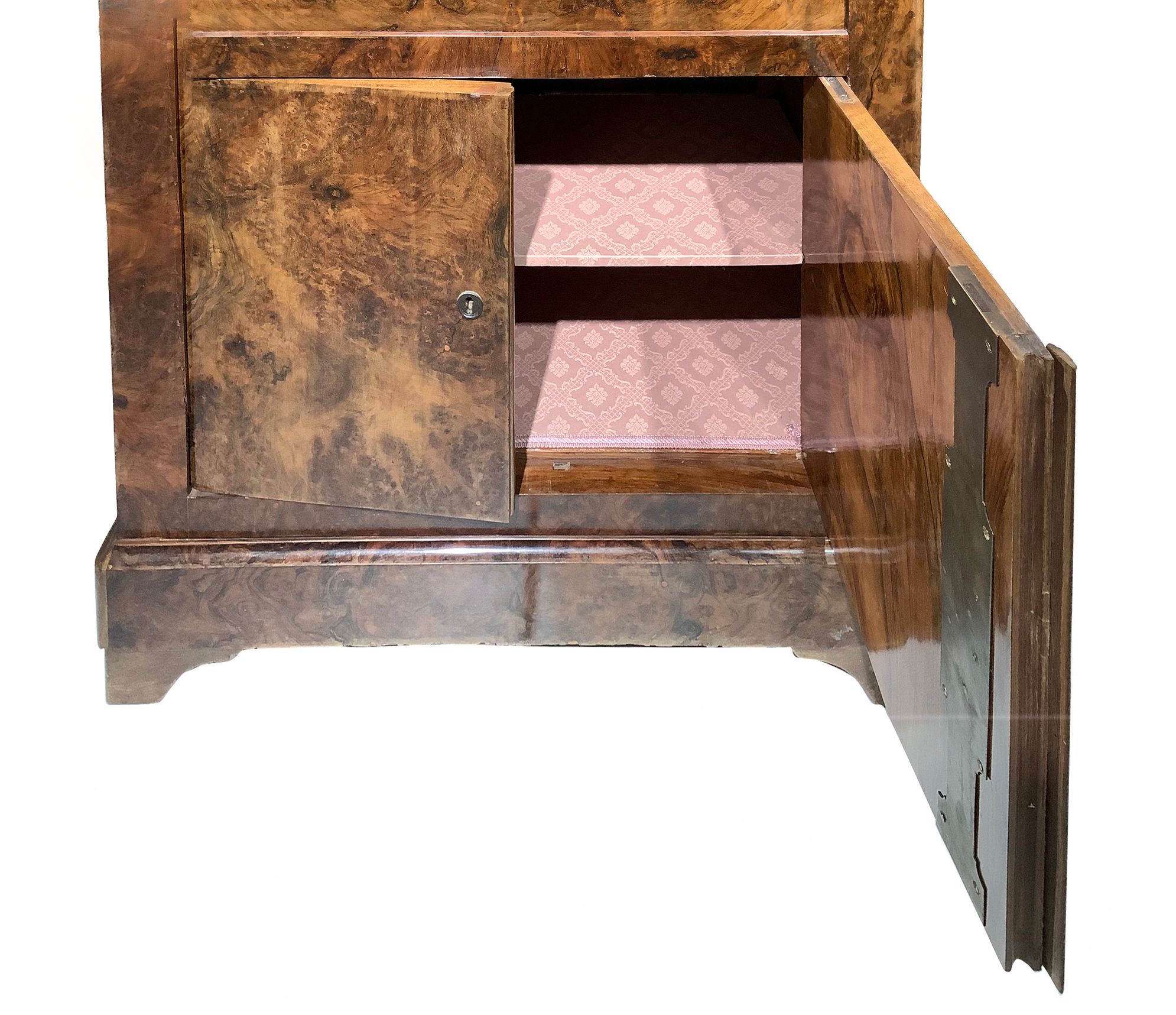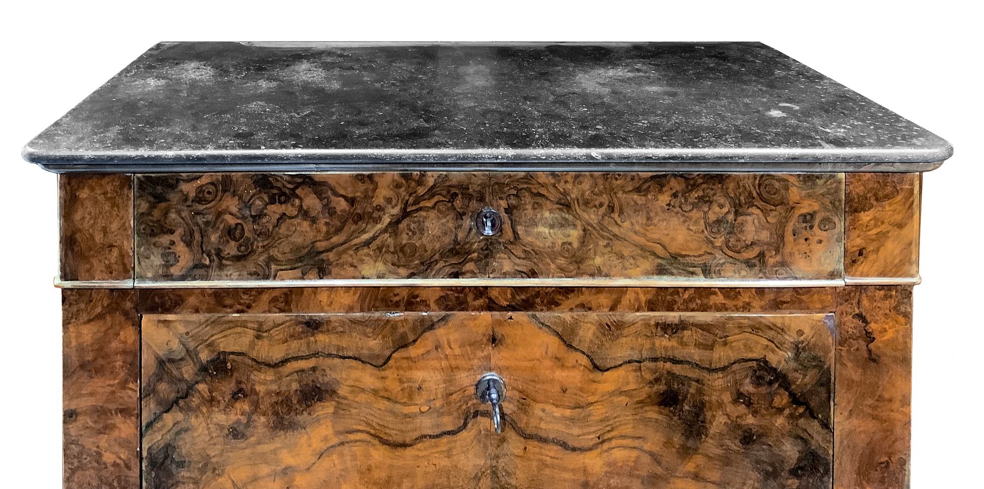 Secrétaire in legno rivestito in radica di noce, XIX secolo. Piano in marmo...