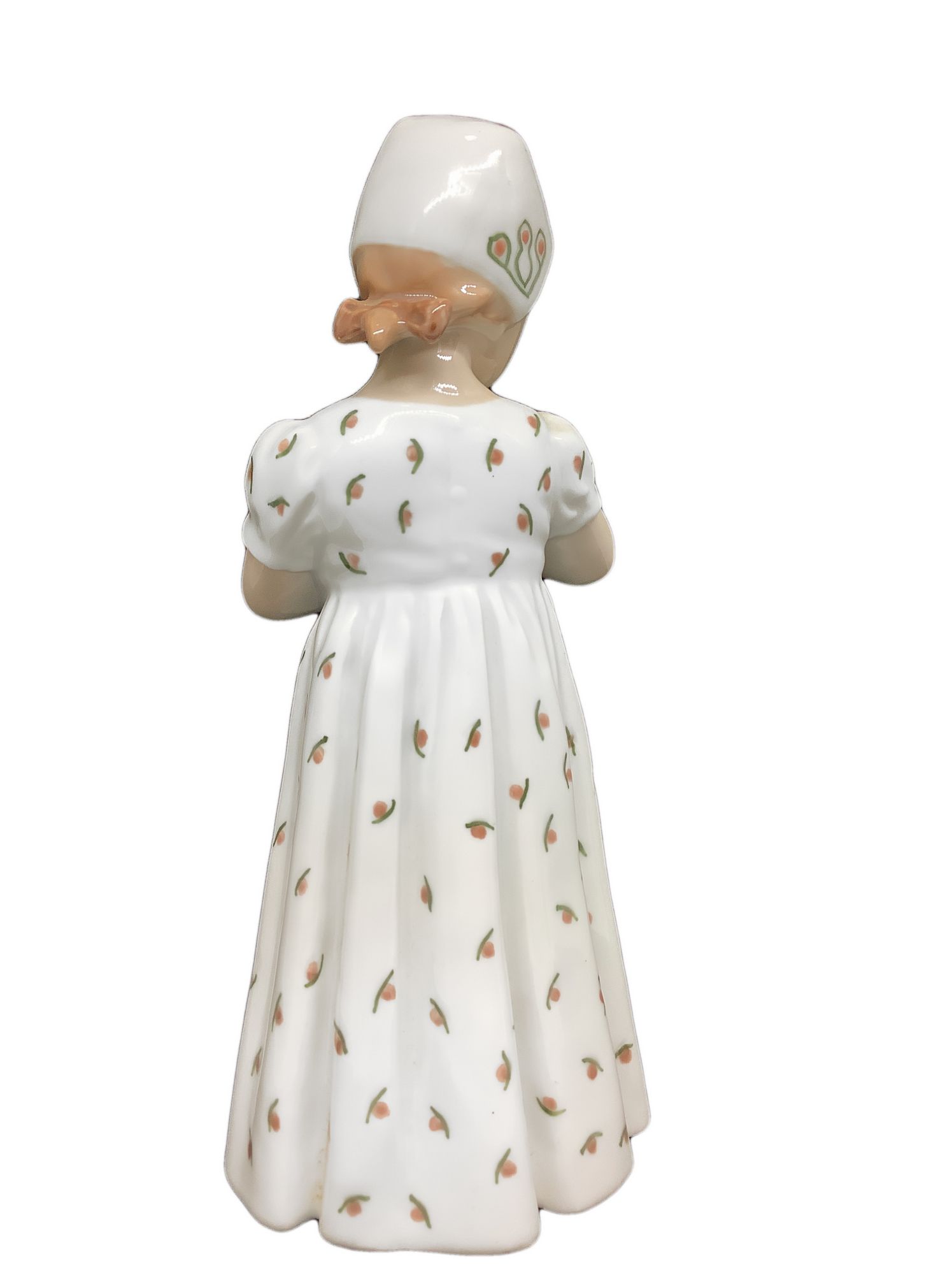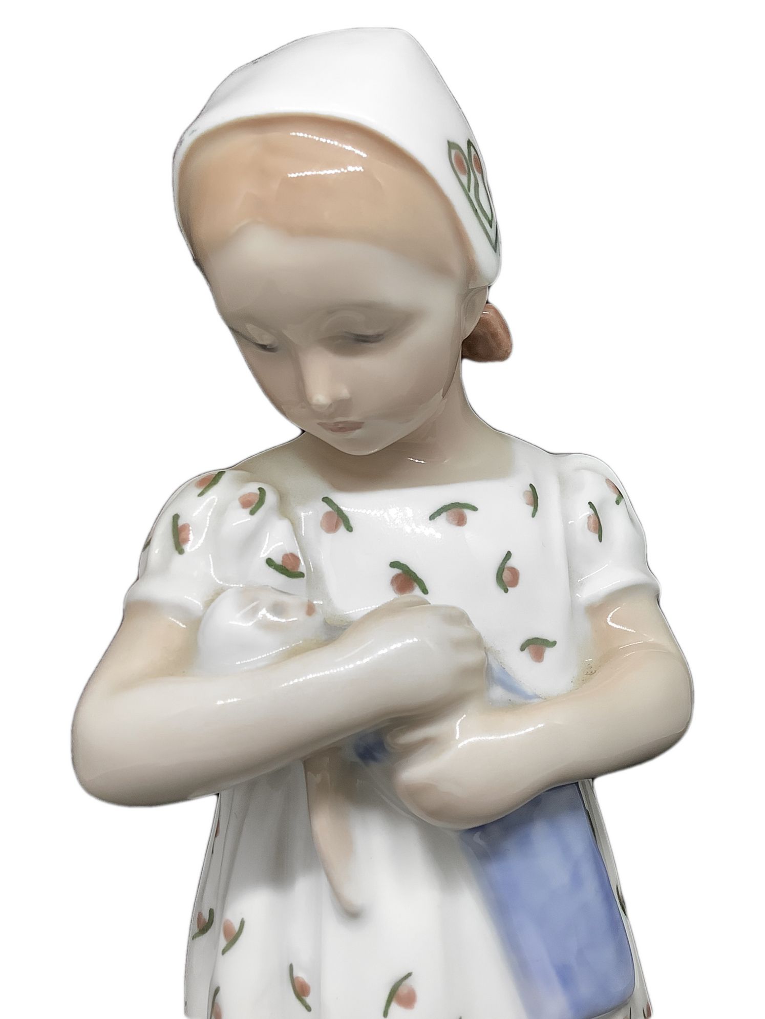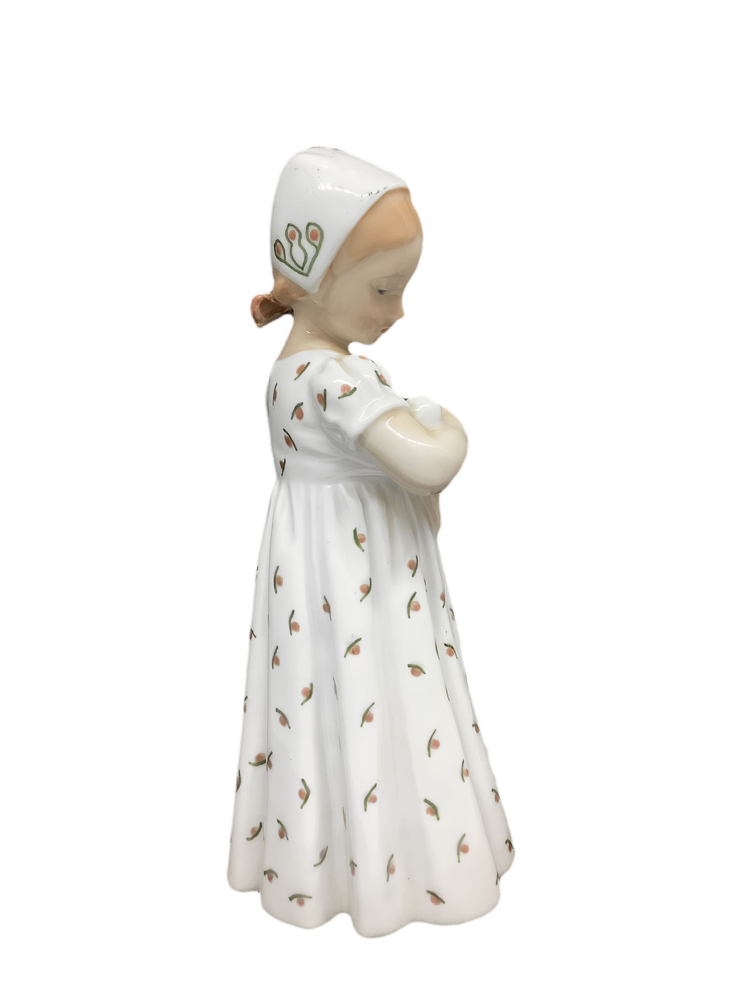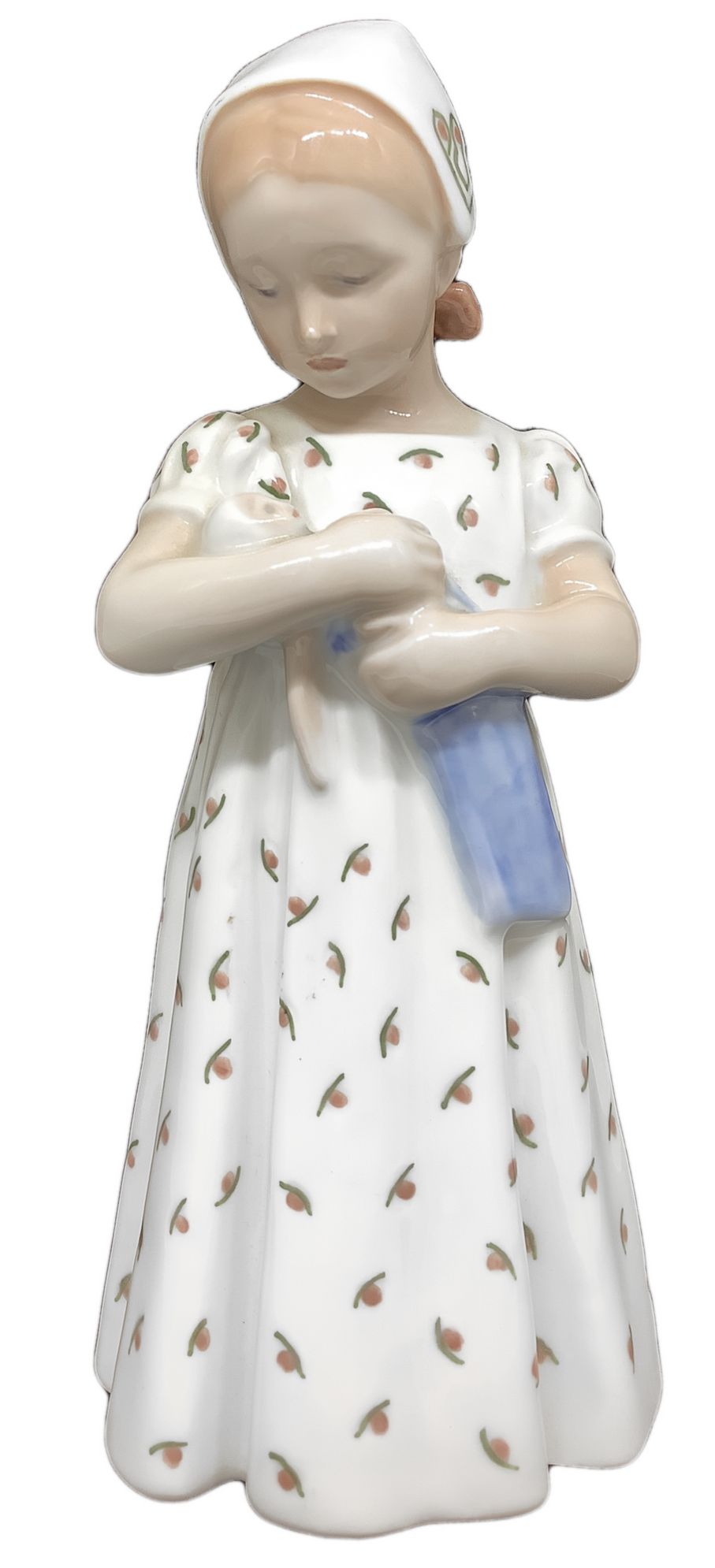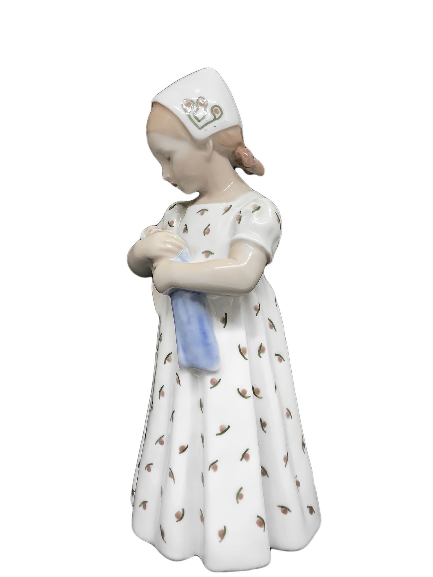 Statuina raffigurante bambina con vestito bianco e bambola, Manifattura Royal Copenaghen. H cm 20