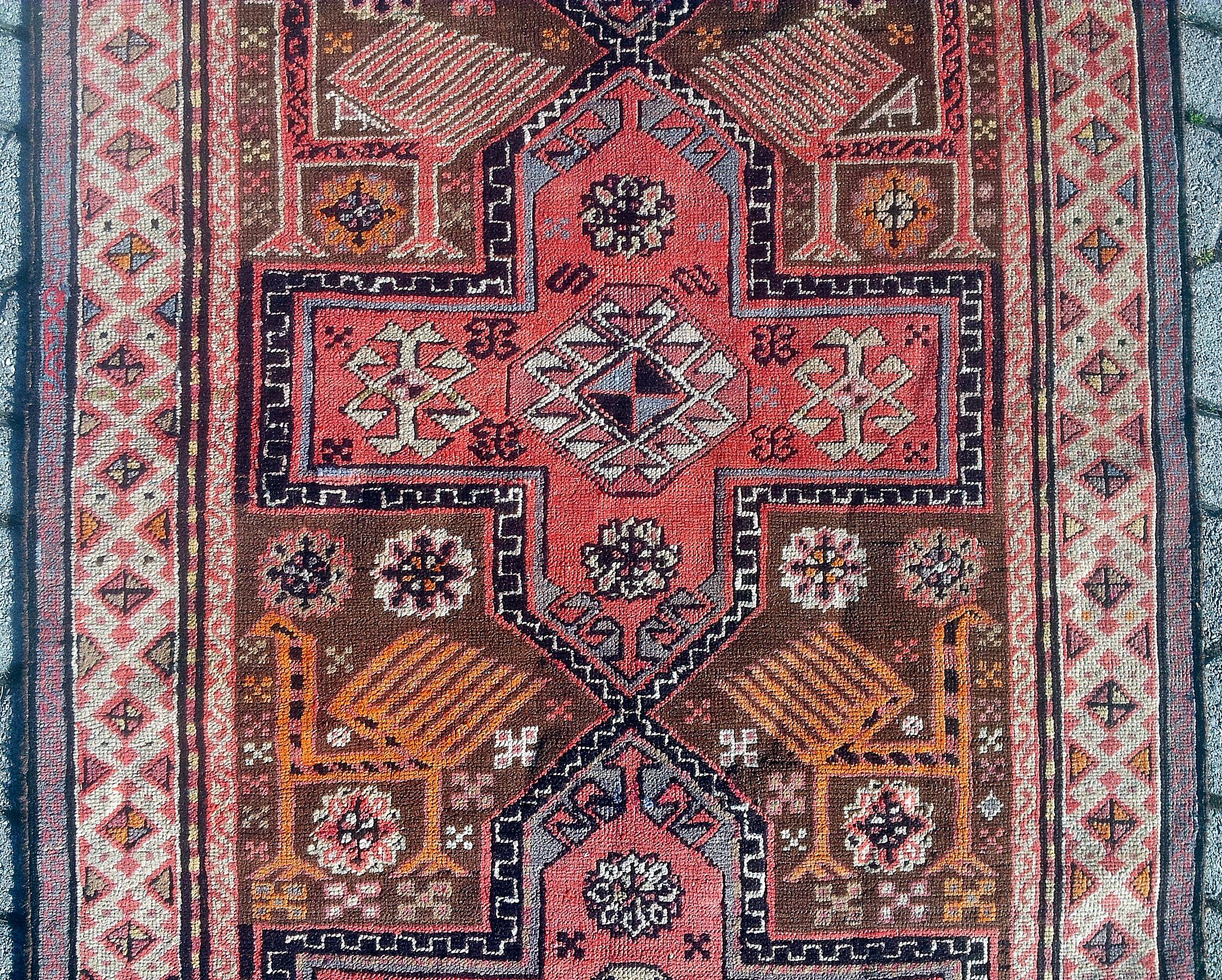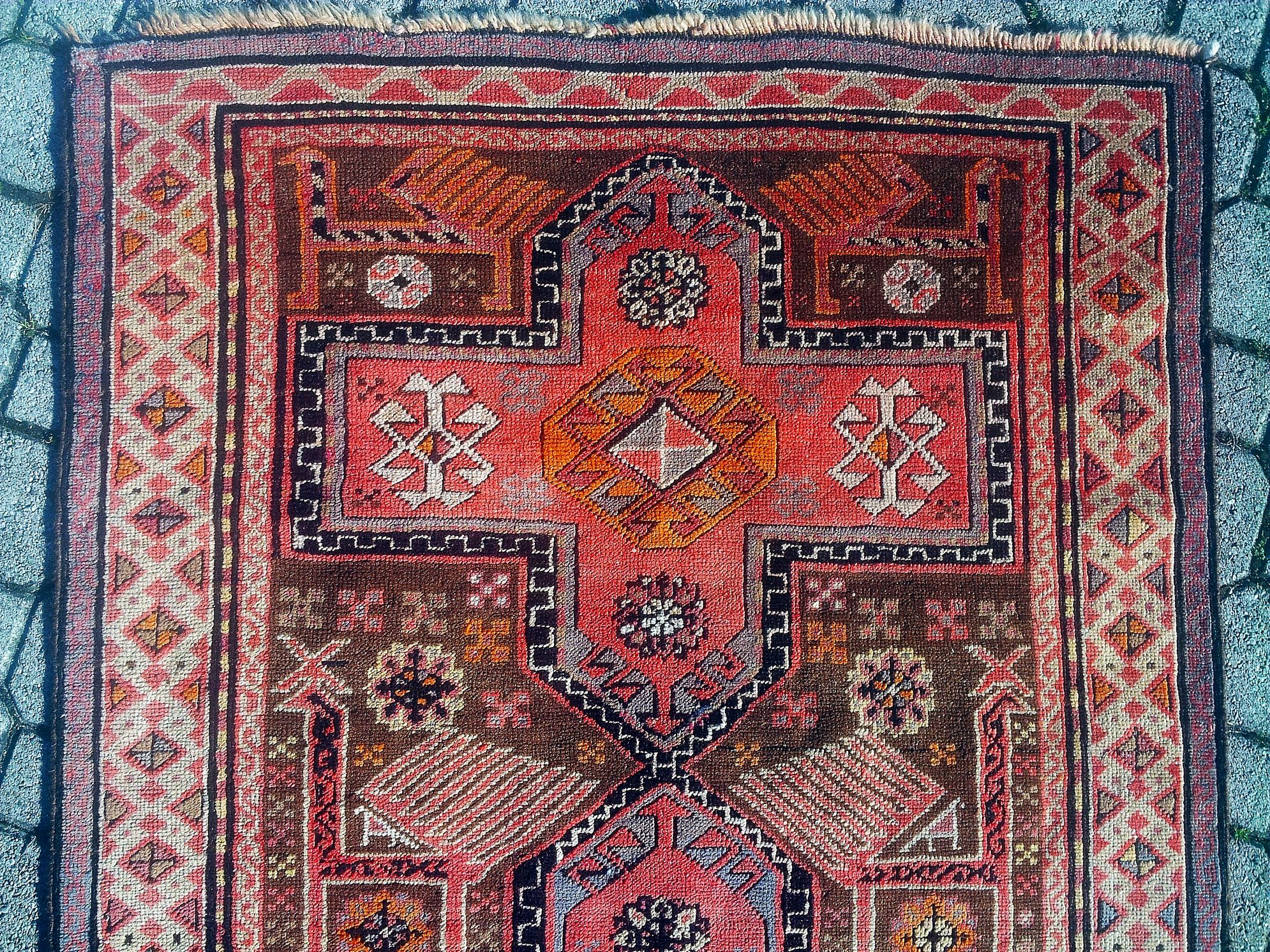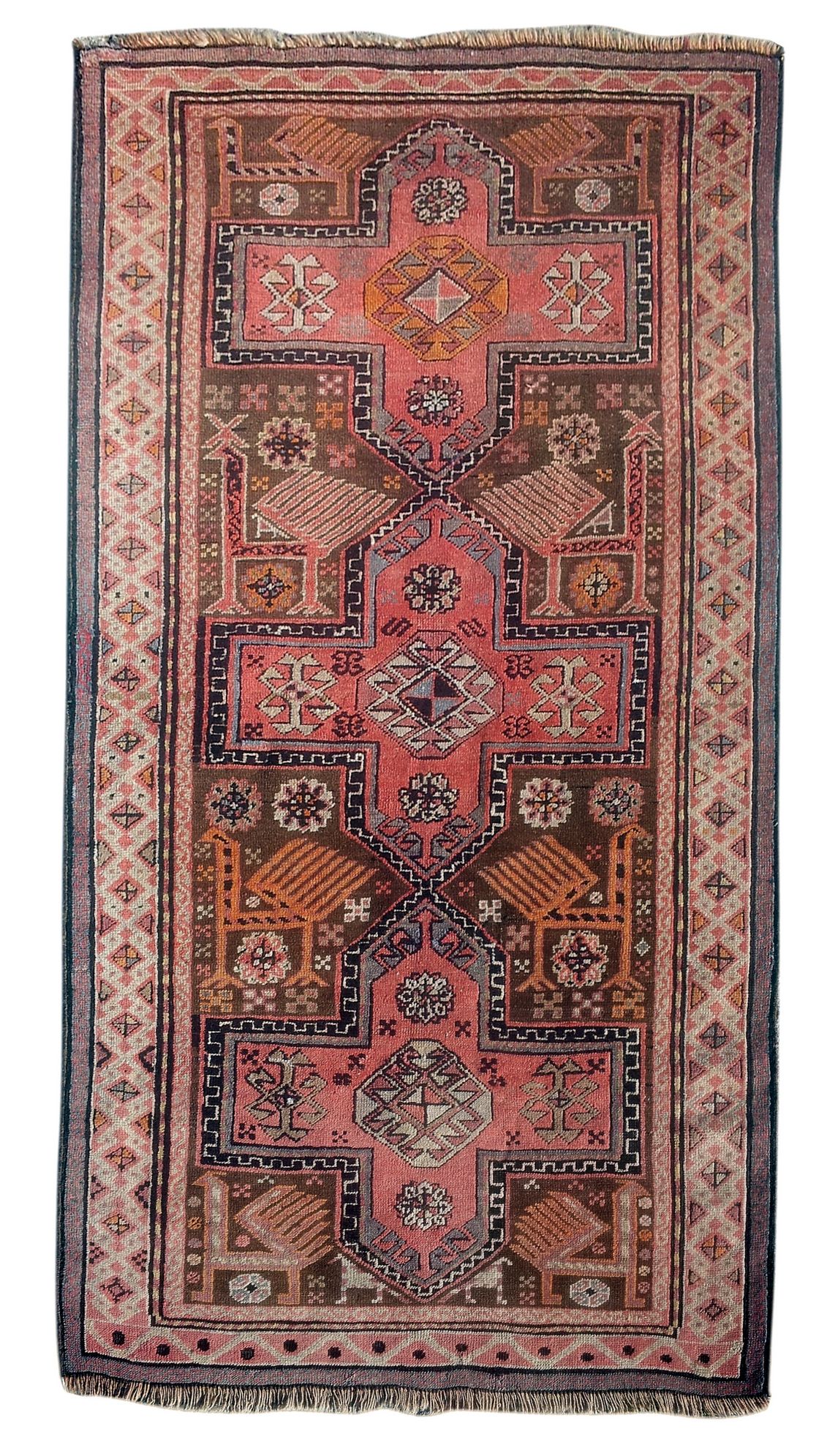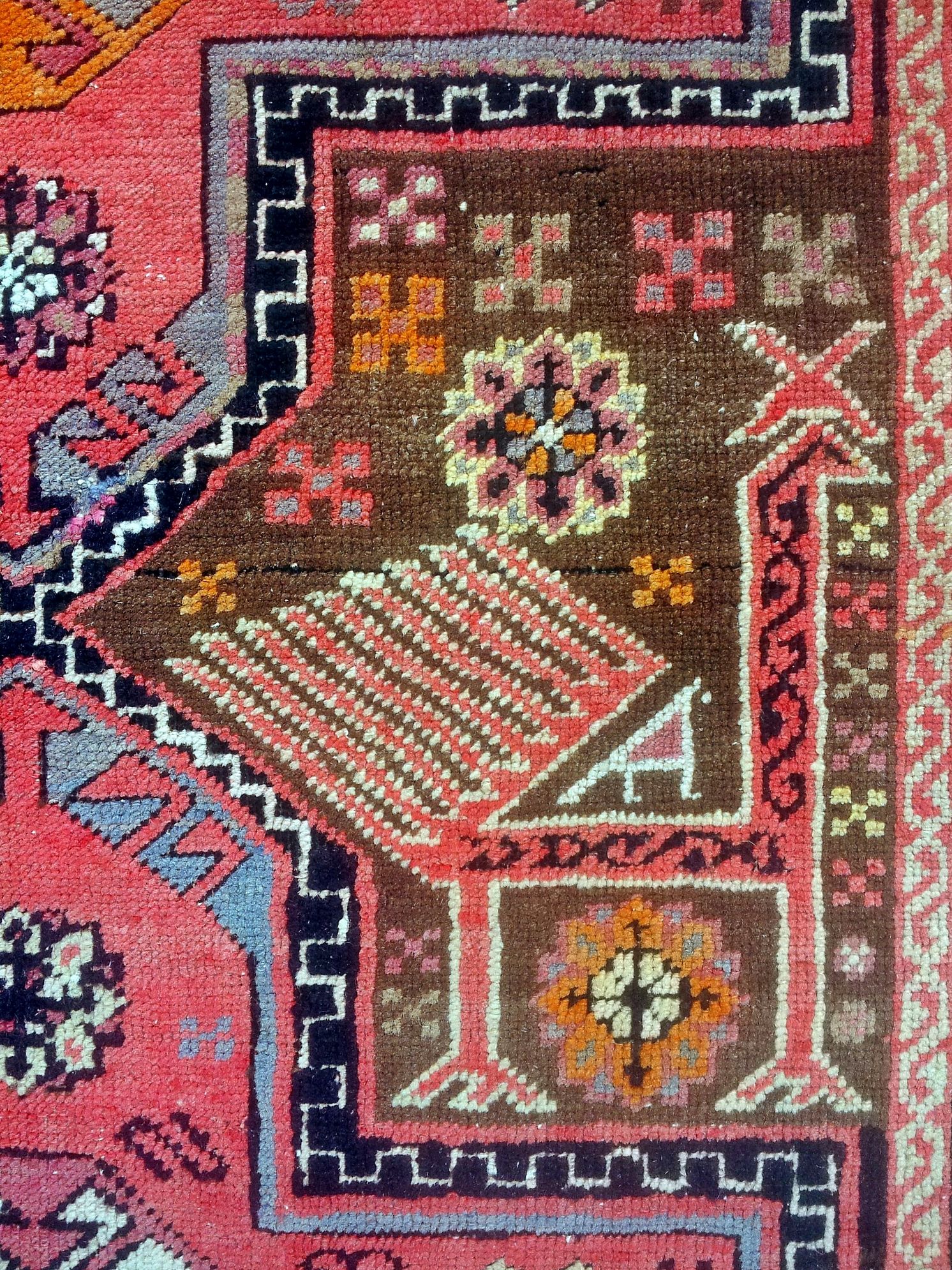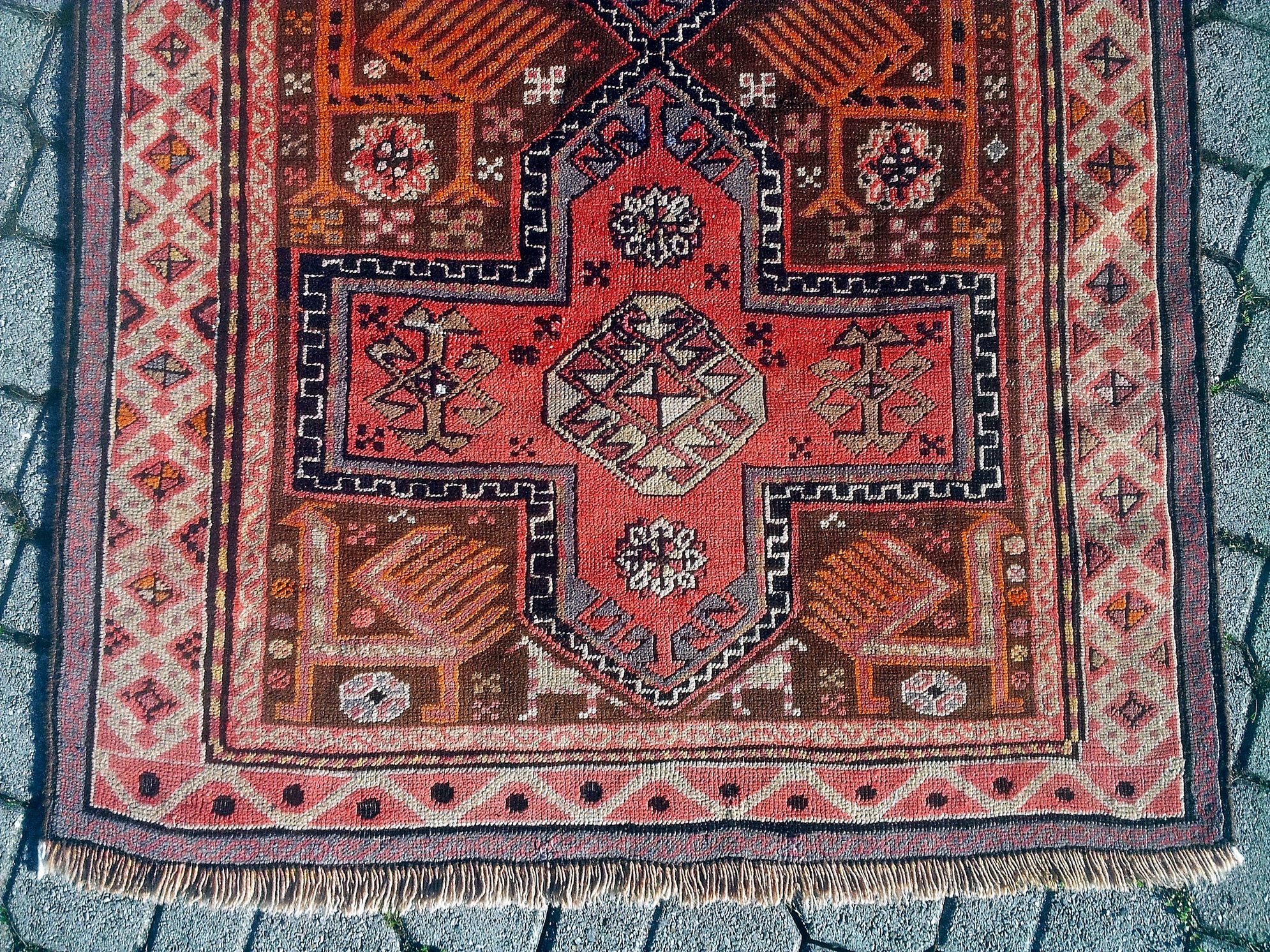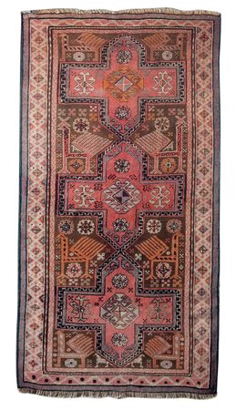 Tappeto Akstafa, Caucaso Meridionale, struttura simile ai Karabagh, inizio '900 , cm. 202x107, ordito, trama e vello di lana. Presenta alcune rilanature nel campo. Tipici medaglioni cruciformi su un inconsueto fondo senape, grandi uccelli con una folta coda