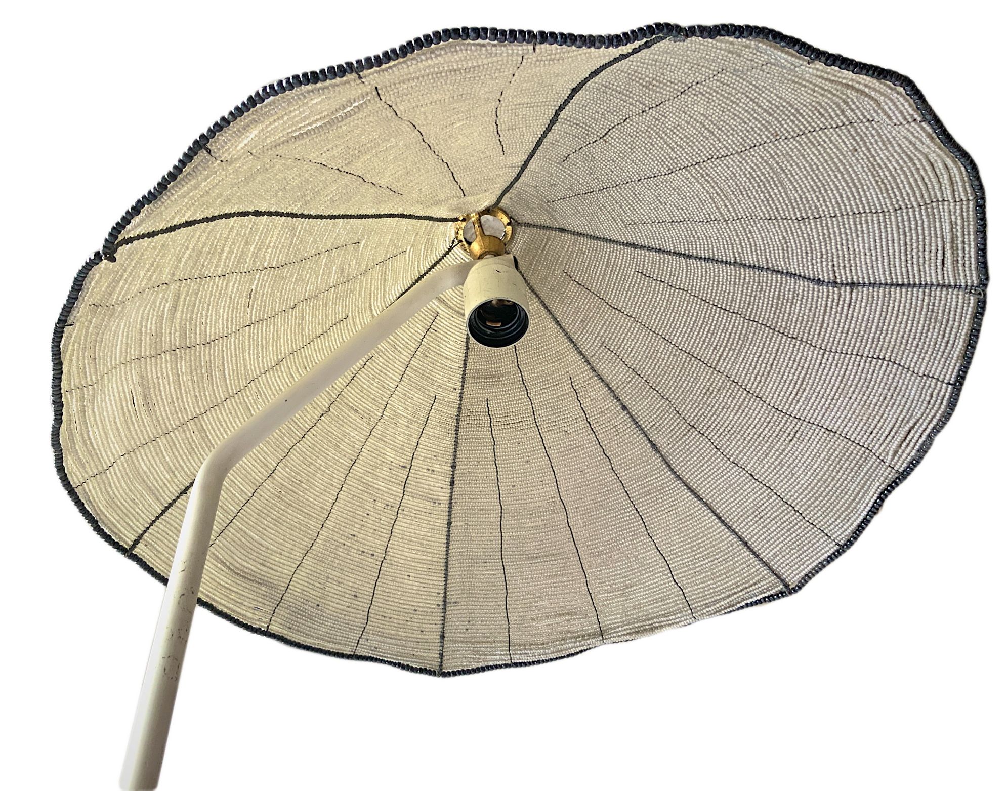 Leucos, disegno R. Pamio, modello Sarasar, lampada da terra, struttura in metallo laccato bianco finitura craquele colore bianco, diffusore costituito da piccole perle in vetro nei toni del del bianco e del nero, tracce di ossido. Anni 60 . Cm 165x41d