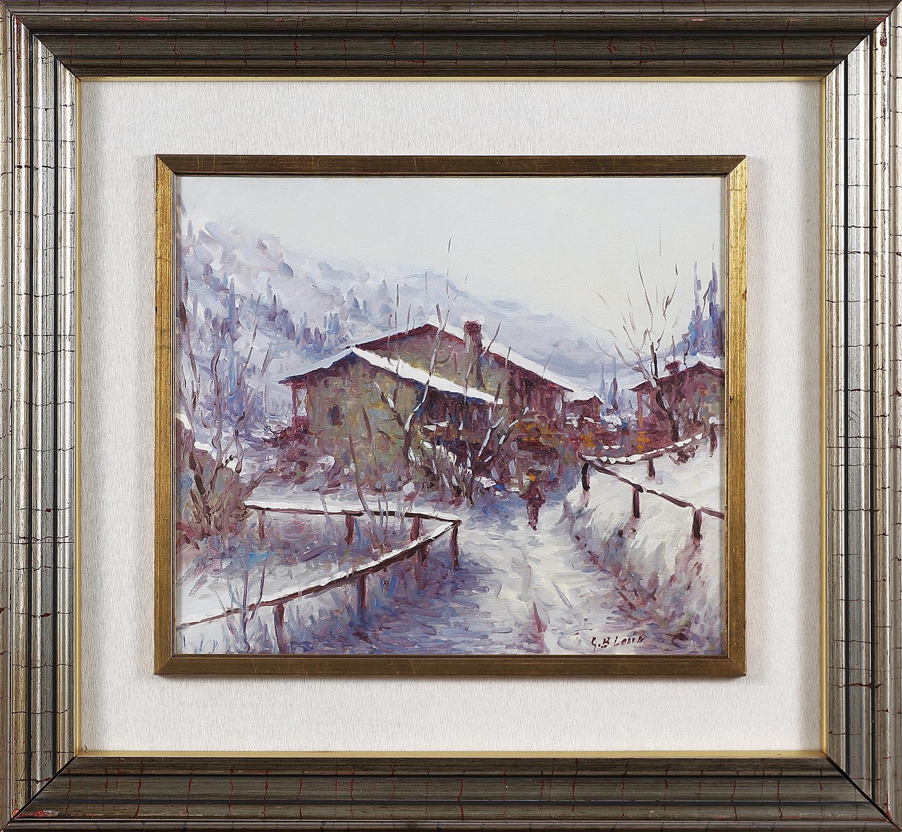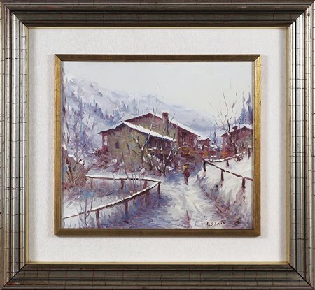LOSIO GIAN BATTISTA (n. 1940) Casale in inverno. Olio su tela. Cm 35,00 x 40,00. Firmato in basso a destra. Cornice presente