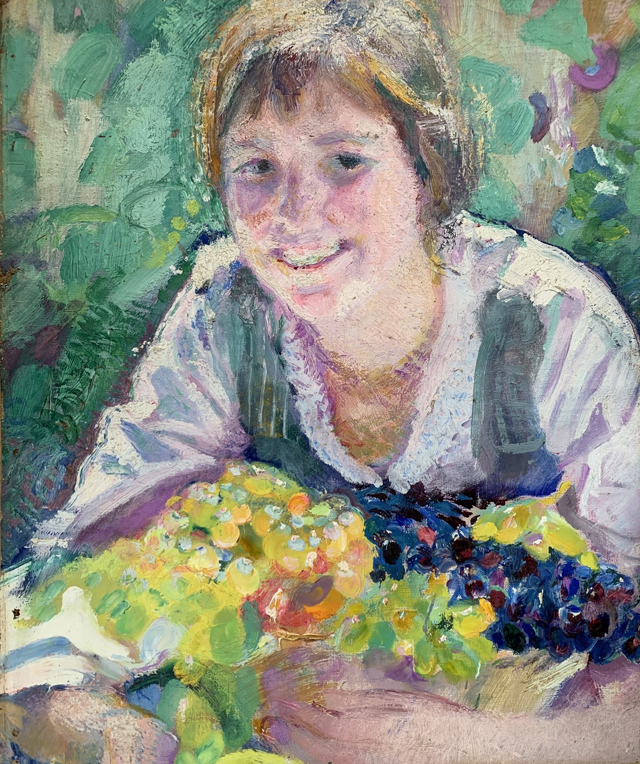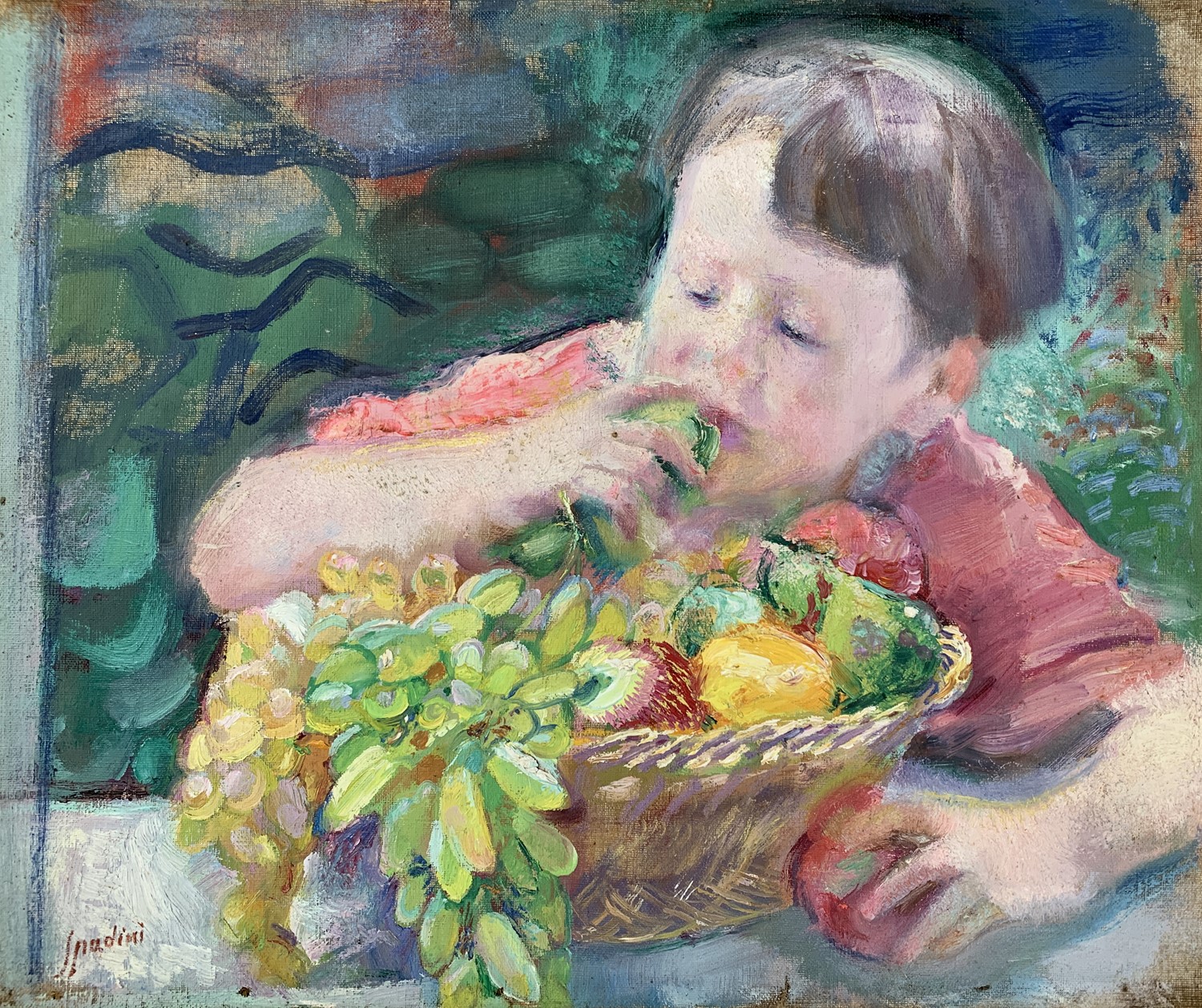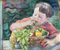 Sul retro, Mezza figura di bambino con canestro d'uva e frutta
