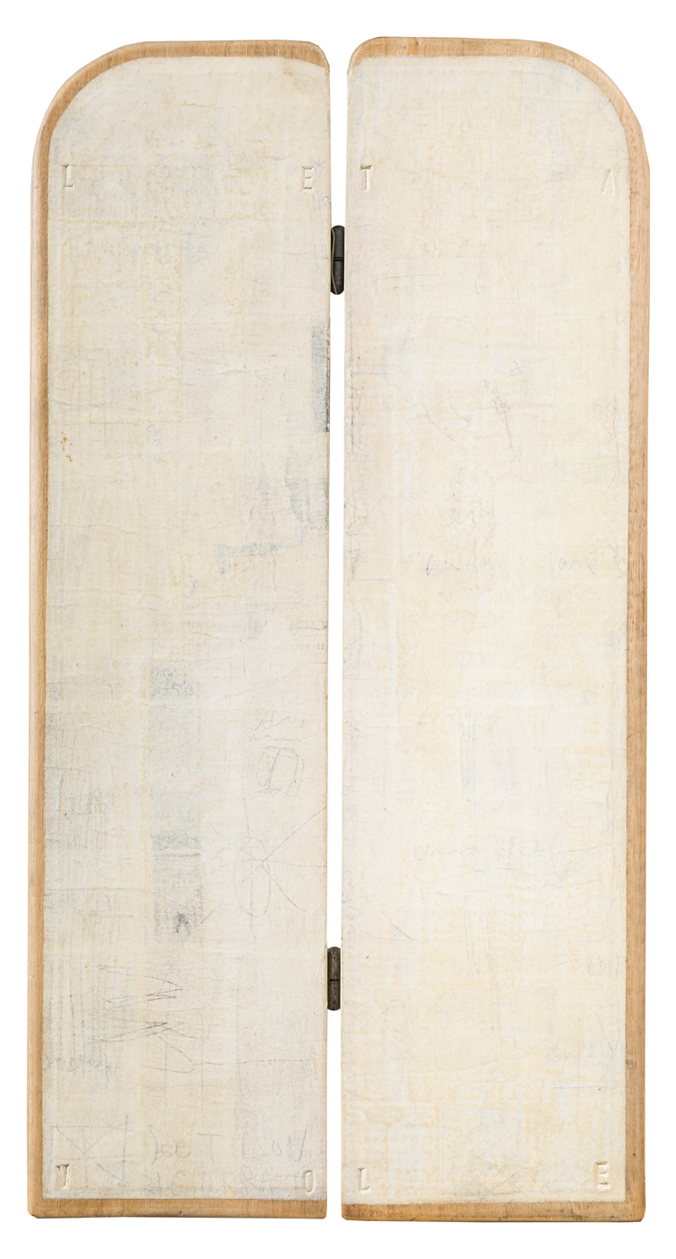 Tecnica mista e collage su tavola sagomata e incisa con apertura a libro