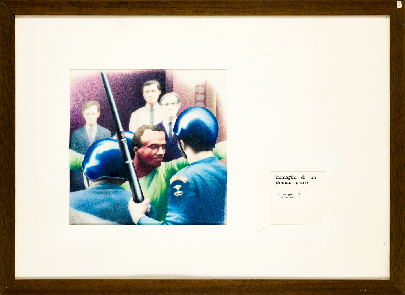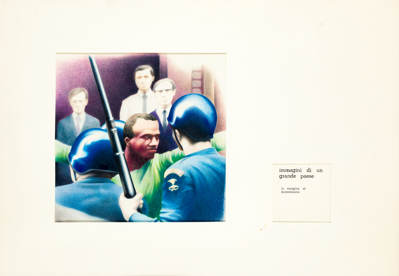 Opera composta da un disegno a tecnica mista su carta e un ritaglio di giornale applicati su carta
