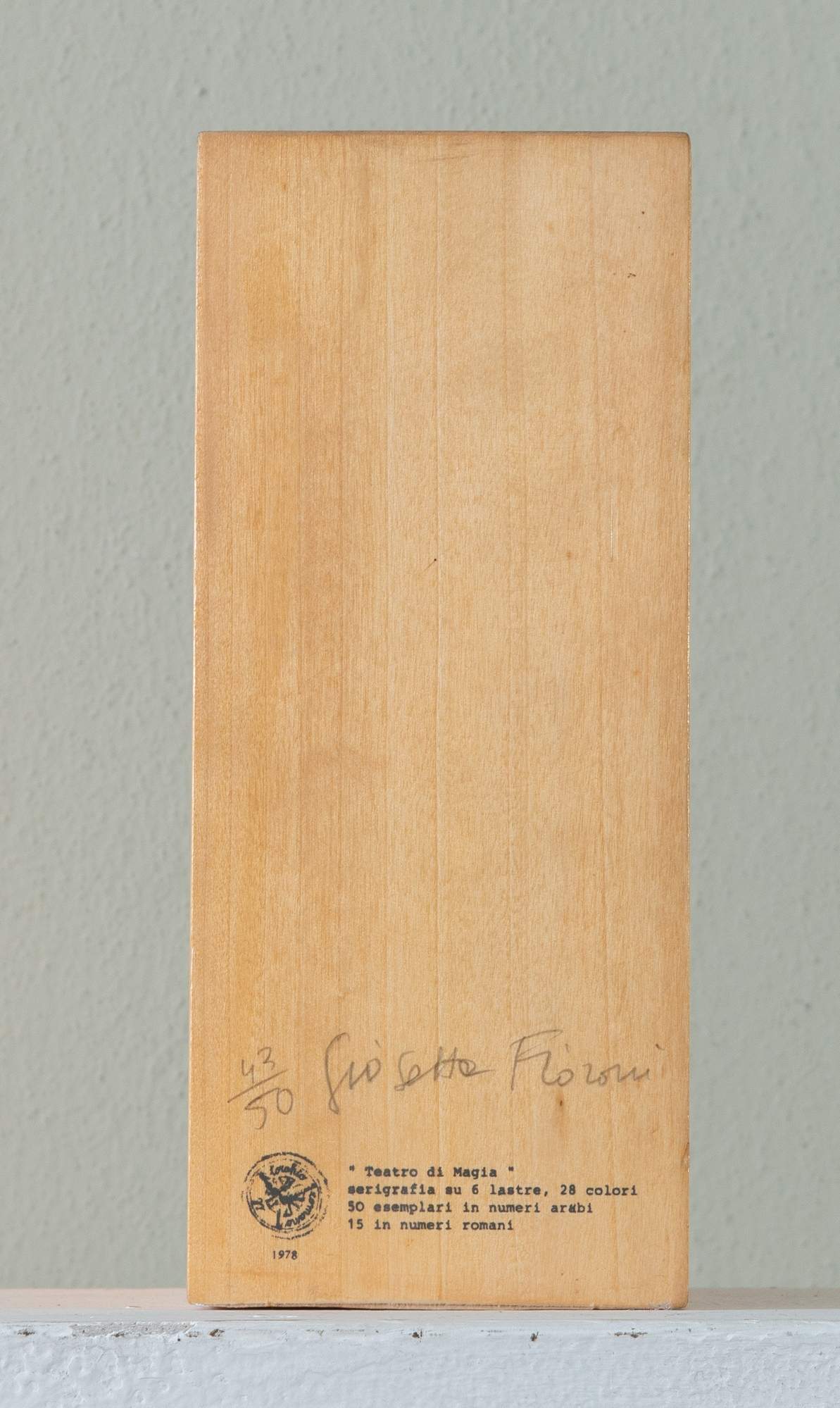 GIOSETTA FIORONI (Roma 1932) “Teatro di magia”, 1978. Cm 22x22x9. Serigrafia su sei lastre a 28 colori. Opera firmata Giosetta Fioroni. Numeri di tiratura 43/50. Opera realizzata dall’editore Il Torchio Romano. Opera accompagnata da certificato di autenticità.