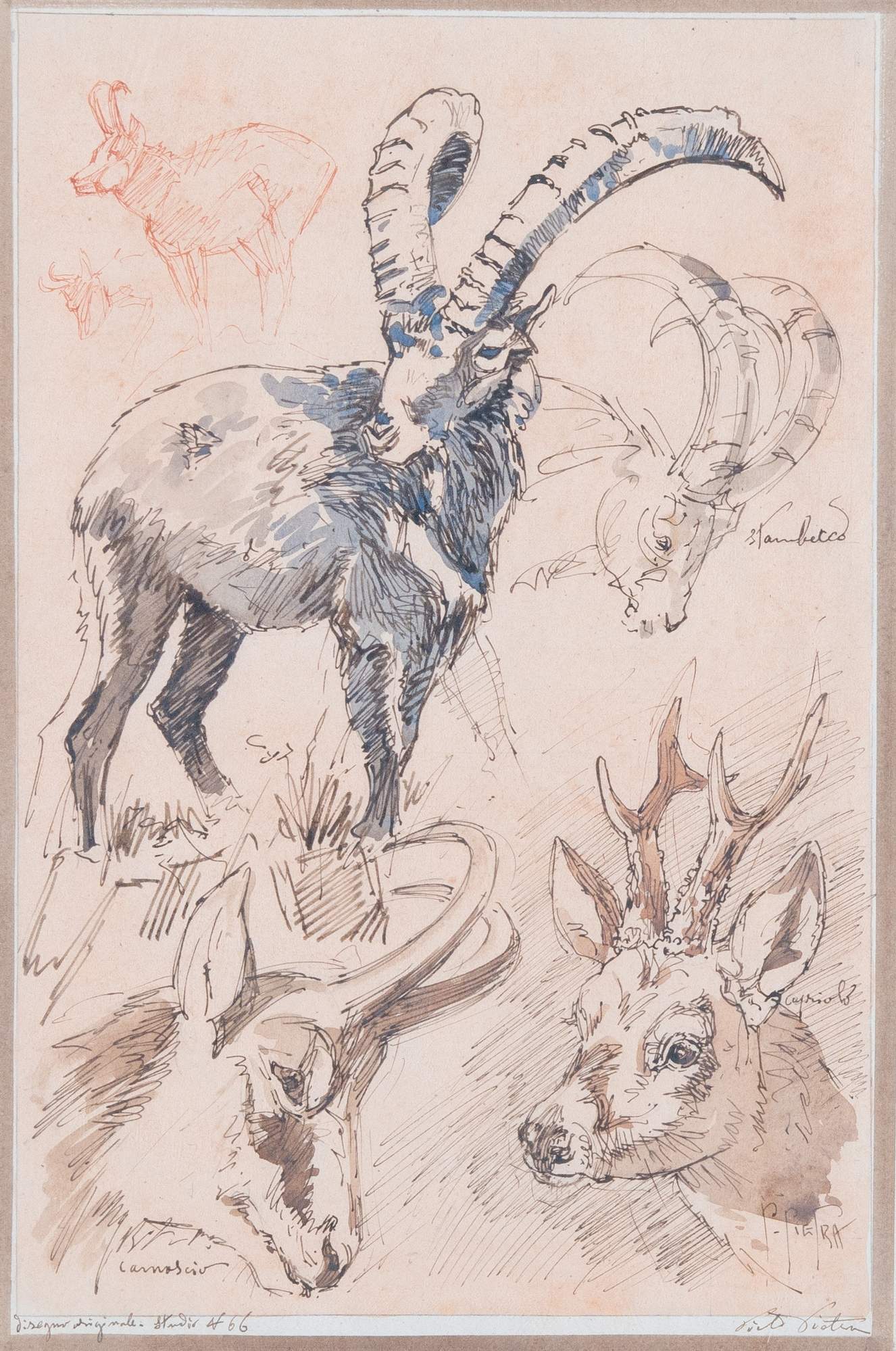 PIETRO PIETRA (Bologna 1885 – 1956) “Studio di animali”. Acquerello e tecnica mista su carta. Cm 37x25. Opera firmata in basso a destra Pietro Pietra. In basso a sinistra reca scritta Disegno originale. Studio n. 66.