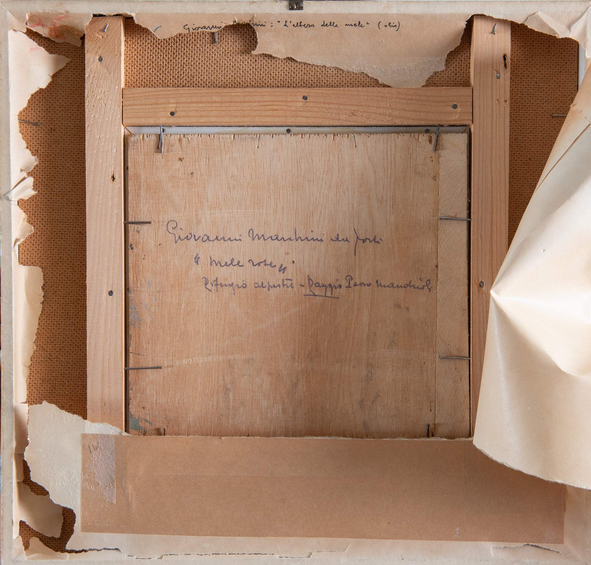 GIOVANNI MARCHINI (Forlì 1877 – 1946) “Mele rosa”. Olio su tavola. Cm 19,5x20,5. Opera firmata in basso a sinistra GMarchini. Al retro opera firmata intitolata Giovanni Marchini da Forlì Mele rosa. Al retro reca scritta Rifugio alpestre - Raggio Passo Mandrioli.