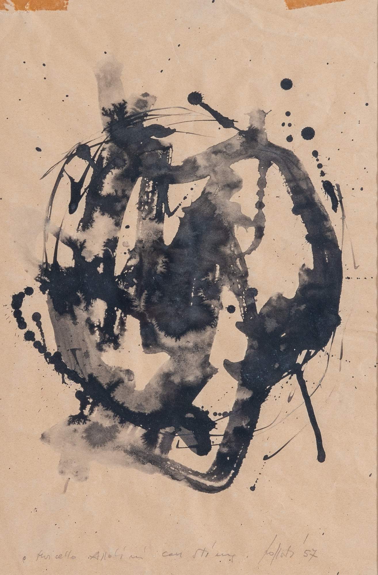 CONCETTO POZZATI (Vo’ 1935 – Bologna 2017) “Senza titolo” 1957. China su carta. Cm 31,5x21. Opera firmata e datata in basso a destra Pozzati ‘57. Opera dedicata in basso a sinistra.