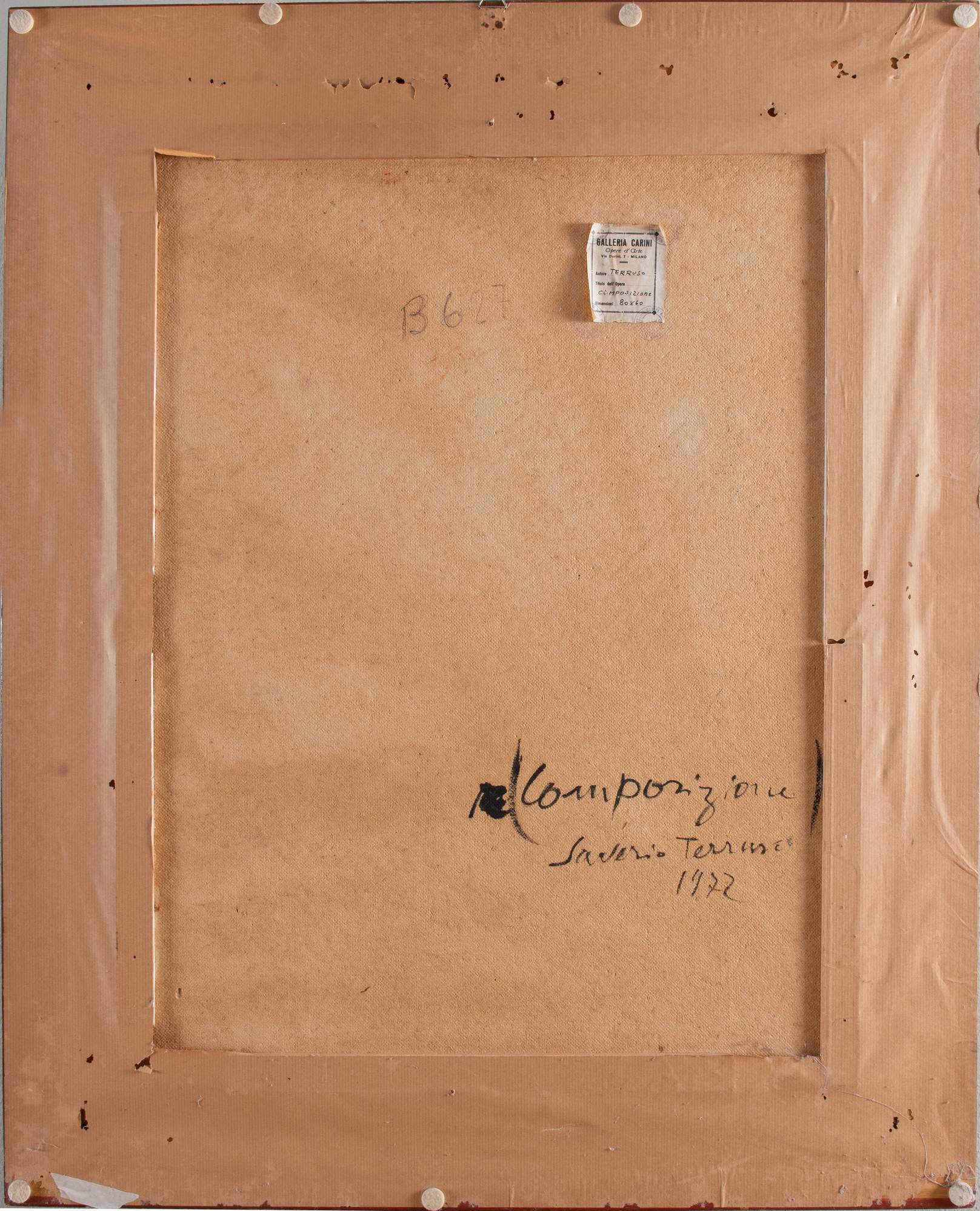 SAVERIO TERRUSO (Monreale 1939 - Milano 2003) “Composizione”, 1972. Olio su faesite. Cm 80x60. Opera firmata e datata in basso a destra Terruso ’72. Opera intitolata, firmata e datata al retro ‘Composizione' Saverio Terruso 1972. Al retro reca etichetta e timbri della Galleria Carini, Milano; reca inoltre iscrizione B 627.