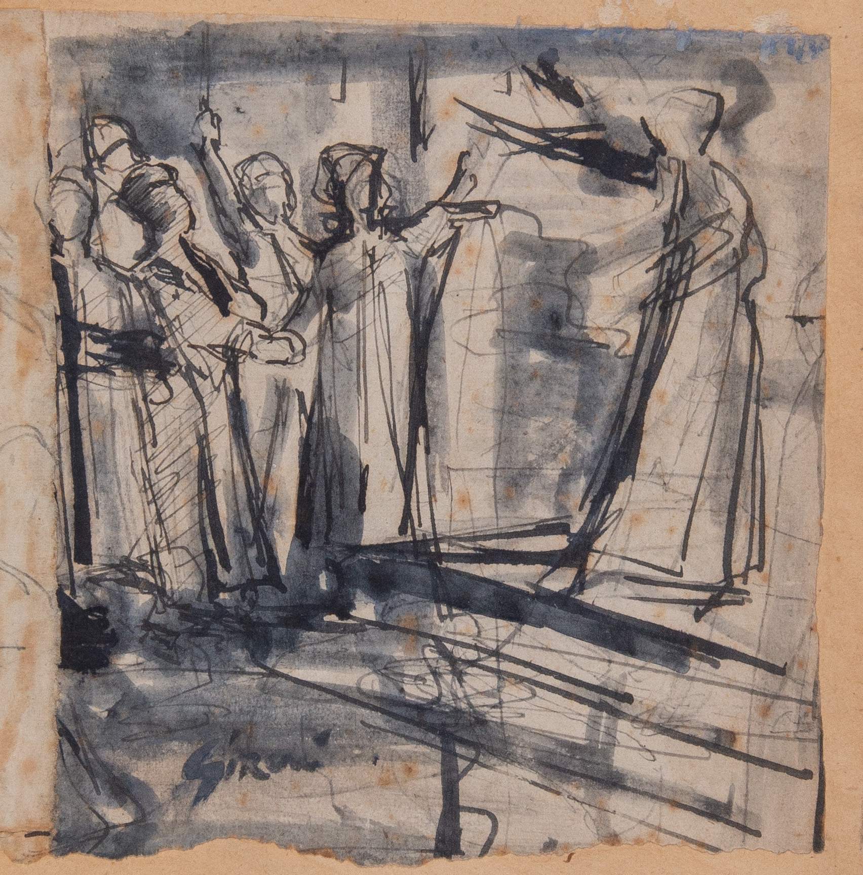 MARIO SIRONI (Sassari 1885 - Milano 1961) “Figure”. China e acquerello su carta. Cm 15x15,2. Opera firmata in basso al centro Sironi. Provenienza: importante collezione privata, Bologna.