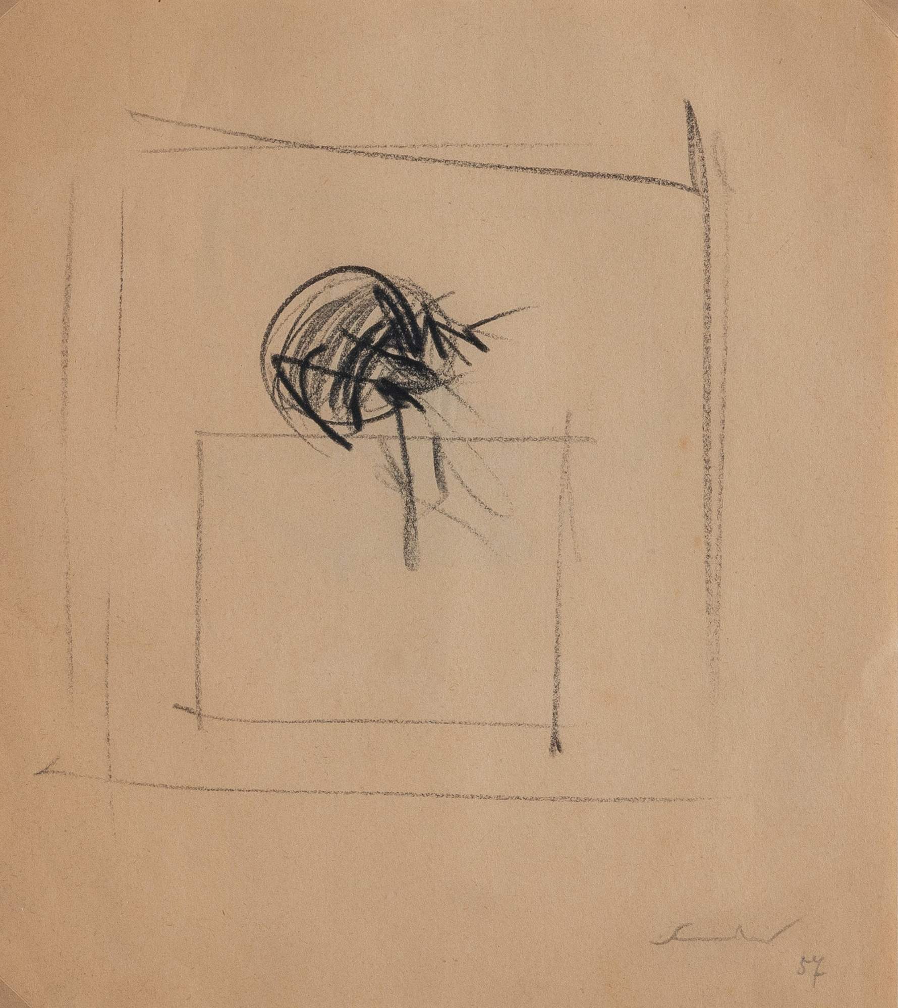 EMILIO SCANAVINO (Genova 1922 – Milano 1986) “Senza titolo”, 1957. Matita e carboncino su carta. Cm 24x21,3. Opera firmata e datata in basso Scanavino '57. Al retro reca etichetta La Scaletta, galleria ed edizione d’arte Reggio Emilia. Opera accompagnata da autentica su fotografia a cura di Giorgina Scanavino e con etichetta della Galleria d’arte La Scaletta, Reggio Emilia. Bibliografia: "i quaderni del disegno italiano. Emilio Scavanino, Carte: 1949 - 1972", ed. La Scaletta, 2006, pag. 13.