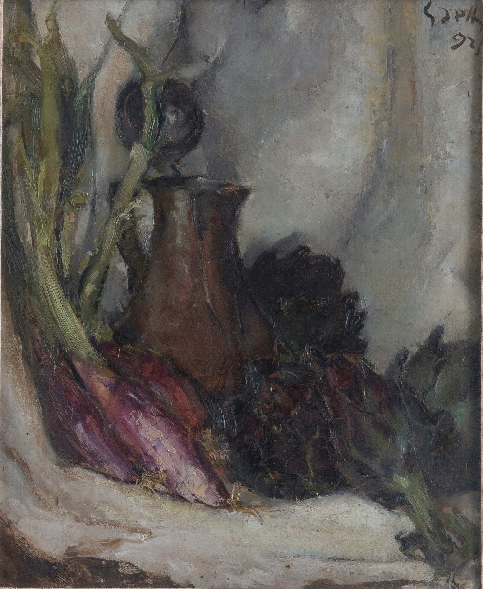 BRUNO SAETTI (Bologna 1902 – 1984) “Cipolle e carciofi”, 1925. Olio su legno. Cm 33x27,5. Opera firmata e datata in alto a destra Saetti 925. Al retro opera intitolata firmata e datata Cipolle e carciofi B. Saetti 1925.