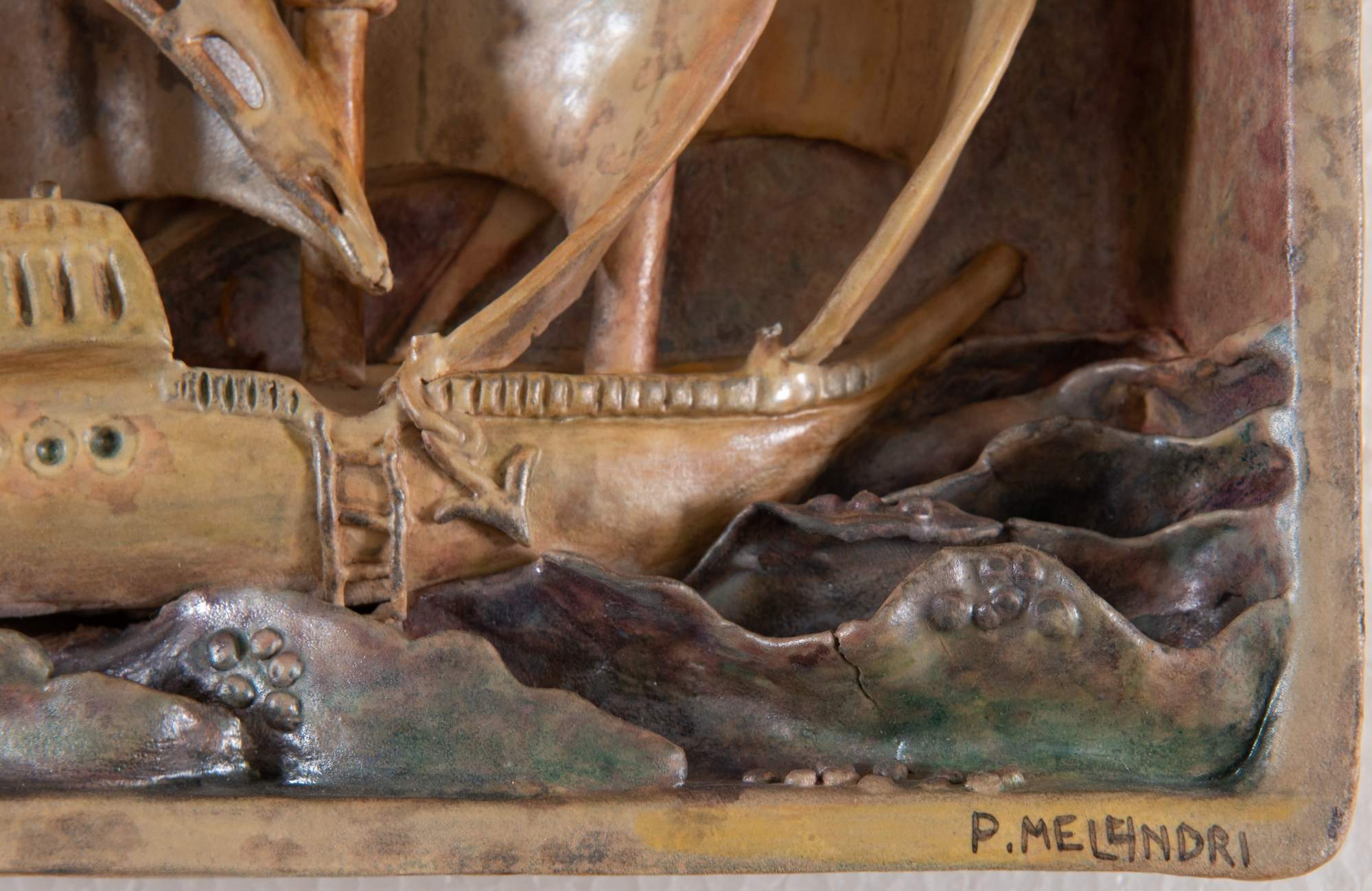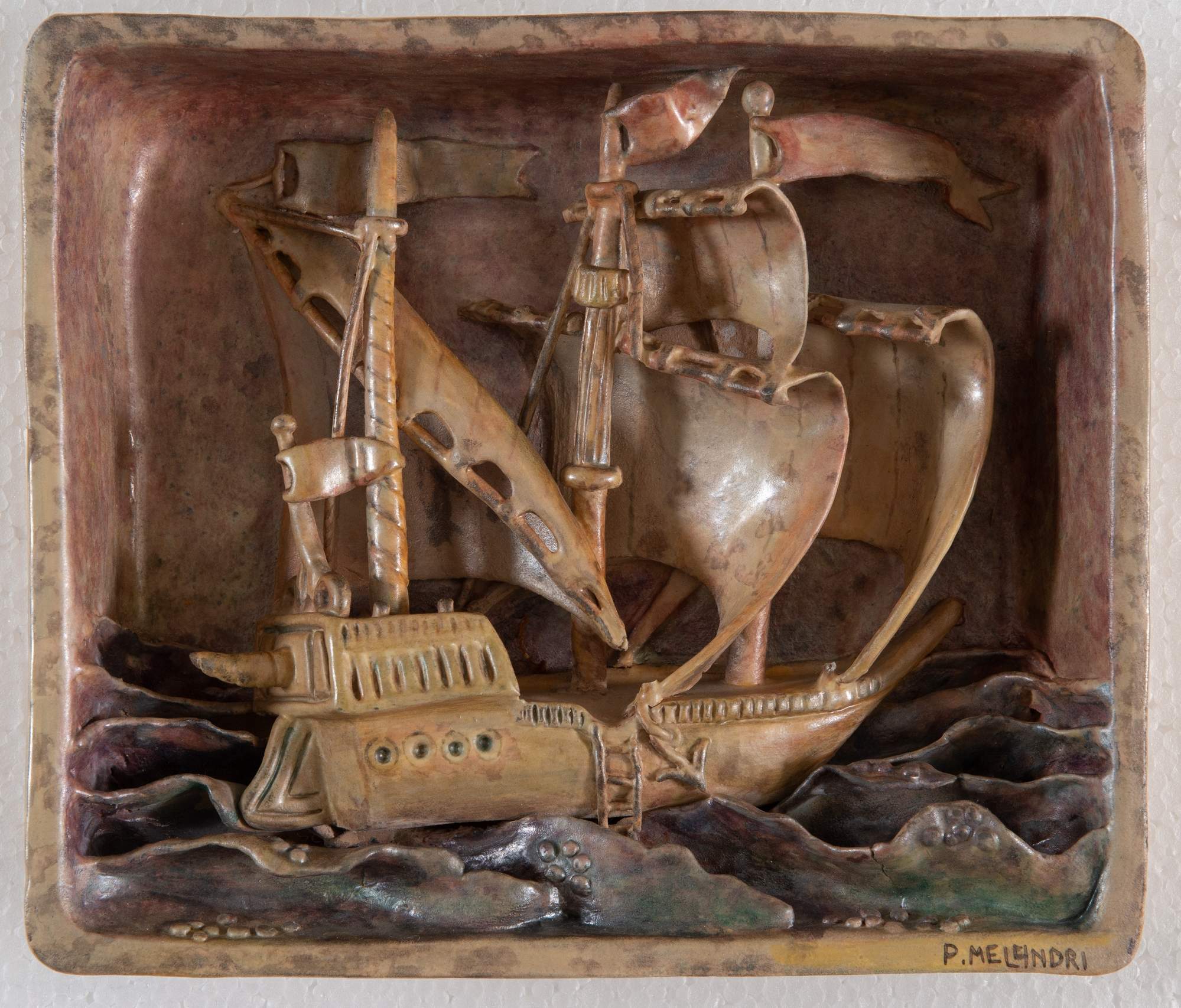 PIETRO MELANDRI (Faenza 1885 – 1976) “Galeone”. Scultura in ceramica smaltata. Cm 20x23x5,5. Opera firmata alla base P. Melandri.