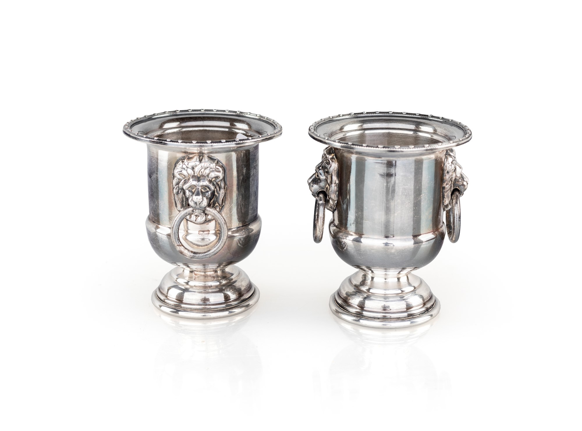 Coppia di piccoli vasi a cratere in metallo argentato, Sheffield - caratterizzati da manici ad anello trattenuti da protome leonina. - altezza cm 8