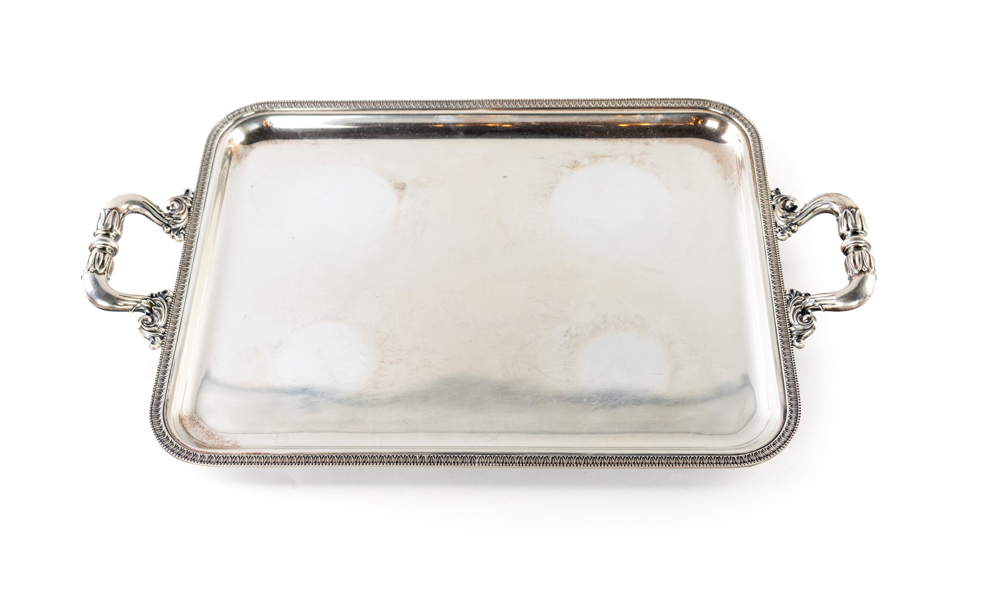 Grande vassoio in argento 800/1000 - di forma rettangolare con profilo a palmette e manici - cm 59x36,5 - gr. 1902