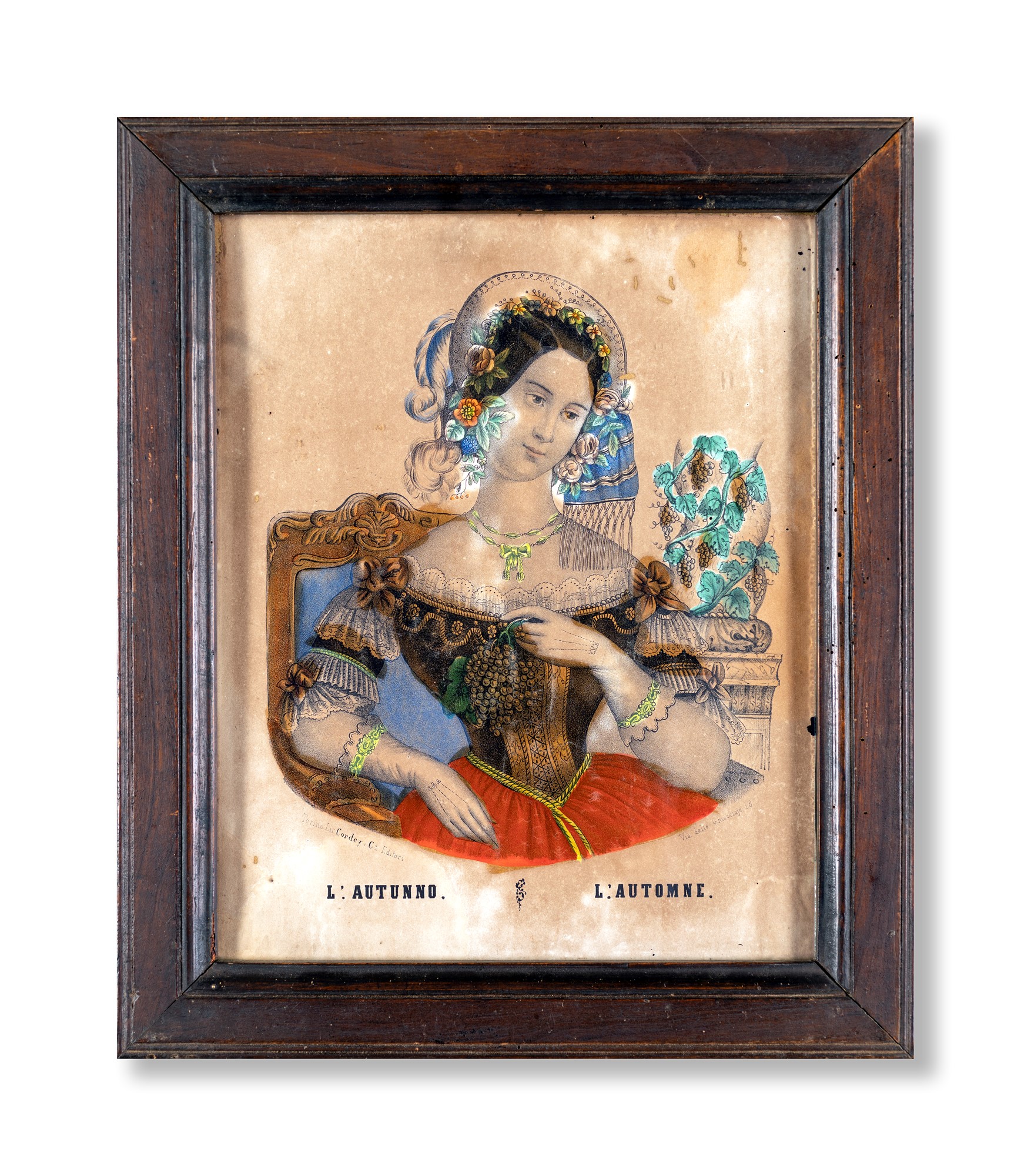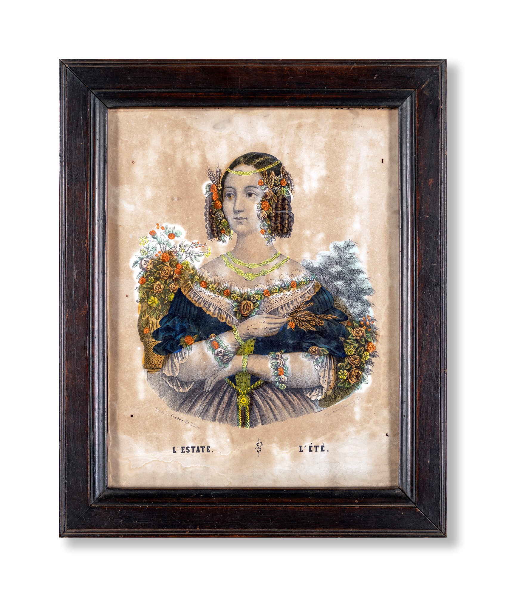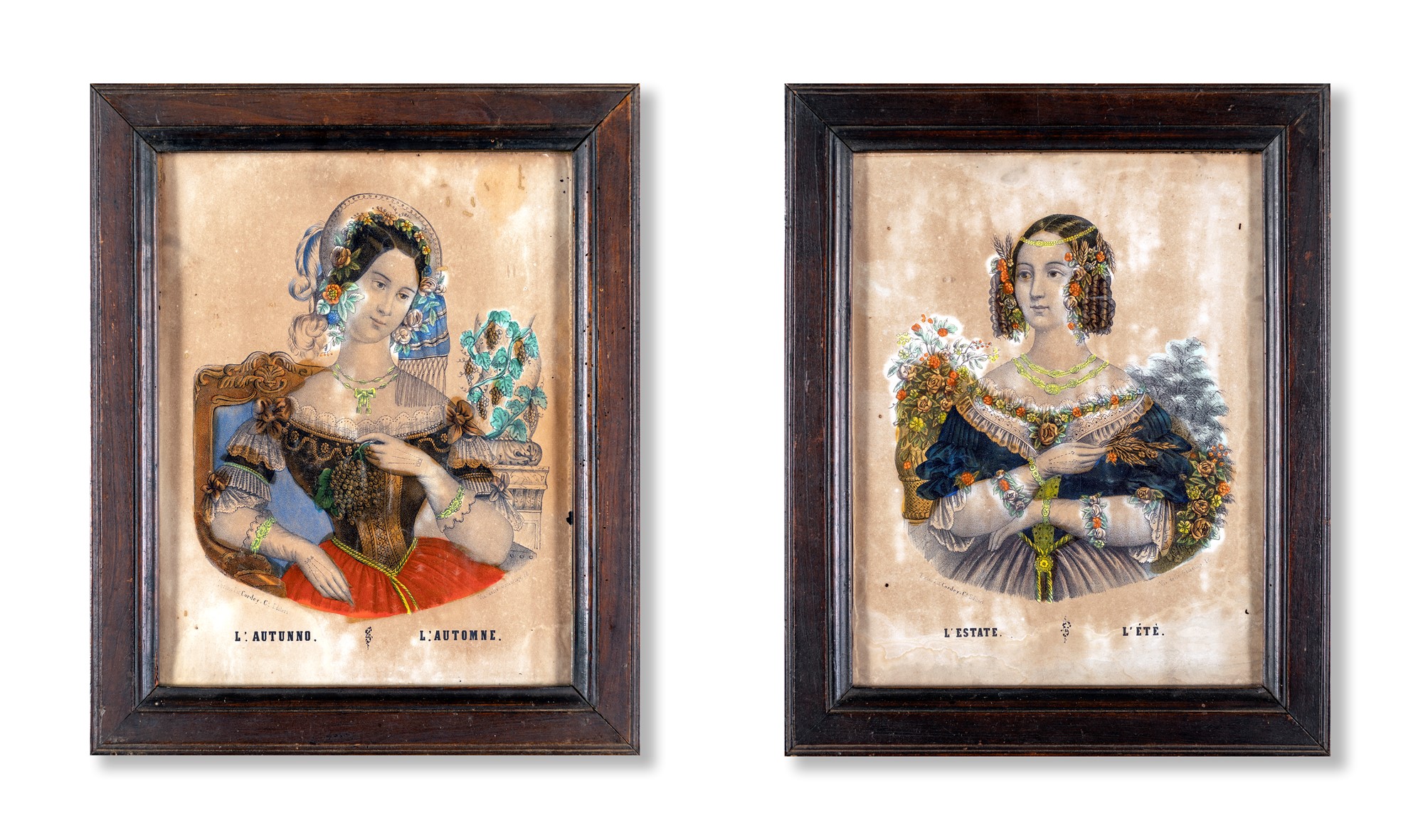 Coppia di litografie colorate, Torino, Cordey, metà XIX secolo - raffiguranti allegoria dell'Estate e dell'Autunno rappresentate da giovani donne ritratte con i rispettivi attributi allegorici. Cornici in legno naturale. - cm 42x35 (con la cornice)