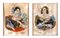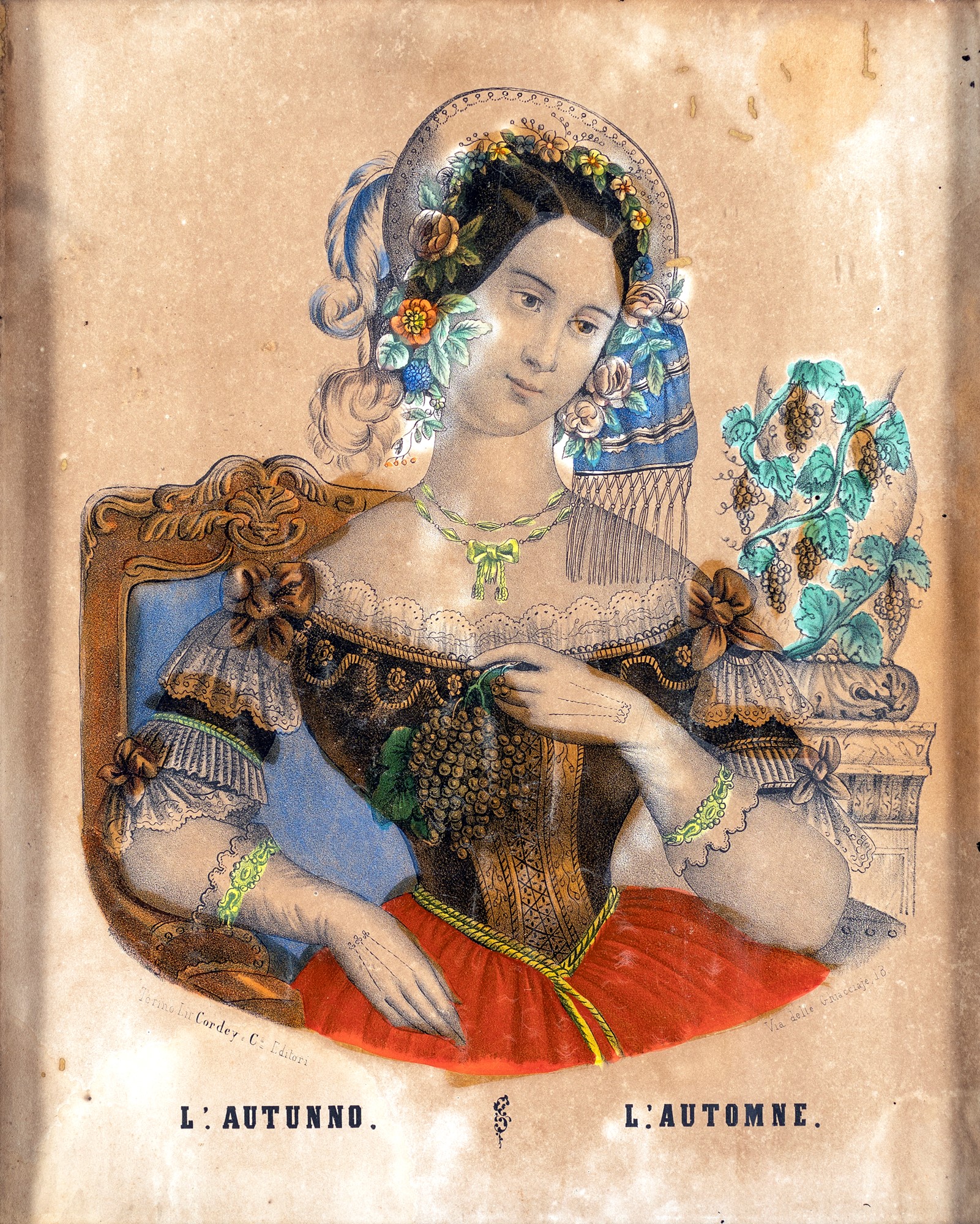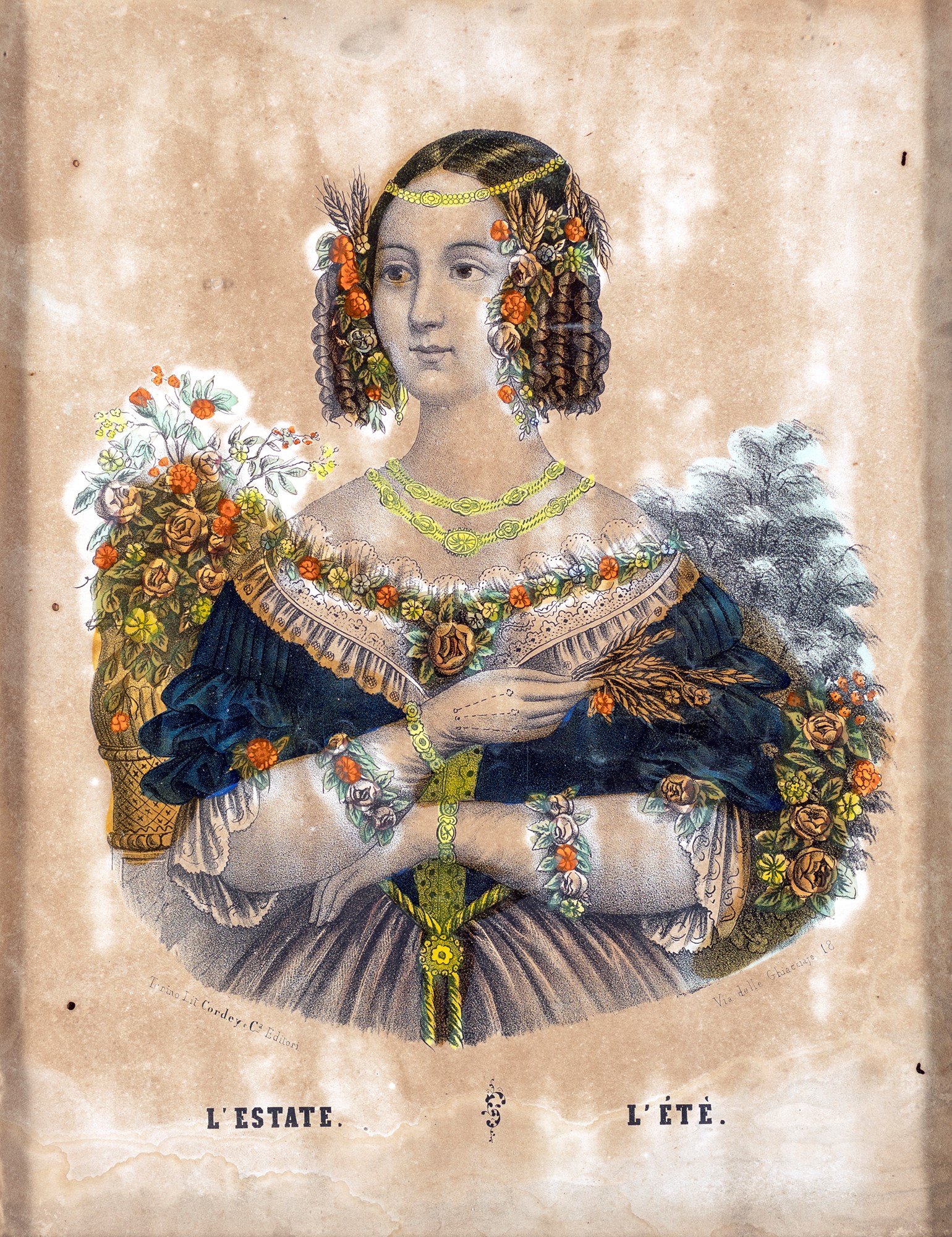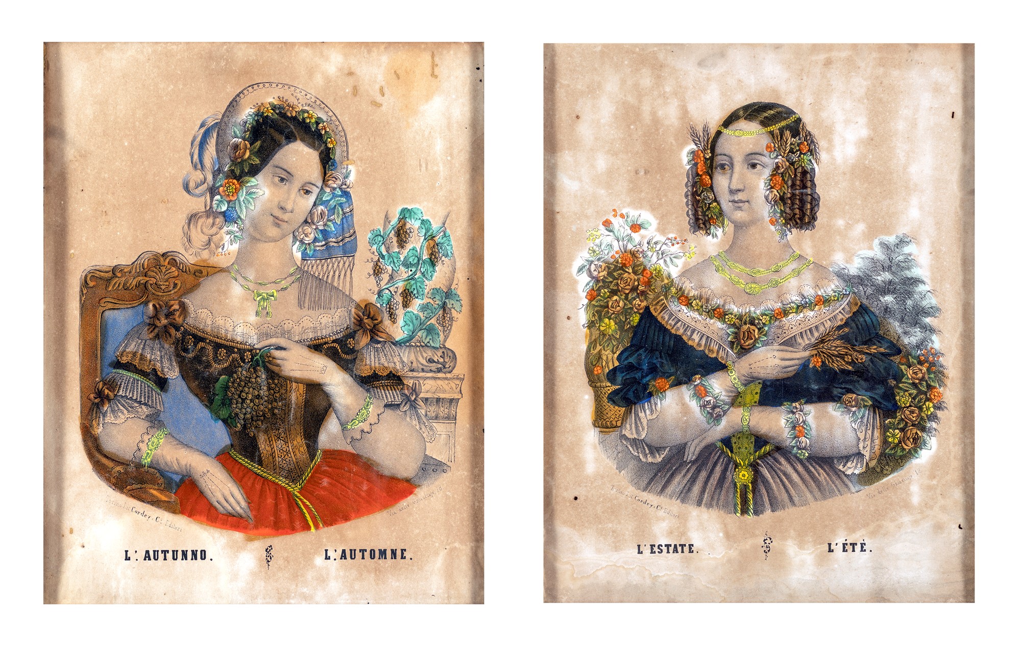 Coppia di litografie colorate, Torino, Cordey, metà XIX secolo - raffiguranti allegoria dell'Estate e dell'Autunno rappresentate da giovani donne ritratte con i rispettivi attributi allegorici. Cornici in legno naturale. - cm 42x35 (con la cornice)