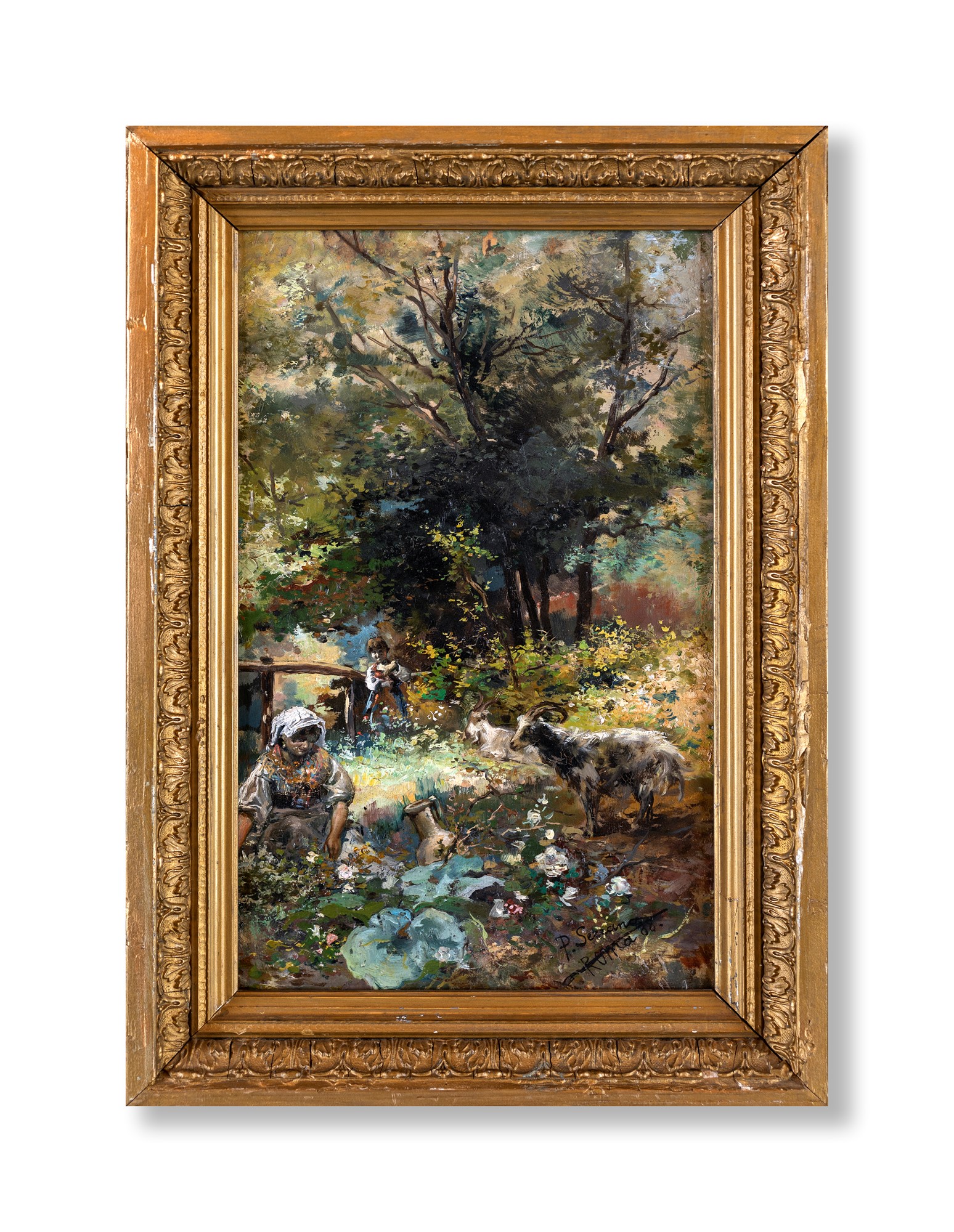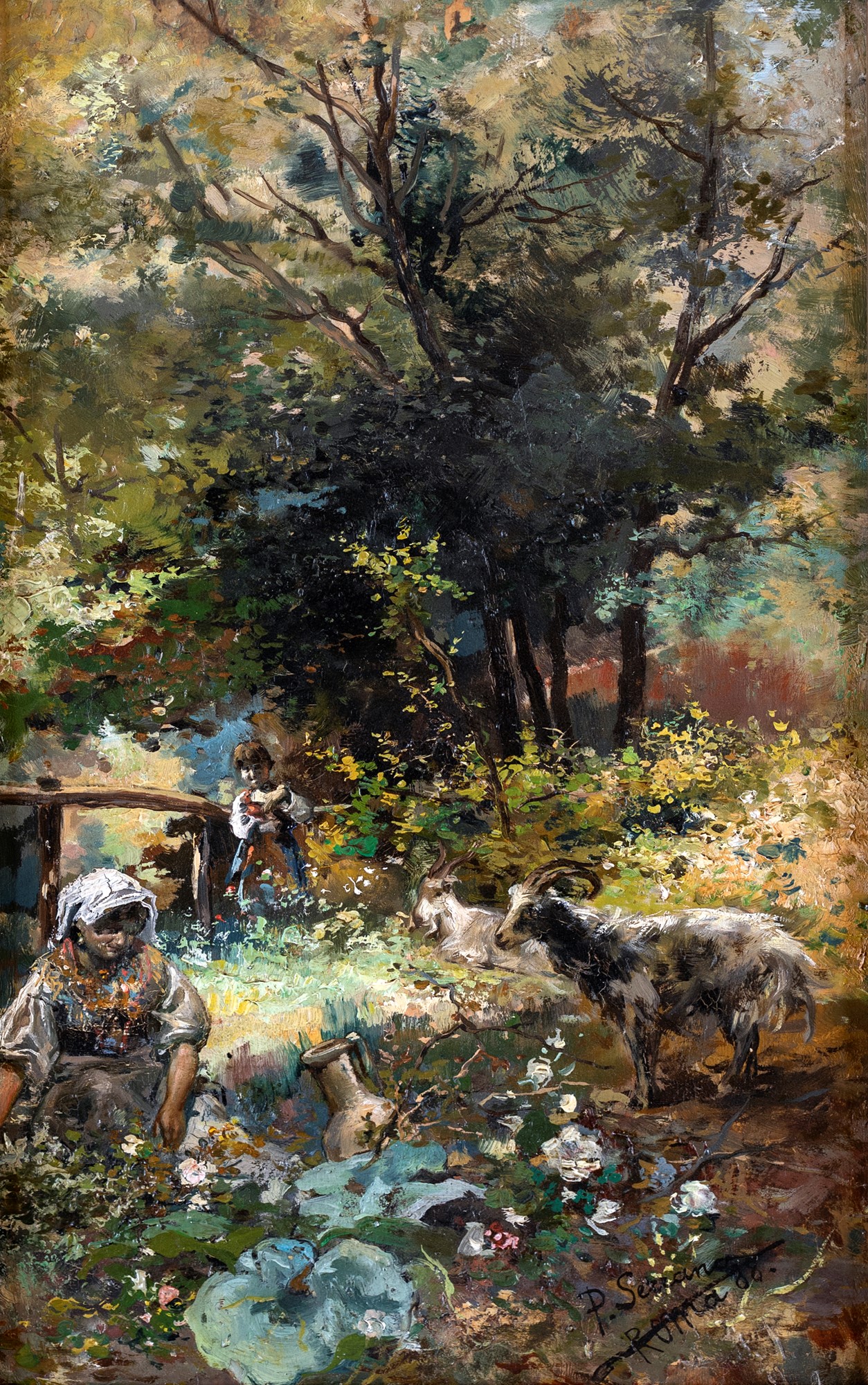 Pittore del XIX secolo - Scorcio di paesaggio con pastorelle e caprette - Firmato e datato in basso a destra: P. Serrano Roma 88 - olio su tela - cm 37x21