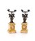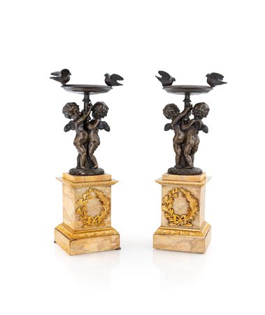 Coppia di alzatine in bronzo brunito, XIX secolo - con vaschetta circolare sormontata da colombi contrapposti, sorretta da due figure di amorino; piedistalli squadrati in marmo giallo - altezza cm 45