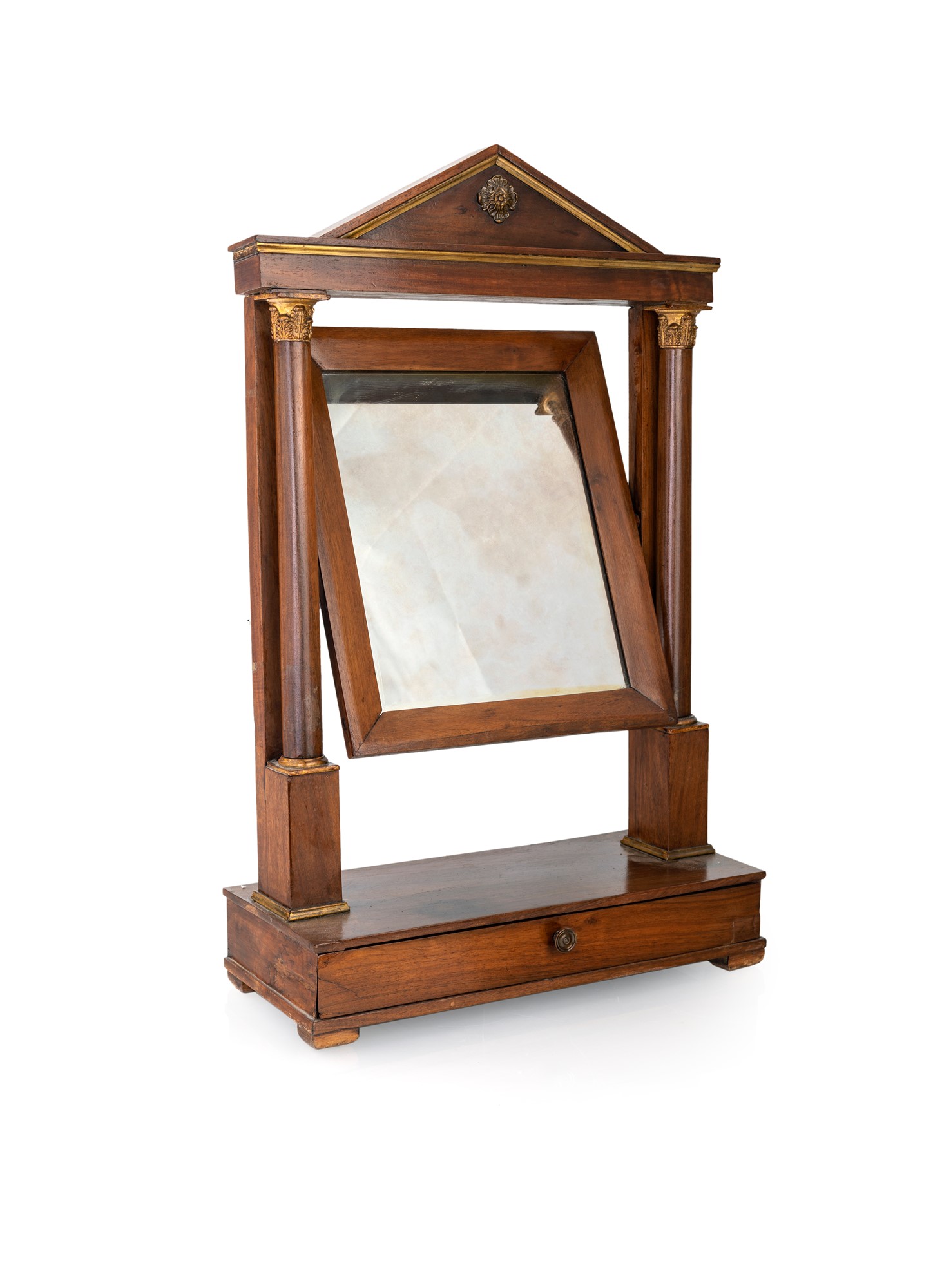 Psiche da toletta in noce, fine XIX secolo - con specchiera sormontata da timpano, sorretta da montanti guarniti con lesene corinzie; base rettangolare con cassetto - cm 68x41x18