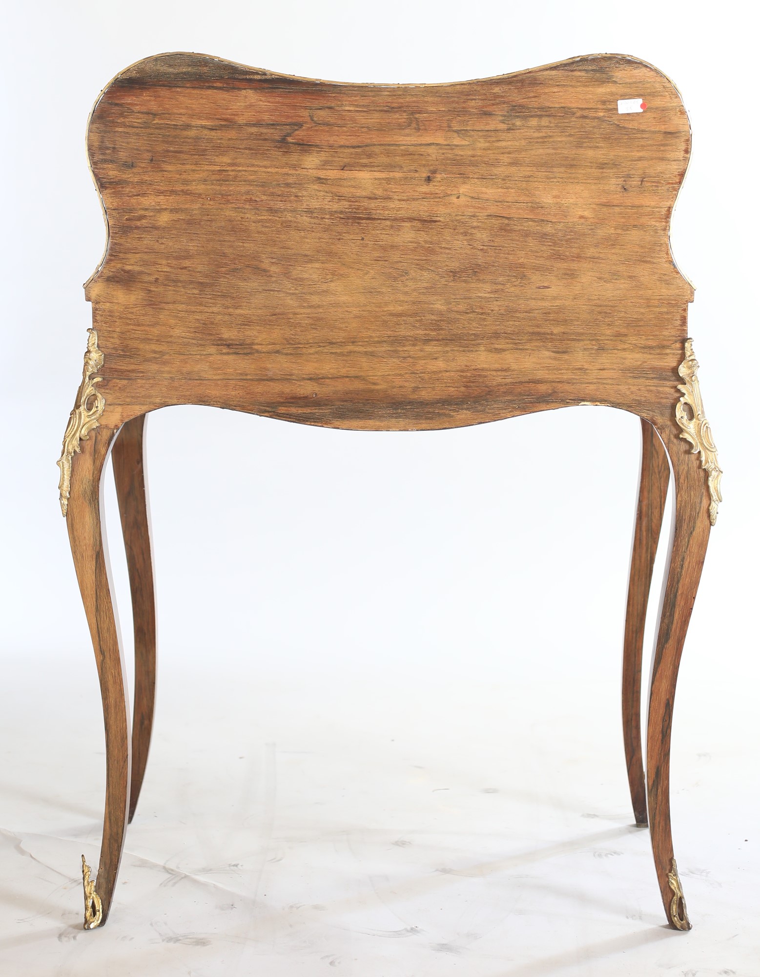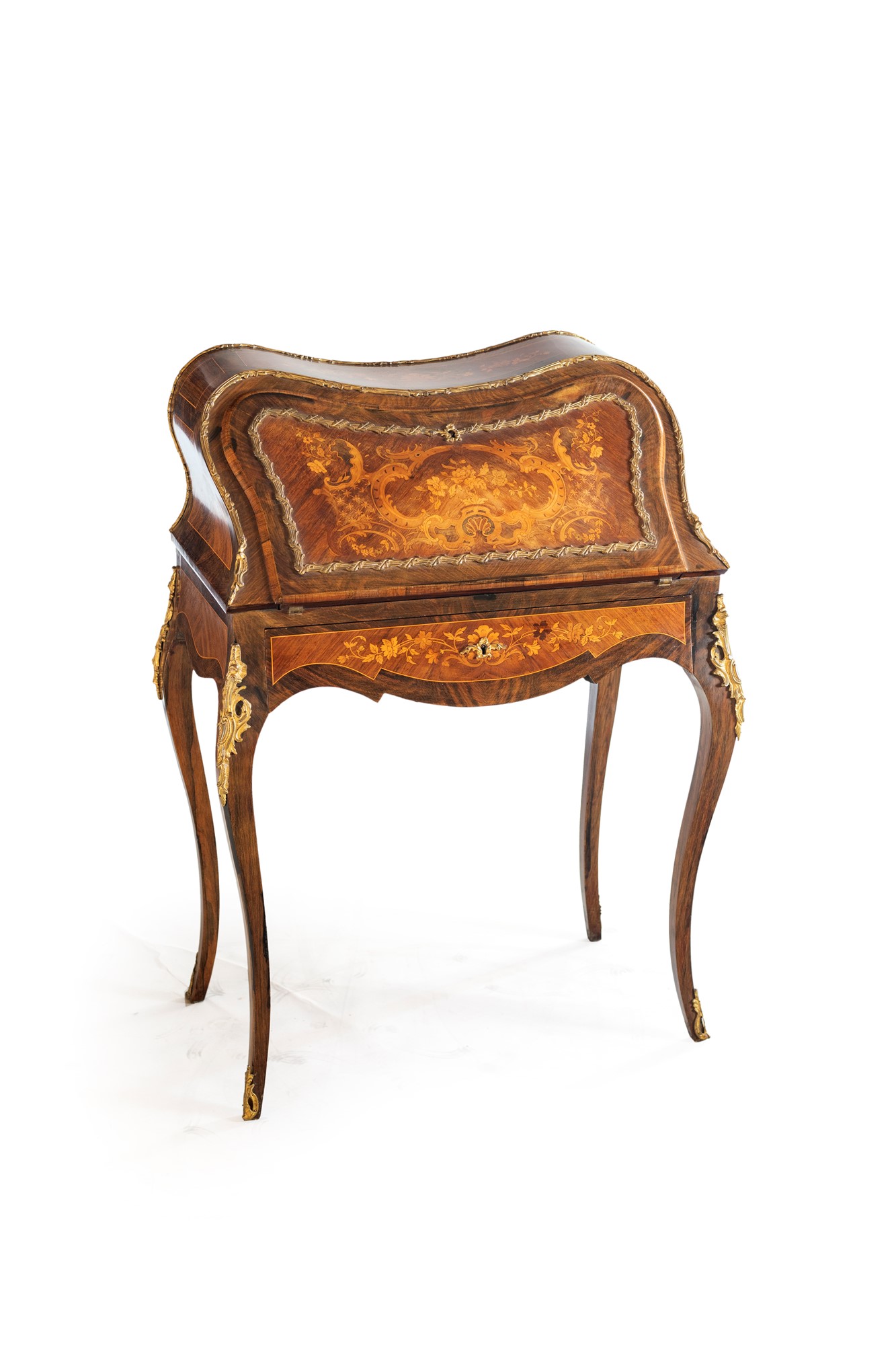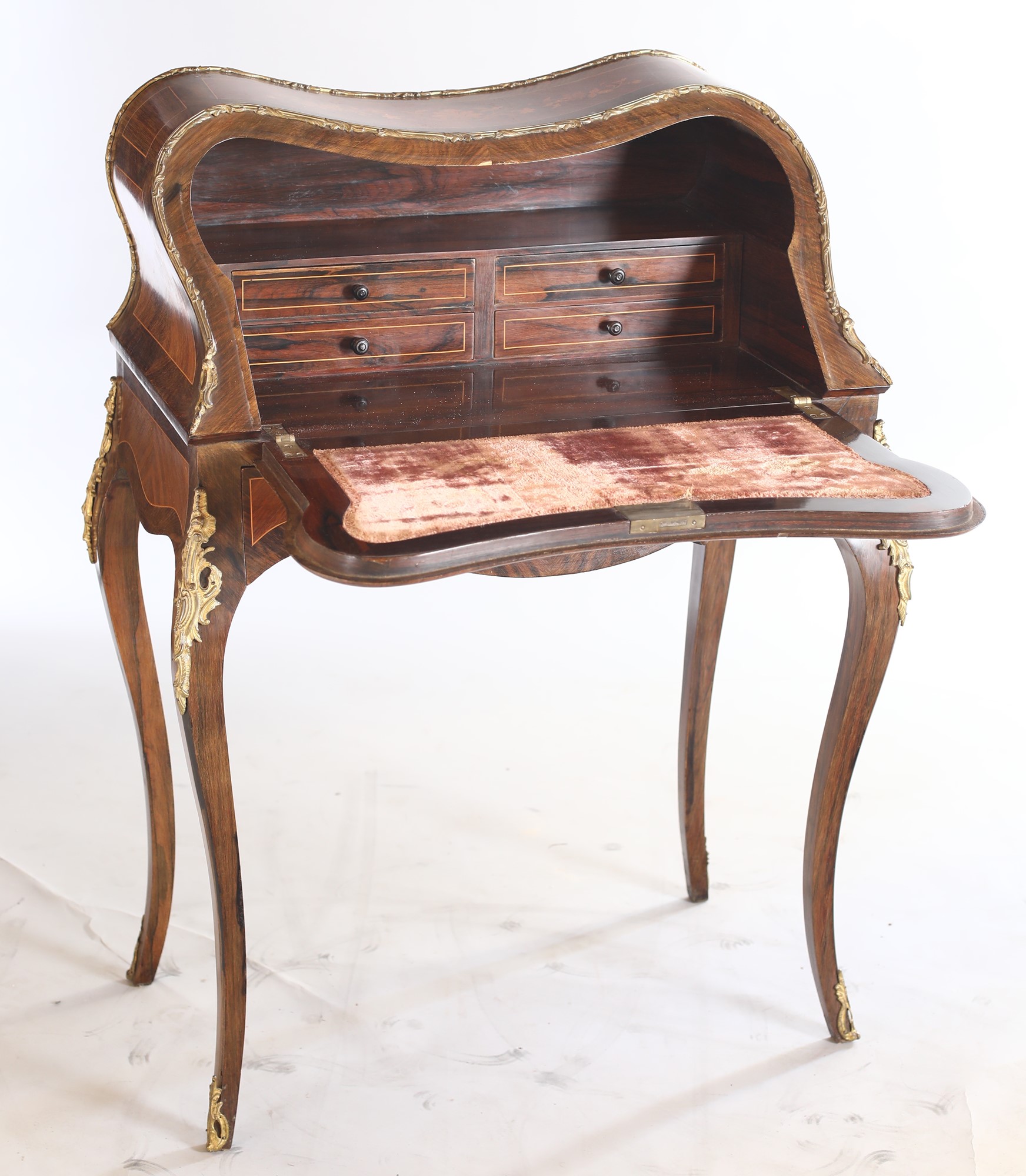 Scrittoio a ribalta da centro, Francia XIX secolo - impiallacciata in palissandro ed ebano viola, con motivi vegetali e fiori intarsiati in legni di frutto entro sottili filettature. Di forma sagomata e bombata rifinita da applicazioni in bronzo dorato, reca un ripiano e quattro tiretti all'interno della ribalta; un cassetto frontale, gambe mosse. - cm 103x70x47