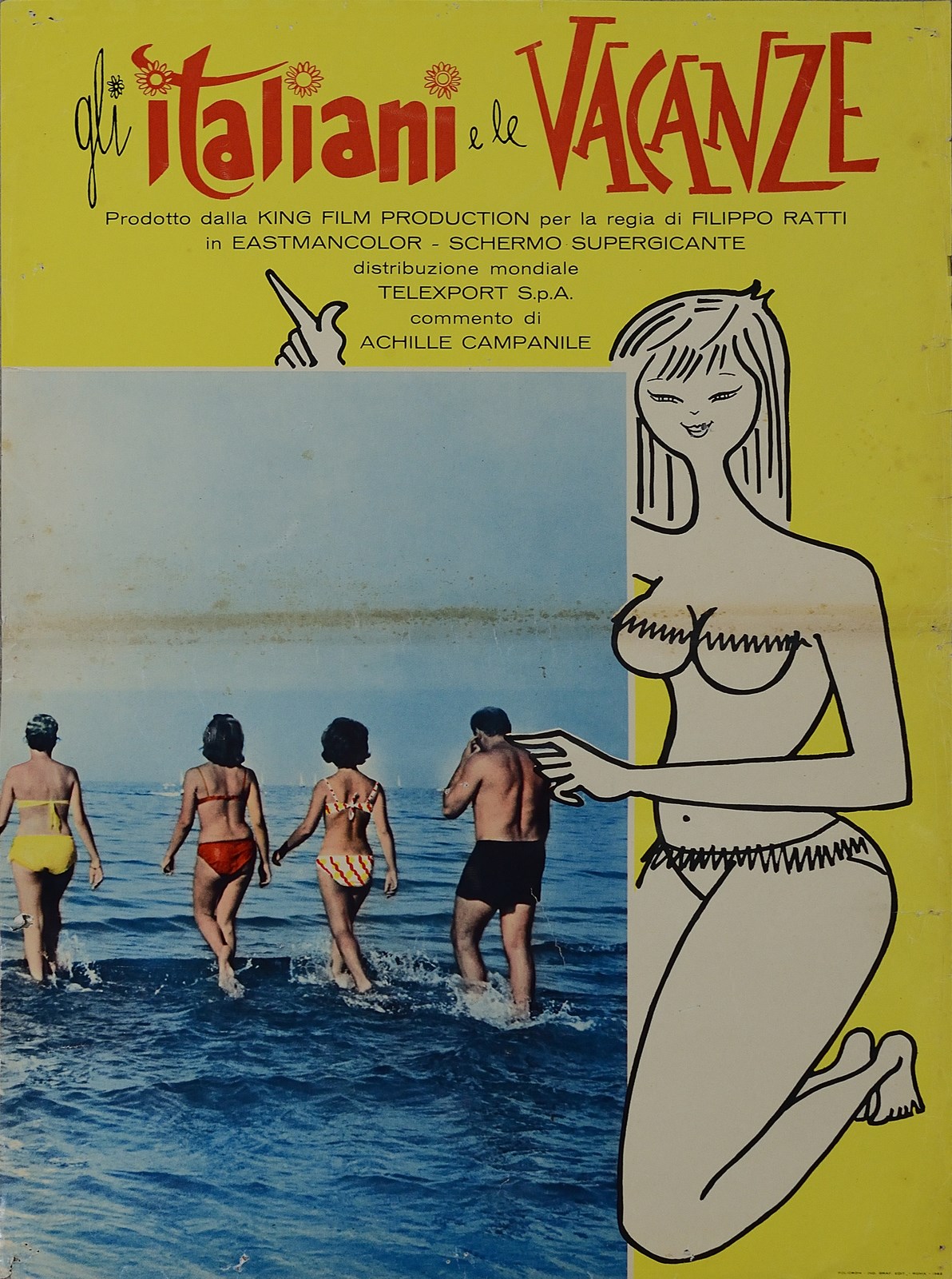 RATTI FILIPPO (1914 - 1981) Gli Italiani e le Vacanze. . 1963. Poster. Cm 46,00 x 65,00. Poster cinematografico originale vintage. Condizione A meno meno.