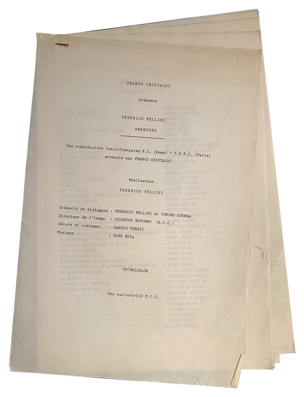 FELLINI FEDERICO (1920 - 1993) Amarcord. 1973. comunicato stampa / sceneggiatura. Cm 20,00 x 30,00. Ciclostile vintage originale del comunicato stampa, edizione francese. P.I.C. Distribuzione. Condizione A.