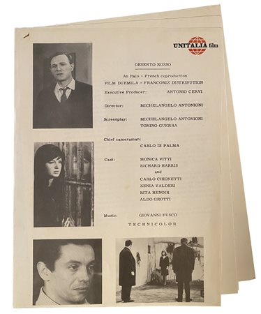 ANTONIONI MICHELANGELO (1912 - 2017) Deserto Rosso. 1964. comunicato stampa / sceneggiatura. Cm 20,00 x 30,00. Ciclostile originale vintage del comunicato stampa, edizione inglese. Unitalia Film. Condizione A.