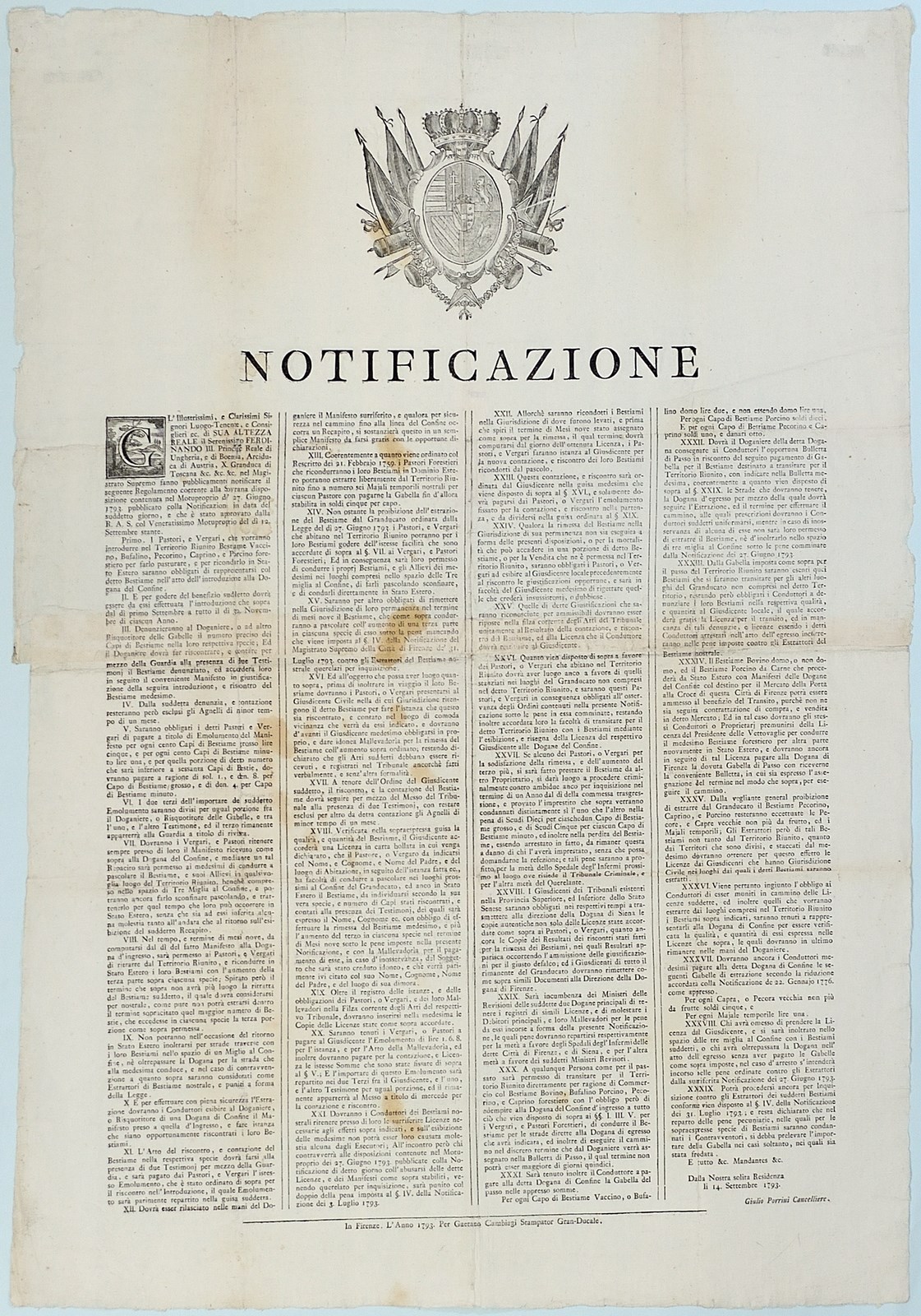 AUTORE NON IDENTIFICATO Notificazione Firenze. 1793. Poster. Cm 57,00 x 80,00. Poster vintage originale. Condizione A.