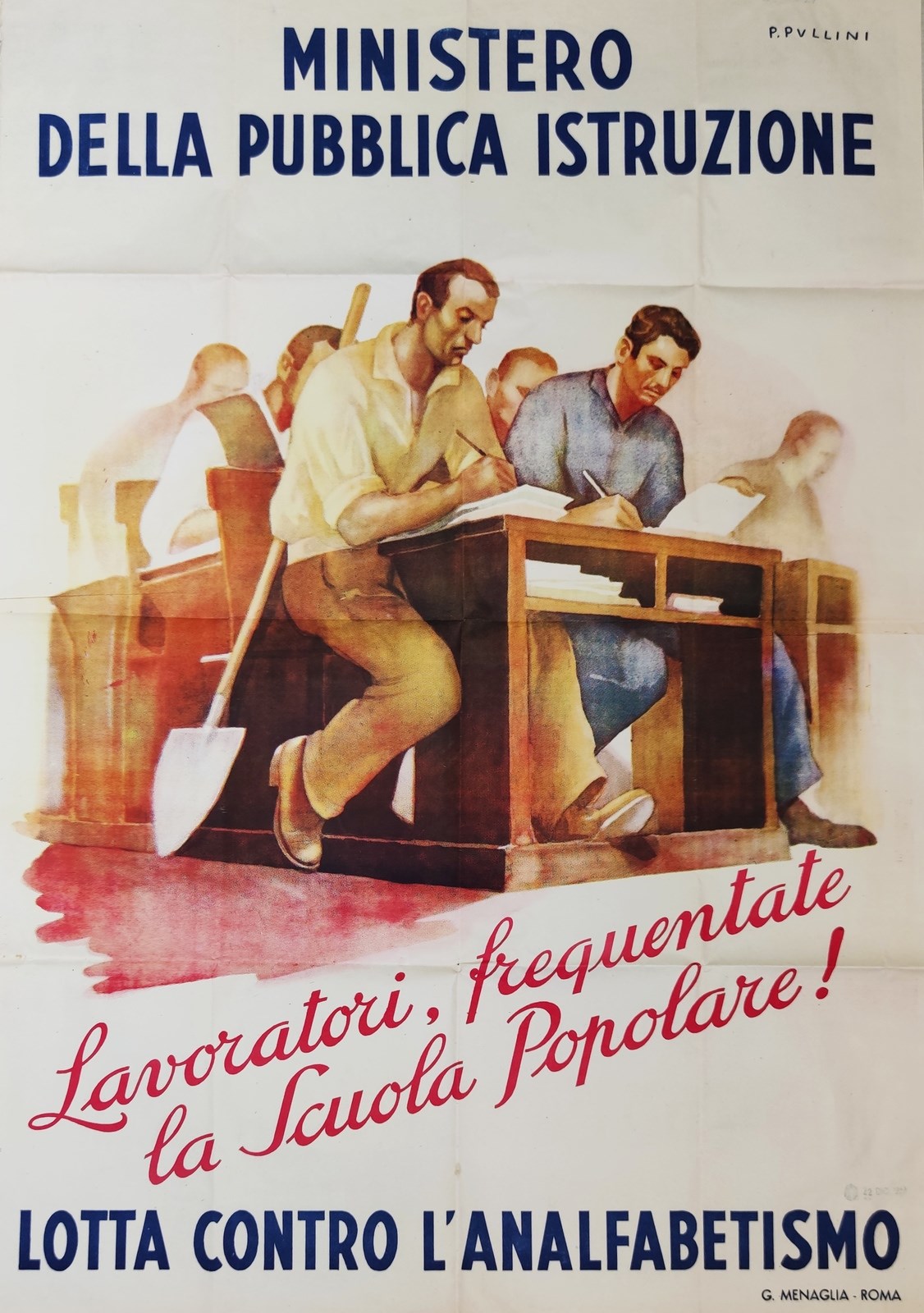 PULLINI PIO (1887 - 1955) Lavoratori, frequentate la scuola popolare!. 1940. Poster. Cm 69,00 x 98,00. Poster vintage originale del Ministero della Pubblica Istruzione per la lotta contro l'analfabetismo. Condizione A.